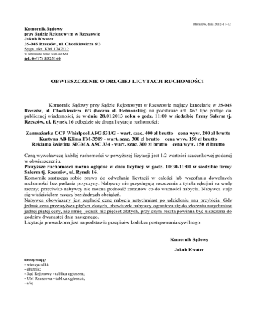 Rzeszów, dnia 2012-11-12 Komornik Sądowy przy Sądzie Rejonowym w Rzeszowie Jakub Kwater 35-045 Rzeszów, ul. Chodkiewicza 6/3 Sygn. akt KM 1747/12 W odpowiedzi podać: sygn. akt KM tel. 0-/17/ 8525140 OBWIESZCZENIE O DRUGIEJ LICYTACJI RUCHOMOŚCI Komornik Sądowy przy Sądzie Rejonowym w Rzeszowie mający kancelarię w 35-045 Rzeszów, ul. Chodkiewicza 6/3 (boczna ul. Hetmańskiej) na podstawie art. 867 kpc podaje do publicznej wiadomości, że w dniu 28.01.2013 roku o godz. 11:00 w siedzibie firmy Salerm tj. Rzeszów, ul. Rynek 16 odbędzie się druga licytacja ruchomości: Zamrażarka CCP Whirlpool AFG 531/G - wart. szac. 400 zł brutto cena wyw. 200 zł brutto Kurtyna AB Klima FM-3509 - wart. szac. 300 zł brutto cena wyw. 150 zł brutto Reklama świetlna SIGMA ASC 334 - wart. szac. 300 zł brutto cena wyw. 150 zł brutto Ceną wywoławczą każdej ruchomości w powyższej licytacji jest 1/2 wartości szacunkowej podanej w obwieszczeniu. Powyższe ruchomości można oglądać w dniu licytacji w godz. 10:30-11:00 w siedzibie firmy Salerm tj. Rzeszów, ul. Rynek 16. Komornik zastrzega sobie prawo do odwołania licytacji w całości lub wycofania dowolnych ruchomości bez podania przyczyny. Nabywcy nie przysługują roszczenia z tytułu rękojmi za wady rzeczy; przeciwko nabywcy nie można podnosić zarzutów co do ważności nabycia. Nabywca staje się właścicielem rzeczy bez żadnych obciążeń. Nabywca obowiązany jest zapłacić cenę nabycia natychmiast po udzieleniu mu przybicia. Gdy jednak cena przewyższa pięćset złotych, obowiązek nabywcy ogranicza się do złożenia natychmiast jednej piątej ceny, nie mniej jednak niż pięćset złotych, przy czym reszta powinna być uiszczona do godziny dwunastej dnia następnego. Licytacja prowadzona jest na podstawie przepisów kodeksu postępowania cywilnego. Komornik Sądowy Jakub Kwater Otrzymują: - wierzycielki; - dłużnik; - Sąd Rejonowy - tablica ogłoszeń; - UM Rzeszowa - tablica ogłoszeń; - a/a;