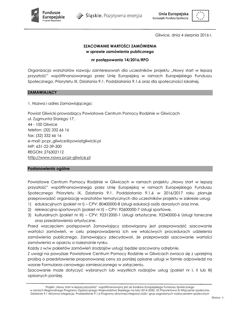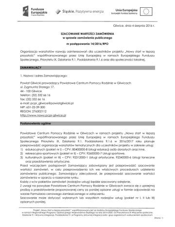 Gliwice, dnia 4 sierpnia 2016 r. SZACOWANIE WARTOŚCI ZAMÓWIENIA w sprawie zamówienia publicznego nr postępowania 14/2016/RPO Organizacja warsztatów rozwoju zainteresowań dla uczestników projektu „Nowy start w lepszą przyszłość” współfinansowanego przez Unię Europejską w ramach Europejskiego Funduszu Społecznego, Priorytetu IX, Działania 9.1. Poddziałania 9.1.6 oraz dla społeczności lokalnej. ZAMAWIAJĄCY 1. Nazwa i adres Zamawiającego: Powiat Gliwicki prowadzący Powiatowe Centrum Pomocy Rodzinie w Gliwicach ul. Zygmunta Starego 17, 44 - 100 Gliwice telefon: (32) 332 66 16 fax: (32) 332 66 16 e-mail: [email protected] NIP: 631-22-39-300 REGON: 276302112 http://www.nowy.pcpr-gliwice.pl Postanowienia ogólne Powiatowe Centrum Pomocy Rodzinie w Gliwicach w ramach projektu „Nowy start w lepszą przyszłość” współfinansowanego przez Unię Europejską w ramach Europejskiego Funduszu Społecznego Priorytetu IX, Działania 9.1. Poddziałania 9.1.6 w 2016/2017 roku planuje przeprowadzić organizację warsztatów tematycznych dla uczestników projektu w zakresie usług: 1) edukacyjnych (pakiet nr I) – CPV: 80400000-8 Usługi edukacji osób dorosłych oraz inne, 2) rekreacyjno-sportowych (pakiet nr II) – CPV: 92600000-7 Usługi sportowe, 3) kulturalnych (pakiet nr III) – CPV: 92312000-1 Usługi artystyczne, 92340000-6 Usługi taneczne oraz przedstawienia artystyczne. Przed wszczęciem postępowań Zamawiający zobowiązany jest przeprowadzić szacowanie wartości zamówień, w celu przeprowadzenia ich we właściwych procedurach udzielenia zamówienia publicznego. Zamawiający zdecydował, że przeprowadzi szacowanie wartości zamówienia w oparciu o rozeznanie rynku. Każdy z w/w pakietów zamówień (rodzajów usług) będzie szacowany odrębnie. Z uwagi na powyższe Powiatowe Centrum Pomocy Rodzinie w Gliwicach zwraca się z uprzejmą prośbą o przedstawienie proponowanej ceny za poniżej opisane usługi w formie odpowiedzi na wzorze Formularza cenowego zamieszczonego w załączeniu. Szacowanie może dotyczyć wybranych lub wszystkich rodzajów usług (pakiet nr I, II lub III) opisanych poniżej. Projekt „Nowy start w lepszą przyszłość” współfinansowany jest ze środków Europejskiego Funduszu Społecznego w ramach Regionalnego Programu Operacyjnego Województwa Śląskiego na lata 2014-2020, Oś Priorytetowa IX Włączenie społeczne, Działanie 9.1 Aktywna integracja, Poddziałanie 9.1.6 Programy aktywnej integracji osób i grup zagrożonych wykluczeniem społecznym Strona -1- I. WARSZTATY EDUKACYJNE 1. WARSZTATY DZIENNIKARSKIE Z ELEMENTAMI AUDIOWIZUALIZACJI (FOTOGRAFIA, FILM) – Część nr 1 1) Zakres tematyczny warsztatów: Trening powinien obejmować następujące minimum tematyczne: a) Podstawy nauki fotografii oraz kręcenia filmów video za pomocą aparatów fotograficznych oraz telefonów typu smartfon, b) Część plenerowa: obejmująca zajęcia z uwieczniania i kadrowania, detali, motywów architektury otoczenia i obrazów życia codziennego. c) Część stacjonarna: obejmująca zajęcia teoretyczne dotyczące zasad, związanych z kadrowaniem, kompozycją, perspektywą, zasadami fotografii reportażowej oraz podstawy nauki edycji zdjęć za pomocą darmowych programów komputerowych i aplikacji dostępnych w smartfonie oraz na komputerze. d) Podstawy dziennikarstwa: podstawowe gatunki, zasady przeprowadzania wywiadu, poprawne budowanie tekstu, sposoby zbierania i dokumentowania materiału dziennikarskiego 2) Termin realizacji: 3) Wymiar godzinowy warsztatu: 20.09.2016 – 15.12.2017 20 godzin edukacyjnych x 7 grup = 140 godzin edukacyjnych 4) Ilość modułów szkoleniowych dla grupy: 5 modułów po 4 godziny edukacyjne 5) Łączna ilość grup : max. 7 grup w tym: Gmina Knurów Gmina Pyskowice, Toszek, Wielowieś ok. 16 osób = 2 grupy ok. 6 os. (Pyskowice), ok. 1 os. (Toszek), ok. 2 os. (Wielowieś) = 1 grupa Gmina Rudziniec Gmina Sośnicowice Gmina Pilchowice Gmina Gierałtowice ok. 11 osób = 1 grupa ok. 1 osoba = 1 grupa ok. 2 osoby = 1 grupa ok. 4 osoby = 1 grupa Łączna max. ilość uczestników: max. 43 osoby 7) Kategorie uczestników: Grupa 1: Osoby pełnosprawne - zgodnie z tabelą stanowiącą załącznik nr 1 Grupa 2: Osoby niepełnosprawne pozostałe - zgodnie z tabelą stanowiącą załącznik nr 1 Grupa 3: Osoby niepełnosprawne intelektualnie – zgodnie z tabelą stanowiącą załącznik nr 1 8) Miejsca realizacji treningów: Projekt „Nowy start w lepszą przyszłość” współfinansowany jest ze środków Europejskiego Funduszu Społecznego w ramach Regionalnego Programu Operacyjnego Województwa Śląskiego na lata 2014-2020, Oś Priorytetowa IX Włączenie społeczne, Działanie 9.1 Aktywna integracja, Poddziałanie 9.1.6 Programy aktywnej integracji osób i grup zagrożonych wykluczeniem społecznym Strona -2- Knurów: Centrum Kultury w Knurowie, ul. Górnicza 1, 44-193 Knurów, Zespół Szkół Zawodowych nr 2 w Knurowie, ul. Szpitalna 29, 44-194 Knurów Pyskowice: Zespół Szkół Specjalnych, ul. Kardynała Stefana Wyszyńskiego 37, 44-120 Pyskowice Gierałtowice: Gminny Ośrodek Kultury, ul. Korfantego 7b, 44-186 Gierałtowice Pilchowice: Gminny Ośrodek Kultury, ul. Karola Miarki 123, 44-189 Wilcza lub Toszek: Szkoła Podstawowa im. Gustawa Morcinka, ul. Wilkowicka 2, 44-180 Toszek Rudziniec: Sala Spotkań, ul. Opolska 8, 44-160 Rudziniec Sośnicowice: Gimnazjum im. Unii Europejskiej, ul. Gimnazjalna 6, 44-153 Sośnicowice Miejsca realizacji warsztatów są dostosowane do potrzeb osób niepełnosprawnych. Wskazane miejsca realizacji mogą ulec zmianie. 9) Wymagania wobec prowadzących: Na każdą grupę szkoleniową wymagany jest: a) min. 1 trener prowadzący, posiadający doświadczenie w pracy fotograficzno – filmowej potwierdzone sporządzeniem min. jednej sesji fotograficznej oraz nakręceniem 1 filmu/ klipu/ teledysku opublikowanego w mediach, b) min. 1 trener prowadzący, posiadający min. 1 rok