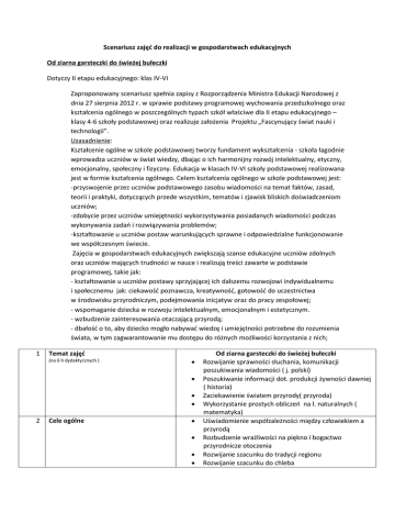 Scenariusz zajęć do realizacji w gospodarstwach edukacyjnych Od ziarna garsteczki do świeżej bułeczki Dotyczy II etapu edukacyjnego: klas IV-VI Zaproponowany scenariusz spełnia zapisy z Rozporządzenia Ministra Edukacji Narodowej z dnia 27 sierpnia 2012 r. w sprawie podstawy programowej wychowania przedszkolnego oraz kształcenia ogólnego w poszczególnych typach szkół właściwe dla II etapu edukacyjnego – klasy 4-6 szkoły podstawowej oraz realizuje założenia Projektu „Fascynujący świat nauki i technologii”. Uzasadnienie: Kształcenie ogólne w szkole podstawowej tworzy fundament wykształcenia - szkoła łagodnie wprowadza uczniów w świat wiedzy, dbając o ich harmonijny rozwój intelektualny, etyczny, emocjonalny, społeczny i fizyczny. Edukacja w klasach IV-VI szkoły podstawowej realizowana jest w formie kształcenia ogólnego. Celem kształcenia ogólnego w szkole podstawowej jest: -przyswojenie przez uczniów podstawowego zasobu wiadomości na temat faktów, zasad, teorii i praktyki, dotyczących przede wszystkim, tematów i zjawisk bliskich doświadczeniom uczniów; -zdobycie przez uczniów umiejętności wykorzystywania posiadanych wiadomości podczas wykonywania zadań i rozwiązywania problemów; -kształtowanie u uczniów postaw warunkujących sprawne i odpowiedzialne funkcjonowanie we współczesnym świecie. Zajęcia w gospodarstwach edukacyjnych zwiększają szanse edukacyjne uczniów zdolnych oraz uczniów mających trudności w nauce i realizują treści zawarte w podstawie programowej, takie jak: - kształtowanie u uczniów postawy sprzyjającej ich dalszemu rozwojowi indywidualnemu i społecznemu jak: ciekawość poznawcza, kreatywność, gotowość do uczestnictwa w środowisku przyrodniczym, podejmowania inicjatyw oraz do pracy zespołowej; - wspomaganie dziecka w rozwoju intelektualnym, emocjonalnym i estetycznym. - wzbudzenie zainteresowania otaczającą przyrodą; - dbałość o to, aby dziecko mogło nabywać wiedzę i umiejętności potrzebne do rozumienia świata, w tym zagwarantowanie mu dostępu do różnych możliwości korzystania z nich; 1 Temat zajęć (na 6 h dydaktycznych ) 2 Cele ogólne Od ziarna garsteczki do świeżej bułeczki Rozwijanie sprawności słuchania, komunikacji poszukiwania wiadomości ( j. polski) Poszukiwanie informacji dot. produkcji żywności dawniej ( historia) Zaciekawienie światem przyrody( przyroda) Wykorzystanie prostych obliczeń na l. naturalnych ( matematyka) Uświadomienie współzależności między człowiekiem a przyrodą Rozbudzenie wrażliwości na piękno i bogactwo przyrodnicze otoczenia Rozwijanie szacunku do tradycji regionu Rozwijanie szacunku do chleba 3 Cele szczegółowe (określające umiejętności uczniów jakie nabędą w ramach zajęć) 4 Metody i techniki pracy-służące osiągnięciu efektów opisanych w celach szczegółowych 5 Materiały dydaktyczne oraz środki (itp. Prezentacje, teksty, karty pracy, słuchowiska, filmy, nagrania itp.) 6 Przebieg zajęć Opis, jak powinny wyglądać warsztaty-może być np. z podziałem na wstęp, część główną i końcową. Powinien zawierać takie elementy jak: - sformułowanie problemu, - zmotywowanie do pracy nad jego rozwiązaniem z pomocą różnorodnych metod i technik pracy (im bardziej zróżnicowane zadania, tym lepsze efekty kształcenia) ukierunkowanych na odkrywanie, przeżywanie, analizowanie, dociekanie, dyskusję, zabawę, doświadczenie, eksperyment… - rozwiązanie problemu - wspólne podsumowanie zajęć - końcowe uznanie wspólnych osiągnięć Kształtowanie odpowiedzialności aktywnych postaw społeczeństwa wobec środowiska zwierzęcego i roślinnego Uczniowie : potrafią rozpoznać rodzaje zbóż, mąki, kaszy znają dawne zwyczaje związane z produkcją chleba znają sprzęt i narzędzia rolnicze dawniej i dziś potrafią opowiedzieć o pracy rolnika, piekarza potrafią wykonać ciasto chlebowe znają zasady bezpiecznego obcowania z naturą oraz zachowania się w polu i na łące znają tradycje i obrzędy zw. z zakończeniem zbiorów rozwijają umiejętność pracy w grupie wyrabiają w sobie nawyk dbania o środowisko lokalne pogadanka nauka piosenki zabawa ruchowa zajęcia plastyczne aktywizująca oglądowa Forma pracy zbiorowa i grupowa kłosy zbóż, ziarna , kasze, mąki ekspozycja narzędzi i sprzętu rolniczego rekwizyty do inscenizacji bajki rekwizyty do gier i zabaw ruchowych karty pracy I. Wstęp - powitanie uczniów, omówienie zasad bezpieczeństwa i zachowania podczas zajęć -przedstawienie planu zajęć II. Faza realizacji: zajęcia w Sali edukacyjnejPogadanka wstępna nt -rodzajów zbóż, mąki i kaszy -narzędzi i sprzętu rolniczego dawniej i dziś Udział uczniów w inscenizacji bajki „ Skąd się bierze chleb” -samodzielne przygotowanie ciasta chlebowego(zróżnicowane zadania dostoswane do indywidualnych możliwości uczniów) Formowanie ciasta i ozdabianie - nauka piosenki „Chlebusie” - zwiedzenie gospodarstwa (łąka, zwierzęta..) w czasie wypieku ciasta -rozpoznanie upieczonych chlebków - degustacja wypieków -poznanie tradycji i obrzędów związanych z zakończeniem zbiorów, wypiekiem chleba - samodzielne wykonanie przez uczniów koszyczków na chlebki (zróżnicowane zadania dostoswane do indywidualnych możliwości uczniów) 7 Opis treści podstawy programowej realizowanych w ramach zajęć (z rozróżnieniem na przedmioty humanistyczne, matematyczno-przyrodnicze, uczniów zdolnych oraz uczniów z dysfunkcjami /trudnościami w nauce, a także uczniów o specjalnych potrzebach edukacyjnych) - zabawy ruchowe związane tematycznie z wsią, rolnictwem, III. Faza końcowa - wnioski, próba zdefiniowania poznanych pojęć i zagadnień - wypełnienie ankiet ewaluacyjnych - pożegnanie JĘZYK POLSKI Odbiór wypowiedzi i wykorzystanie zawartych w nich informacji. Uczeń rozwija sprawność uważnego słuchania, umiejętność rozumienia znaczeń dosłownych i prostych znaczeń prz