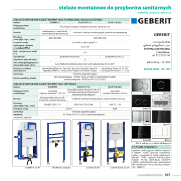 stelaże montażowe do przyborów sanitarnych materiały sanitarne i grzewcze STELAŻE PODTYNKOWE GEBERIT DO MONTAŻU PODWIESZANEJ MUSZLI USTĘPOWEJ Nazwa Rodzaj przyboru sanitarnego KOMBIFIX DUOFIX H112 DUOFIX BASIC WC (muszla wisząca o rozstawie otworów 18 lub 23 cm) Montaż Wymiary (szer./głęb./wys.) [mm] Przyłącze wody Wymagane ciśnienie w instalacji [MPa] na masywnej ścianie do obmurowania lub zamurowania w lekkich ściankach instalacyjnych, przed ścianką masywną 425/120/1090 500/120/1120 na środku z tyłu/u góry R ½” 0,02-1,00 Maks. temperatura wody [oC] Typ spłuczki Pojemność spłuczki [dm3] Ilość wody spłukującej (ustawienia fabryczne) [dm3] +25 podtynkowa (SIGMA) podtynkowa (DELTA) GEBERIT www.geberit.pl [email protected] informacja techniczna i handlowa: tel. 22 376 01 00 7,5 6/3; możliwość zredukowania ilości wody spłukiwanej do 4/2 dm3 Rodzaj przycisków spłukujących Gwarancja dwudzielny (Sigma01, Sigma20, Sigma50, Sigma60, Sigma70, dwudzielny (Delta 20, 21, 50), Sigma80, Bolero), z funkcją STOP (Sigma10, Mambo, Tango) z funkcją STOP (Delta 11, 15, 40) 10 lat (na wszystkie części) zbiorniki spłukujące – PN-EN 14055, AH PZH nr HK/W/0836/01/2009; rama montażowa – AT ITB nr AT-15-7737/2011 Normy, aprobaty, atesty adres firmy – str. 324 zobacz także – str. 156 STELAŻE PODTYNKOWE GEBERIT DO MONTAŻU UMYWALEK Nazwa KOMBIFIX Rodzaj przyboru sanitarnego umywalka (rozstaw otworów 17-28 cm) Montaż na masywnej ścianie, do obmurowania lub zamurowania Wymiary (szer./głęb./wys.) [mm] Przyłącze wody Gwarancja Aprobaty * możliwość regulacji DUOFIX H112 umywalka (rozstaw otworów 5-38 cm) do baterii ściennych podtynkowych, natynkowych lub stojących 350/(80-190)*/335 DUOFIX BASIC umywalka (rozstaw otworów 5-38 cm) Sigma01 Sigma10 Sigma20 Sigma50 Sigma60 Sigma70 Sigma80 Bolero w lekkich ściankach instalacyjnych, przed ścianką masywną 500/110/(1120-1300) 500/75/1120 2 x R ½” 10 lat (na wszystkie części) AT ITB nr AT-15-7737/2011 (rama montażowa) brak Różne rodzaje przycisków spłukujących POZOSTAŁE PRODUKTY KOMBIFIX do WC DUOFIX do umywalki DUOFIX do WC DUOFIX BASIC do WC systemy wodociągowe Geberit Mapress i Geberit Mepla; spłuczki natynkowe, syfony, wyposażenie toalet publicznych Geberit Public; systemy kanalizacyjne: Geberit PE-HD, Silent-db20, Silent-PP; system podciśnieniowego odwadniania dachów Geberit Pluvia, wpusty podłogowe i odpływy KATALOG INŻYNIERA 2013/2014 167