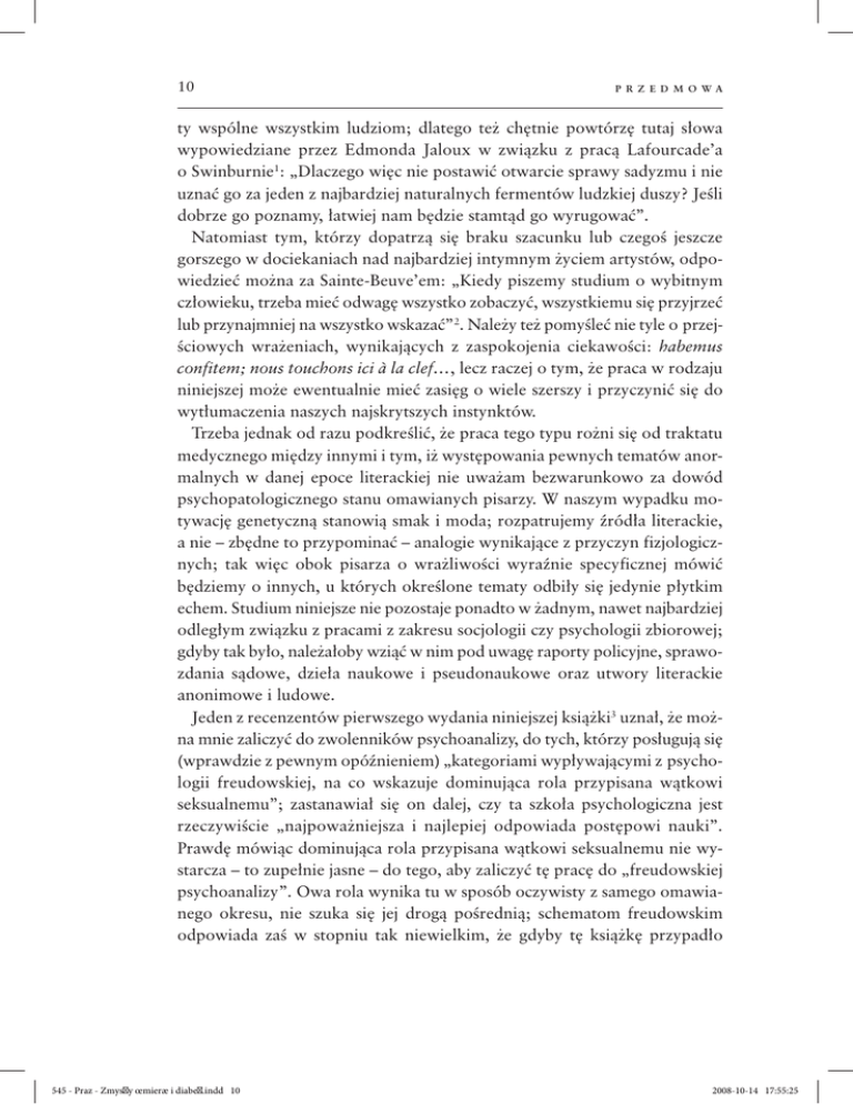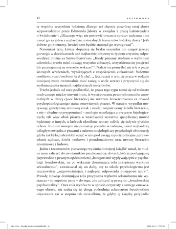 10 P R Z E D M O WA ty wspólne wszystkim ludziom; dlatego też chętnie powtórzę tutaj słowa wypowiedziane przez Edmonda Jaloux w związku z pracą Lafourcade’a o Swinburnie1: „Dlaczego więc nie postawić otwarcie sprawy sadyzmu i nie uznać go za jeden z najbardziej naturalnych fermentów ludzkiej duszy? Jeśli dobrze go poznamy, łatwiej nam będzie stamtąd go wyrugować”. Natomiast tym, którzy dopatrzą się braku szacunku lub czegoś jeszcze gorszego w dociekaniach nad najbardziej intymnym życiem artystów, odpowiedzieć można za Sainte-Beuve’em: „Kiedy piszemy studium o wybitnym człowieku, trzeba mieć odwagę wszystko zobaczyć, wszystkiemu się przyjrzeć lub przynajmniej na wszystko wskazać” 2. Należy też pomyśleć nie tyle o przejściowych wrażeniach, wynikających z zaspokojenia ciekawości: habemus confitem; nous touchons ici à la clef…, lecz raczej o tym, że praca w rodzaju niniejszej może ewentualnie mieć zasięg o wiele szerszy i przyczynić się do wytłumaczenia naszych najskrytszych instynktów. Trzeba jednak od razu podkreślić, że praca tego typu rożni się od traktatu medycznego między innymi i tym, iż występowania pewnych tematów anormalnych w danej epoce literackiej nie uważam bezwarunkowo za dowód psychopatologicznego stanu omawianych pisarzy. W naszym wypadku motywację genetyczną stanowią smak i moda; rozpatrujemy źródła literackie, a nie – zbędne to przypominać – analogie wynikające z przyczyn fizjologicznych; tak więc obok pisarza o wrażliwości wyraźnie specyficznej mówić będziemy o innych, u których określone tematy odbiły się jedynie płytkim echem. Studium niniejsze nie pozostaje ponadto w żadnym, nawet najbardziej odległym związku z pracami z zakresu socjologii czy psychologii zbiorowej; gdyby tak było, należałoby wziąć w nim pod uwagę raporty policyjne, sprawozdania sądowe, dzieła naukowe i pseudonaukowe oraz utwory literackie anonimowe i ludowe. Jeden z recenzentów pierwszego wydania niniejszej książki3 uznał, że można mnie zaliczyć do zwolenników psychoanalizy, do tych, którzy posługują się (wprawdzie z pewnym opóźnieniem) „kategoriami wypływającymi z psychologii freudowskiej, na co wskazuje dominująca rola przypisana wątkowi seksualnemu”; zastanawiał się on dalej, czy ta szkoła psychologiczna jest rzeczywiście „najpoważniejsza i najlepiej odpowiada postępowi nauki”. Prawdę mówiąc dominująca rola przypisana wątkowi seksualnemu nie wystarcza – to zupełnie jasne – do tego, aby zaliczyć tę pracę do „freudowskiej psychoanalizy”. Owa rola wynika tu w sposób oczywisty z samego omawianego okresu, nie szuka się jej drogą pośrednią; schematom freudowskim odpowiada zaś w stopniu tak niewielkim, że gdyby tę książkę przypadło 545 - Praz - Zmys y œmieræ i diabe .indd 10 2008-10-14 17:55:25 11 P R Z E D M O WA sądzić psychoanalitykowi, nazwałby on ją powierzchowną i opartą na postrzeżeniach, które każdy potrafi uczynić. Psychoanaliza, recenzentowi temu znana zapewne tylko ze słyszenia (podobnie jak ze słyszenia tylko znany mu był Gilles de Rais, którego wziął za francuskiego pisarza i postawił obok d’Aurevilly’ego i de l’Isle-Adama), jest czymś zupełnie innym; nie wiem doprawdy, co wspólnego mogłaby mieć niniejsza książka na przykład ze studium Freuda o obłędzie i snach Gradiva W. Jensena czy z dwoma tomami o Poem pióra Marii Bonaparte 4. Markiz de Sade, w którym Sainte-Beuve widział „jednego z największych inspiratorów pisarzy nowoczesnych”, będzie często wspominany na tych stronicach. Trzeba jednak tutaj od razu przestrzec już nie przed wiekową klątwą, ciążącą nad autorem Justine (byłoby to konieczne jeszcze kilka lat temu), lecz przed reakcją na nią, która zarysowuje się ostatnio w pewnych kołach literackich we Francji. Nawet najbardziej pobieżna lektura niniejszej książki przekona czytelnika, że twórczość Sade’a jest pomnikiem czegoś – choć niekoniecznie „myśli ludzkiej”, jak zechciał określić to Apollinaire. Kto jednak w świetle, które dorobek ten rzuca na najniższe impulsy człowieka-zwierzęcia, widzi wystarczający powód, aby jego autora okrzyknąć oryginalnym myślicielem lub wręcz geniuszem, ten zasługuje na wybaczenie tylko wówczas, gdy weźmiemy pod uwagę jego niewiedzę i chwilowe zaślepienie. W swym wstępie do niedawnego wydania rękopisu Infortunes de la vertu, Maurice Heine oświadcza co następuje: „Koalicja interesów, które, aby lepiej je zamaskować, nazywa się zwykle moralnymi lub duchowymi, prowadzi od stulecia za pomocą wszelkich sił represyjnych bezustanną wojnę z myślą genialnego człowieka. Cel, który sobie postawiła, nie został osiągnięty i nigdy nie będzie osiągnięty. Nie ulega wątpliwości, że wprost katastrofalne są straty, jakie poniósł skarbiec myśli ludzkiej wskutek zniszczenia wielu rękopisów, Jednakże zbawienny bunt, wywołany i podtrzymywany w wolnych umysłach przez tak odrażające prześladowania, doprowadził do tego, że imię Sade’a wywołuje obecnie zainteresowanie i sympatię we Francji i za granicą […] Należy przypuszczać, że Sade, który wywołał niepokój całego stulecia nie mogącego go czytać, będzie coraz więcej czytany, aby zapobiec niepokojom wieku następnego”. A Jean Paulhan, w zamieszczonej w „Nouvelle Revue Française” z września 1930 roku recenzji wydanego przez Heinego tomu, nazywa Sade’a „pisarzem, którego trzeba zaliczyć do największych” i dostrzega w jego twórczości walory stylistyczne. Entuzjazmowi z jakim odnoszą się od niedawna do Sade’a 545 - Praz - Zmys y œmieræ i diabe .indd 11 2008-10-14 17:55:25