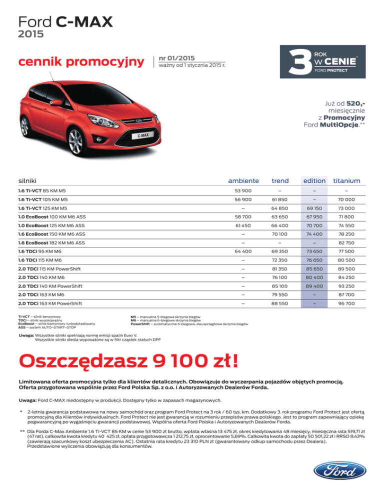 Ford C-MAX 2015 cennik promocyjny nr 01/2015 ważny od 1 stycznia 2015 r. Już od 520,miesięcznie z Promocyjny Ford MultiOpcje.** silniki ambiente trend edition titanium 1.6 Ti-VCT 85 KM M5 53 900 – – – 1.6 Ti-VCT 105 KM M5 56 900 61 850 – 70 000 1.6 Ti-VCT 125 KM M5 – 64 850 69 150 73 000 1.0 EcoBoost 100 KM M6 ASS 58 700 63 650 67 950 71 800 1.0 EcoBoost 125 KM M6 ASS 61 450 66 400 70 700 74 550 1.6 EcoBoost 150 KM M6 ASS – 70 100 74 400 78 250 1.6 EcoBoost 182 KM M6 ASS – – – 82 750 1.6 TDCi 95 KM M6 64 400 69 350 73 650 77 500 1.6 TDCi 115 KM M6 – 72 350 76 650 80 500 2.0 TDCi 115 KM PowerShift – 81 350 85 650 89 500 2.0 TDCi 140 KM M6 – 76 100 80 400 84 250 2.0 TDCi 140 KM PowerShift – 85 100 89 400 93 250 2.0 TDCi 163 KM M6 – 79 550 – 87 700 2.0 TDCi 163 KM PowerShift – 88 550 – 96 700 Ti-VCT – silnik benzynowy TDCi – silnik wysokoprężny EcoBoost – silnik beznynowy turbodoładowany ASS – system AUTO–START–STOP M5 – manualna 5-biegowa skrzynia biegów M6 – manualna 6-biegowa skrzynia biegów PowerShift – automatyczna 6-biegowa, dwusprzęgłowa skrzynia biegów Uwaga: Wszystkie silniki spełniają normę emisji spalin Euro V. Wszystkie silniki diesla wyposażone są w filtr cząstek stałych DPF Oszczędzasz 9 100 zł! Limitowana oferta promocyjna tylko dla klientów detalicznych. Obowiązuje do wyczerpania pojazdów objętych promocją. Oferta przygotowana wspólnie przez Ford Polska Sp. z o.o. i Autoryzowanych Dealerów Forda. Uwaga: Ford C-MAX niedostępny w produkcji. Dostępny tylko w zapasach magazynowych. * 2-letnia gwarancja podstawowa na nowy samochód oraz program Ford Protect na 3 rok / 60 tys. km. Dodatkowy 3. rok programu Ford Protect jest ofertą promocyjną dla Klientów indywidualnych. Ford Protect nie jest gwarancją w rozumieniu przepisów prawa polskiego. Jest to program zapewniający opiekę pogwarancyjną po wygaśnięciu gwarancji podstawowej. Wspólna oferta Ford Polska i Autoryzowanych Dealerów Forda. ** Dla Forda C-Max Ambiente 1.6 Ti-VCT 85 KM w cenie 53 900 zł brutto, wpłata własna 13 475 zł, okres kredytowania 48 miesięcy, miesięczna rata 519,71 zł (47 rat), całkowita kwota kredytu 40 425 zł, opłata przygotowawcza 1 212,75 zł, oprocentowanie 5,69%. Całkowita kwota do zapłaty 50 501,22 zł i RRSO 8,43% (zawierają szacunkowy koszt ubezpieczenia AC). Ostatnia rata kredytu 23 310 PLN zł (gwarantowany odkup samochodu przez Dealera). Przedstawione wyliczenia obowiązują dla konsumentów. Ford C-MAX 2015 bezpieczeństwo Inteligentny System Bezpieczeństwa – (IPS) System ABS – z elektronicznym układem podziału siły hamowania (EBD) Elektroniczny układ stabilizacji toru jazdy (ESC) – z układem kontroli trakcji (TA), układem wspomagania awaryjnego hamowania (EBA) oraz układem poprawiającym stabilność na zakrętach (TVC) Zaawansowany układ ESC – elektroniczny układ satbilizacji toru jazdy (ESC) z układem kontroli trakcji (TA), układem wspomagania awaryjnego hamowania (EBA), układem poprawiającym stabilność na zakrętach (TVC) oraz układem ułatwiajacym ruszanie na wzniesieniach (HSA) (standard z przekładnią automatyczną PowerShift) Światła awaryjnego hamowania – błyskające światła STOP podczas gwałtownego hamowania Poduszki powietrzne – poduszki czołowe dla kierowcy i pasażera z przodu Poduszki powietrzne – poduszki boczne dla kierowcy i pasażera z przodu Poduszki powietrzne – boczne kurtyny powietrzne chroniące osoby w 1. i 2. rzędzie siedzeń System zapobiegający kolizjom przy małych prędkościach (ACS) (zawiera podgrzewaną przednią szybę) System wspomagający utrzymanie pojazdu na pasie ruchu (LKA) (zawiera: system zapobiegający kolizjom przy małych prędkościach (ACS), system rozpoznawania znaków drogowych, system monitorowania koncentracji kierowcy, system automatycznej zmiany świateł drogowych na mijania, podgrzewaną przednią szybę, przednie światła przeciwmgielne, automatycznie sterowane wycieraczki z czujnikiem deszczu, automatycznie ściemniające się lusterko wsteczne) System monitorowania martwego pola widzenia w lusterkach (BLIS) (zawiera elektrycznie składane lusterka oraz elektrycznie sterowane szyby tylnych drzwi) Funkcja wzywania pomocy – automatyczne nawiązanie połączenia i przekazanie informacji pod nr 112 o miejscu wypadku w momencie odpalenia poduszek powietrznych (funkcja dostępna jedynie z systemami audio z Ford SYNC) System monitorowania ciśnienia w oponach – (TPMS)* ISOFIX – system mocowania fotelików dziecięcych na skrajnych fotelach w 2. rzędzie System bezkorkowego wlewu paliwa Ford Easy Fuel Reflektory – światła mijania włączające się automatycznie po włączeniu zapłonu Reflektory biksenonowe – z samoczynną regulacją kąta ustawienia i spryskiwaczami oraz systemem statycznych świateł doświetlacjących zakręty (w wersji Trend zawierają: przednie światła przeciwmgielne oraz regulację jasności podświetlenia zegarów) Przednie światła przeciwmgielne System elektrycznej blokady tylnych drzwi – uniemożliwiający ich otwarcie od środka przez dzieci System bezkorkowego wlewu paliwa Ford Easy Fuel wyposażenie d tren on editi ium titan s s s s s s s s s s s – – s s s s p s s s s p s s s s s s s s s – 1 600/p 1 600/p 1 600/p – 3 400/p 3 400/p 3 400/p – 2 350/p 1 950/p 2 350/p – s s s s s s s s s s s s s s s s s s s – – 3 700 800/p 2 400 s 2 400/p s – s – s – s s s s – 4 500 s – s s – s s s – – 2 500/p 2 500 s s s – – – – s 1 400 s s s s s s s s – – s – – s 2 000 – s – 900/p s 2 000 – s – 900/p s 2 000/p s – s 900 /p(2) s s s s s – – – 4 200 – – – 6 000 – – – 150/p – 150 6 000 150/p iente amb komfort Komputer pokładowy – informujacy o: zużyciu paliwa, przebytym dystansie, średniej prędkości, zasięgu oraz temperaturze zewnętrznej (ze skrzynią manualną dodatkowo system EcoMode) Przycis