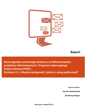 Raport Rozstrzygnięcie pierwszego konkursu na dofinansowanie projektów informatycznych z Programu Operacyjnego Polska Cyfrowa (POPC) Działanie 2.1 „Wysoka dostępność i jakość e-usług publicznych” Autorzy raportu: Dariusz Nowakowski Bartłomiej Klinger www.nowakowskidariusz.pl Warszawa, Listopad 2015 r. Rozstrzygnięcie pierwszego konkursu na dofinansowanie projektów informatycznych z POPC Działanie 2.1 „Wysoka dostępność i jakość e-usług publicznych” Przedmiot raportu Raport podsumowuje wyniki pierwszego konkursu zorganizowanego przez Centrum Projektów Polska Cyfrowa dla Programu Operacyjnego Polska Cyfrowa w ramach Działania 2.1 „Wysoka dostępność i jakość e-usług publicznych”. Analiza wyników przedmiotowego konkursu stanowi kontynuację analizy projektów informatycznych dofinansowanych z funduszy strukturalnych Unii Europejskiej w latach 2004–15 przedstawionej w raporcie „Informatyzacja państwa przy wsparciu funduszy strukturalnych Unii Europejskiej – podsumowanie dekady”1 Czy instytucje odpowiedzialne za informatyzację państwa wyciągnęły wnioski z błędów popełnionych przy realizacji projektów informatycznych w latach 2004-15 w ramach 7. osi priorytetowej „Społeczeństwo informacyjne – budowa elektronicznej administracji” Programu Operacyjnego Innowacyjna Gospodarka? Działanie 2.1. stanowi część 2. osi priorytetowej „E-administracja i otwarty rząd” Programu Operacyjnego Polska Cyfrowa na lata 2014-20. W sumie na 2. oś priorytetową POPC przewidziane zostały środki w wysokości 949,6 mln Euro, a pierwszy konkurs rozstrzygnięty w ramach działania 2.1. pokazuje kierunek działań realizowanych przez rząd RP ws. informatyzacji państwa w perspektywie do 2020 roku. 1 http://nowakowskidariusz.pl/2015/10/20/informatyzacja-panstwa-przy-wsparciu-funduszy-strukturalnych-uniieuropejskiej-podsumowanie-dekady/ Listopad 2015. 1 Rozstrzygnięcie pierwszego konkursu na dofinansowanie projektów informatycznych z POPC Działanie 2.1 „Wysoka dostępność i jakość e-usług publicznych” Spis treści Przedmiot raportu ......................................................................................................................... 1 Spis treści ....................................................................................................................................... 2 Lista projektów zakwalifikowanych do konkursu na dofinansowanie z POPC Działanie 2.1 „Wysoka dostępność i jakość e-usług publicznych” .................................... 3 Lista projektów wybranych do dofinansowania z POPC Działanie 2.1 „Wysoka dostępność i jakość e-usług publicznych” ..................................................................................................................... 7 Wnioski .......................................................................................................................................... 8 Wszelkie prawa zastrzeżone. ©Copyright by www.nowakowskidariusz.pl Listopad 2015. 2 Rozstrzygnięcie pierwszego konkursu na dofinansowanie projektów informatycznych z POPC Działanie 2.1 „Wysoka dostępność i jakość e-usług publicznych” 3 Lista projektów zakwalifikowanych do konkursu na dofinansowanie POPC Działanie 2.1 „Wysoka dostępność i jakość e-usług publicznych” z W dniu 30 grudnia 2014 roku Centrum Projektów Polska Cyfrowa (CPPC), dawna Władza Wdrażająca Programy Europejskie, będąca Instytucją Pośredniczącą dla Programu Operacyjnego Polska Cyfrowa (POPC) ogłosiła pierwszy konkurs na dofinansowanie projektów w ramach Działania 2.1. „Wysoka dostępność i jakość e-usług publicznych”. Na konkurs przeznaczono kwotę 945,5 mln zł (800 mln zł z UE + 145,5 mln zł współfinansowania z budżetu państwa). Do konkursu zgłoszono 39 wniosków o dofinansowanie. Po weryfikacji formalnej, do konkursu zakwalifikowanych zostało 29 projektów, na łączną kwotę 2,26 mld zł. Lista projektów zakwalifikowanych do konkursu została przedstawiona w Tabeli nr 1. Lista projektów zakwalifikowanych do oceny merytorycznej POPC.02.01.00-IP.01-00-001/15 L.p 1 Tytuł projektu E-turysta - Polski System Informacji Turystycznej Wnioskodawca Opis projektu Wnioskowana kwota dofinansowania Polska Organizacja Turystyczna Tworzenie lub rozwój eusług publicznych (A2B, A2C) 8.198.549 zł Naczelna Dyrekcja Archiwów Państwowych Tworzenie lub rozwój usług wewnątrz administracyjnych (A2A) niezbędnych dla funkcjonowania e-usług publicznych 14.284.843 zł 35.188.700 zł 2 Archiwum Dokumentów Elektronicznych 3 Ariadna - Dostosowanie Profilu Zaufanego do unijnych wymogów rozporządzenia eIDAS Ministerstwo Administracji i Cyfryzacji Tworzenie lub rozwój usług wewnątrz administracyjnych (A2A) niezbędnych dla funkcjonowania e-usług publicznych 4 Helios - Integracja rejestrów publicznych z wykorzystaniem Krajowej Szyny Usług (KSU) Ministerstwo Administracji i Cyfryzacji Tworzenie lub rozwój usług wewnątrz administracyjnych (A2A) niezbędnych dla funkcjonowania e-usług publicznych 55.736.280 zł Ministerstwo Finansów Tworzenie lub rozwój usług wewnątrz administracyjnych (A2A) niezbędnych dla funkcjonowania e-usług publicznych 192.500.000 zł 5 Chmura obliczeniowa resortu finasów (HARF) Listopad 2015. Rozstrzygnięcie pierwszego konkursu na dofinansowanie projektów informatycznych z POPC Działanie 2.1 „Wysoka dostępność i jakość e-usług publicznych” 4 6 NOXA - E-usługi publiczne wspierające usuwanie skutków klęsk żywiołowych w Polsce Ministerstwo Administracji i Cyfryzacji Tworzenie lub rozwój eusług publicznych (A2B, A2C) 3.831.167 zł 7 Rozwój katalogu usług cyfrowych dla klientów Administracji Podatkowej i Kontroli Skarbowej w zakresie centralizacji obsługi podatków CIT i VAToraz obsługi Jednolitego Pliku Kontrolnego Ministerstwo Finansów Tworzenie lub rozwój eusług publicznych (A2B, A2C) 97.615.960 