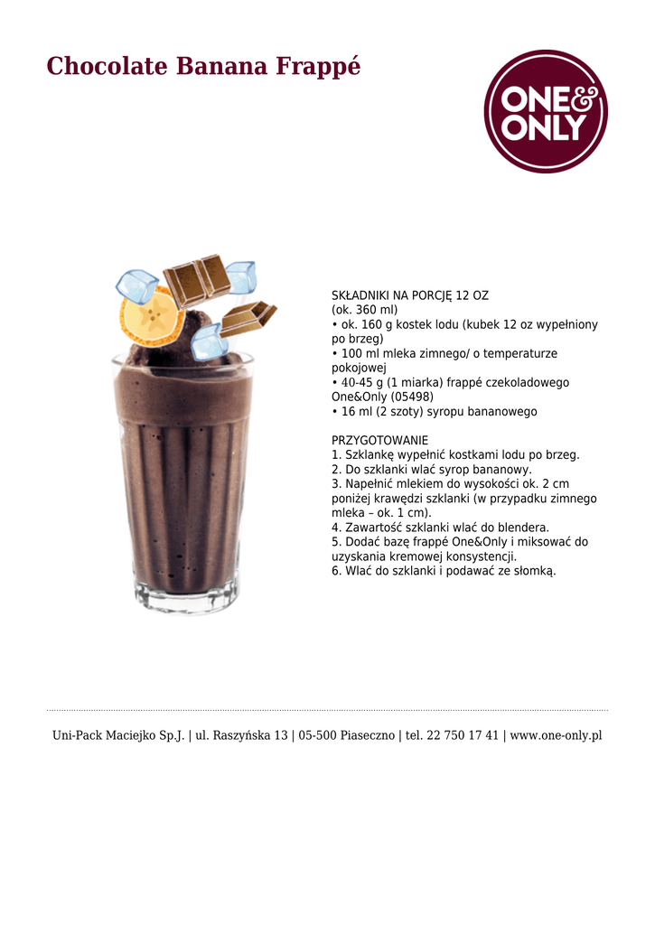 Chocolate Banana Frappé SKŁADNIKI NA PORCJĘ 12 OZ (ok. 360 ml) • ok. 160 g kostek lodu (kubek 12 oz wypełniony po brzeg) • 100 ml mleka zimnego/ o temperaturze pokojowej • 40-45 g (1 miarka) frappé czekoladowego One&Only (05498) • 16 ml (2 szoty) syropu bananowego PRZYGOTOWANIE 1. Szklankę wypełnić kostkami lodu po brzeg. 2. Do szklanki wlać syrop bananowy. 3. Napełnić mlekiem do wysokości ok. 2 cm poniżej krawędzi szklanki (w przypadku zimnego mleka – ok. 1 cm). 4. Zawartość szklanki wlać do blendera. 5. Dodać bazę frappé One&Only i miksować do uzyskania kremowej konsystencji. 6. Wlać do szklanki i podawać ze słomką. Uni-Pack Maciejko Sp.J. | ul. Raszyńska 13 | 05-500 Piaseczno | tel. 22 750 17 41 | www.one-only.pl