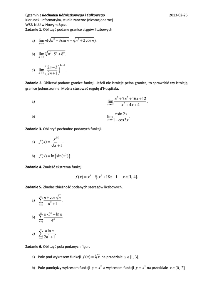 Egzamin z Rachunku Różniczkowego i Całkowego Kierunek: informatyka, studia zaoczne (niestacjonarne) WSB-NLU w Nowym Sączu Zadanie 1. Obliczyd podane granice ciągów liczbowych 2013-02-26 a) lim n( n2 3sin n n2 2cos n ). n b) lim n n2 5n 8n . n 2n 3 2n 1 4 n 1 c) lim n . Zadanie 2. Obliczyd podane granice funkcji. Jeżeli nie istnieje pełna granica, to sprawdzid czy istnieją granice jednostronne. Można stosowad regułę d’Hospitala. a) x3 7 x 2 16 x 12 . x 2 x2 4 x 4 b) lim lim x sin 2 x . x 0 1 cos 3 x Zadanie 3. Obliczyd pochodne podanych funkcji. a) x2 / 3 f ( x) . x 1 b) f ( x) ln sin( x 2 ) . Zadanie 4. Znaleźd ekstrema funkcji f ( x) x3 152 x2 18x 1 x [1, 4]. Zadanie 5. Zbadad zbieżnośd podanych szeregów liczbowych. n cos n . n2 1 n 1 a) b) n 3n ln n . 4n n 1 c) 2n n 1 n ln n . 3 1 Zadanie 6. Obliczyd pola podanych figur. a) Pole pod wykresem funkcji f ( x) 5 x na przedziale x [1, 3]. 2 3 b) Pole pomiędzy wykresem funkcji y x a wykresem funkcji y x na przedziale x [0, 2]. Egzamin z Rachunku Różniczkowego i Całkowego Kierunek: informatyka, studia zaoczne (niestacjonarne) WSB-NLU w Nowym Sączu 2013-02-26 Zadania z teorii (wybieramy tylko trzy spośród podanych niżej). Zadanie 1. Podaj definicję granicy ciągu liczbowego. Zadanie 2. Podaj przykład funkcji nieciągłej. Zadanie 3. Podaj wzór na całkowanie przez części dla całki nieoznaczonej. Zadanie 4. Dany jest szereg liczbowy a . Co to znaczy, że szereg ten jest zbieżny? n 1 n Zadanie 5. Czy każdy ciąg ograniczony jest zbieżny? Jeżeli nie to podaj kontrprzykład. Zadanie 6. Sformułuj warunek wystarczający na istnienie maksimum w punkcie x0 D dla funkcji f : D dwukrotnie różniczkowalnej. Zakładamy, że D jest przedziałem. Zadanie 7. Jaka jest zależność pomiędzy pochodną a monotonicznością funkcji f : (a, b) ?