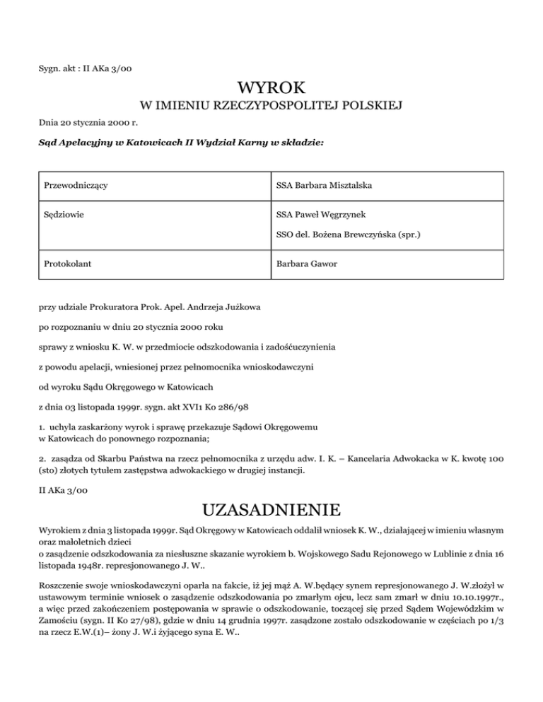 Sygn. akt : II AKa 3/00 WYROK W IMIENIU RZECZYPOSPOLITEJ POLSKIEJ Dnia 20 stycznia 2000 r. Sąd Apelacyjny w Katowicach II Wydział Karny w składzie: Przewodniczący SSA Barbara Misztalska Sędziowie SSA Paweł Węgrzynek SSO del. Bożena Brewczyńska (spr.) Protokolant Barbara Gawor przy udziale Prokuratora Prok. Apel. Andrzeja Jużkowa po rozpoznaniu w dniu 20 stycznia 2000 roku sprawy z wniosku K. W. w przedmiocie odszkodowania i zadośćuczynienia z powodu apelacji, wniesionej przez pełnomocnika wnioskodawczyni od wyroku Sądu Okręgowego w Katowicach z dnia 03 listopada 1999r. sygn. akt XVI1 Ko 286/98 1. uchyla zaskarżony wyrok i sprawę przekazuje Sądowi Okręgowemu w Katowicach do ponownego rozpoznania; 2. zasądza od Skarbu Państwa na rzecz pełnomocnika z urzędu adw. I. K. – Kancelaria Adwokacka w K. kwotę 100 (sto) złotych tytułem zastępstwa adwokackiego w drugiej instancji. II AKa 3/00 UZASADNIENIE Wyrokiem z dnia 3 listopada 1999r. Sąd Okręgowy w Katowicach oddalił wniosek K. W., działającej w imieniu własnym oraz małoletnich dzieci o zasądzenie odszkodowania za niesłuszne skazanie wyrokiem b. Wojskowego Sadu Rejonowego w Lublinie z dnia 16 listopada 1948r. represjonowanego J. W.. Roszczenie swoje wnioskodawczyni oparła na fakcie, iż jej mąż A. W.będący synem represjonowanego J. W.złożył w ustawowym terminie wniosek o zasądzenie odszkodowania po zmarłym ojcu, lecz sam zmarł w dniu 10.10.1997r., a więc przed zakończeniem postępowania w sprawie o odszkodowanie, toczącej się przed Sądem Wojewódzkim w Zamościu (sygn. II Ko 27/98), gdzie w dniu 14 grudnia 1997r. zasądzone zostało odszkodowanie w częściach po 1/3 na rzecz E.W.(1)– żony J. W.i żyjącego syna E. W.. Z powyższym postanowieniem sąd nie rozstrzygnął o pozostałej 1/3 części ustalonego odszkodowania, stwierdzając w uzasadnieniu iż pozostaje ono dla żony i dzieci zmarłego wnioskodawcy. Wyrok Sądu Okręgowego w Katowicach zaskarżył pełnomocnik wnioskodawczyni. W wywiedzionej apelacji zarzucił obrazę art. 8 ustawy z dnia 23 lutego 1991r. o uznaniu za nieważne orzeczeń wydanych wobec osób represjonowanych za działalność na rzecz niepodległego bytu Państwa Polskiego poprzez jego niewłaściwą wykładnię i błędne przyjęcie, że roszczenie o odszkodowanie nie przechodzi na następców prawnych wnioskodawcy. Wniósł zatem o zmianę zaskarżonego orzeczenia i zasądzenie na rzecz następców prawnych A. W. stosownego odszkodowania. Sąd Apelacyjny zważył co następuje: Wykładnia art. 8 ust. 1 zd. 2 ustawy z dnia 23 lutego 1991r. o uznaniu za nieważne orzeczeń wydanych wobec osób represjonowanych za działalność na rzecz niepodległego bytu Państwa Polskiego od szeregu lat pozostaje sporną zarówno w praktyce jak i doktrynie. Orzecznictwo Sądu Najwyższego i Sądów Apelacyjnych jest rozbieżne, a w wielu przypadkach wręcz sprzeczne ze sobą. W uchwale z dnia 28 lipca 1994r. (OSNKW 7-8 z 1994r. poz. 44) Sąd Najwyższy stwierdził, iż w przypadku śmierci osoby uprawnionej do wstąpienia, na podstawie art. 8 ust. 1 zd. 2 ustawy z dnia 23.02.1991r. tj. w miejsce zmarłej osoby represjonowanej, z żądaniem odszkodowania za poniesioną szkodę i zadośćuczynienie za doznaną krzywdę, uprawienie to nie przechodzi z kolei na jej następców prawnych. Odmiennie natomiast w uchwale składu siedmiu sędziów z dnia 5 października 1995r. (OSNKW 11-12 z 1995r. poz. 73), Sąd Najwyższy wyraził pogląd, iż roszczenie o odszkodowanie za poniesioną szkodę, które wraz z roszczeniem o zadośćuczynienie za doznaną krzywdę przeszło w myśl art. 8 ust. 1 zd. 2 ustawy lutowej, na następców prawnych osoby represjonowanej, należy do spadku po tych następcach (art. 322§1 kc), natomiast roszczenie o zadośćuczynienie tylko wtedy, gdy zostały spełnione warunki określone w art. 445§3 kc. W dotychczasowym swoim orzecznictwie Sąd Apelacyjny w Katowicach w przeważającej części rozstrzygnięć wyrażał pogląd zbieżny z pierwszym z cytowanych wyżej orzeczeń Sądu Najwyższego. Nie zmieniając generalnej linii swego dotychczasowego orzecznictwa, w przedmiotowej sprawie doszedł do przekonania, iż celowym byłoby rozważenie możliwości oparcia orzeczenia na drugiej z dopuszczalnych wykładni przepisu art. 8 ust. 1 zd. 2, prezentowanej przez Sąd Najwyższy w uchwale z dnia 5 października 1995r. Powyższe stanowisko Sądu Apelacyjnego wynika z faktu, iż wniesiona przez K. W.sprawa o zasądzenie odszkodowania i zadośćuczynienia jest nierozerwalnie związana Az toczącym się i zakończonym postanowieniem z dnia 4.12.1997r. postępowaniem przed Sądem Wojewódzkim w Zamościu. W sprawie tej toczącej się z wniosku E.W.(1)– żony represjonowanego oraz jego synów A.i E. W., wobec śmierci na dwa miesiące przed ukończeniem postępowania jednego z wnioskodawców – A. W., zasądzono na rzecz E.i E. W.odszkodowanie w częściach po 1/3. Ustalając globalną kwotę odszkodowania i zadośćuczynienia należnego represjonowanemu, sąd dokonał podziału tej kwoty na 3 uprawnionych, zasądził 2/3 części, a w uzasadnieniu stwierdził, iż trzecia część ustalonej kwoty „pozostaje dla żony i dzieci A. W.”. W chwili obecnej analiza treści decyzji Sądu Wojewódzkiego w Zamościu i Sądu Okręgowego w Katowicach powoduje, że nie sposób nie dostrzec zaistniałej dysharmonii między zapadłymi orzeczeniami, a wynikającej z różnej wykładni tej samej normy prawnej. Przy prawomocnym ustaleniu globalnej kwoty należnego odszkodowania pozostaje nie rozstrzygnięcia kwestia 1/3 części tegoż odszkodowania. Na gruncie dotychczasowego orzecznictwa utrwalony jest pogląd, że roszczenia o odszkodowanie i zadośćuczynienie uregulowane w ustawie z dnia 29 lutego 1991r. mają charakter cywilnoprawny, wobec czego w kwestiach nieuregulowanych w tejże ustawie należy sięgać do przepisów Kodeksu cywilnego. Z kolei art. 8 pkt. 3 ustawy 