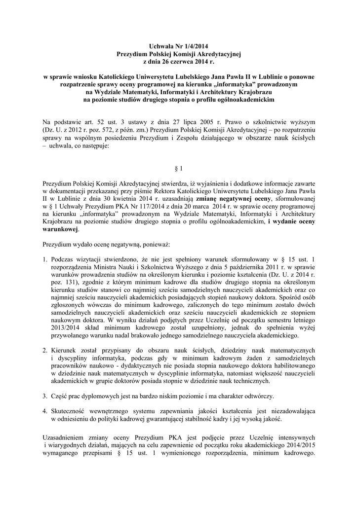 Uchwała Nr 1/4/2014 Prezydium Polskiej Komisji Akredytacyjnej z dnia 26 czerwca 2014 r. w sprawie wniosku Katolickiego Uniwersytetu Lubelskiego Jana Pawła II w Lublinie o ponowne rozpatrzenie sprawy oceny programowej na kierunku „informatyka” prowadzonym na Wydziale Matematyki, Informatyki i Architektury Krajobrazu na poziomie studiów drugiego stopnia o profilu ogólnoakademickim Na podstawie art. 52 ust. 3 ustawy z dnia 27 lipca 2005 r. Prawo o szkolnictwie wyższym (Dz. U. z 2012 r. poz. 572, z późn. zm.) Prezydium Polskiej Komisji Akredytacyjnej – po rozpatrzeniu sprawy na wspólnym posiedzeniu Prezydium i Zespołu działającego w obszarze nauk ścisłych – uchwala, co następuje: §1 Prezydium Polskiej Komisji Akredytacyjnej stwierdza, iż wyjaśnienia i dodatkowe informacje zawarte w dokumentacji przekazanej przy piśmie Rektora Katolickiego Uniwersytetu Lubelskiego Jana Pawła II w Lublinie z dnia 30 kwietnia 2014 r. uzasadniają zmianę negatywnej oceny, sformułowanej w § 1 Uchwały Prezydium PKA Nr 117/2014 z dnia 20 marca 2014 r. w sprawie oceny programowej na kierunku „informatyka” prowadzonym na Wydziale Matematyki, Informatyki i Architektury Krajobrazu na poziomie studiów drugiego stopnia o profilu ogólnoakademickim, i wydanie oceny warunkowej. Prezydium wydało ocenę negatywną, ponieważ: 1. Podczas wizytacji stwierdzono, że nie jest spełniony warunek sformułowany w § 15 ust. 1 rozporządzenia Ministra Nauki i Szkolnictwa Wyższego z dnia 5 października 2011 r. w sprawie warunków prowadzenia studiów na określonym kierunku i poziomie kształcenia (Dz. U. z 2014 r. poz. 131), zgodnie z którym minimum kadrowe dla studiów drugiego stopnia na określonym kierunku studiów stanowi co najmniej sześciu samodzielnych nauczycieli akademickich oraz co najmniej sześciu nauczycieli akademickich posiadających stopień naukowy doktora. Spośród osób zgłoszonych wówczas do minimum kadrowego, zaliczonych do tego minimum zostało dwóch samodzielnych nauczycieli akademickich oraz sześciu nauczycieli akademickich ze stopniem naukowym doktora. W wyniku działań podjętych przez Uczelnię od początku semestru letniego 2013/2014 skład minimum kadrowego został uzupełniony, jednak do spełnienia wyżej przywołanego warunku nadal brakowało jednego samodzielnego nauczyciela akademickiego. 2. Kierunek został przypisany do obszaru nauk ścisłych, dziedziny nauk matematycznych i dyscypliny informatyka, podczas gdy w minimum kadrowym żaden z samodzielnych pracowników naukowo - dydaktycznych nie posiada stopnia naukowego doktora habilitowanego w dziedzinie nauk matematycznych w dyscyplinie informatyka, natomiast większość nauczycieli akademickich w grupie doktorów posiada stopnie w dziedzinie nauk technicznych. 3. Część prac dyplomowych jest na bardzo niskim poziomie i ma charakter odtwórczy. 4. Skuteczność wewnętrznego systemu zapewniania jakości kształcenia jest niezadowalająca w odniesieniu do polityki kadrowej gwarantującej stabilność kadry i jej wysoką jakość. Uzasadnieniem zmiany oceny Prezydium PKA jest podjęcie przez Uczelnię intensywnych i wiarygodnych działań, mających na celu zapewnienie od początku roku akademickiego 2014/2015 wymaganego przepisami § 15 ust. 1 wymienionego rozporządzenia, minimum kadrowego. W szczególności Uczelnia podpisała umowę o pracę z nowym samodzielnym nauczycielem akademickim, który może być zaliczony do minimum kadrowego (Załącznik do Uchwały), jeśli spełni on warunek prowadzenia co najmniej 30 godzin zajęć dydaktycznych na kierunku, którego dotyczy wniosek. Ponadto jedna osoba, która do tej pory była zaliczana do minimum kadrowego na kierunku studiów „matematyka” prowadzonym na Wydziale Matematyki, Informatyki i Architektury Krajobrazu, wyraziła przed rozpoczęciem semestru letniego roku akademickiego 2013/2014 zgodę na zaliczenie jej do minimum kadrowego studiów drugiego stopnia kierunku „informatyka” (Załącznik do Uchwały). Działania te pozwalają na stwierdzenie, że od 1. 10. 2014 r. wymagania dotyczące minimum kadrowego będą spełnione. We wniosku Uczelnia stawia zarzut „losowości wliczania przez Prezydium PKA nauczycieli akademickich do minimum kadrowego”. Uzasadniając tę opinię Uczelnia powołuje się na przykład dwóch osób (Załącznik do Uchwały), które zostały przez Prezydium PKA w roku 2012 wliczone do minimum kadrowego kierunku informatyka na poziomie studiów pierwszego stopnia, a w roku 2014 nie zostały zaliczone do minimum kadrowego na tym samym kierunku na poziomie studiów drugiego stopnia. Argumentacja ta jest błędna, ponieważ nie uwzględnia zmiany przepisów ustalających warunki, które muszą spełniać nauczyciele akademiccy, aby móc, stanowić minimum kadrowe. Do roku akademickiego 2011/2012 do minimum kadrowego wliczone były osoby, które posiadały dorobek naukowy w dziedzinie związanej z tym kierunkiem studiów. Obecnie aby zostać włączonym do minimum kadrowego ocenianego kierunku studiów o profilu ogólnoakademickim nauczyciel akademicki powinien posiadać dorobek w obszarze wiedzy, odpowiadającym obszarowi kształcenia, wskazanemu dla tego kierunku studiów, w zakresie jednej z dyscyplin naukowych do których odnoszą się efekty kształcenia. Obydwie osoby, które uprzednio były zaliczone do minimum kadrowego - nie posiadają dorobku naukowego w zakresie dyscypliny informatyka, do której odniesiono efekty kształcenia dla wnioskowanego kierunku, a zatem nie spełniają warunków do zaliczenia do minimum kadrowego. Tak więc nie zaliczenie tych dwóch osób do minimum kadrowego kierunku „informatyka” nie wynika z „losowości” zaliczania nauczycieli akademickich do minimum kadrowego przez Prezydium PKA, lecz ze zmiany przepisów prawa. W odpowiedzi na zarzut 2 Uczelnia wyjaśnia, że przypisanie kierunku informatyka do obszaru nauk ścisłych wynika z tradycji Wydziału - kierunek informa