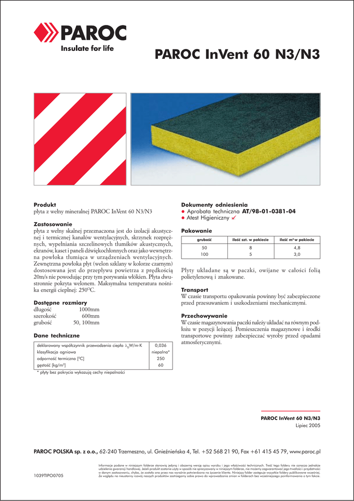 PAROC InVent 60 N3/N3 Produkt Dokumenty odniesienia płyta z wełny mineralnej PAROC InVent 60 N3/N3 l Aprobata techniczna AT/98-01-0381-04 l Atest Higieniczny Zastosowanie płyta z wełny skalnej przeznaczona jest do izolacji akustycznej i termicznej kanałów wentylacyjnych, skrzynek rozprężnych, wypełniania szczelinowych tłumików akustycznych, ekranów, kaset i paneli dźwiękochłonnych oraz jako wewnętrzna powłoka tłumiąca w urządzeniach wentylacyjnych. Zewnętrzna powłoka płyt (welon szklany w kolorze czarnym) dostosowana jest do przepływu powietrza z prędkością 20m/s nie powodując przy tym porywania włókien. Płyta dwustronnie pokryta welonem. Maksymalna temperatura nośnika energii cieplnej: 250OC. grubość ilość szt. w pakiecie ilość m2 w pakiecie 50 8 4,8 100 5 3,0 Płyty układane są w paczki, owijane w całości folią polietylenową i znakowane. Transport W czasie transportu opakowania powinny być zabezpieczone przed przesuwaniem i uszkodzeniami mechanicznymi. Dostępne rozmiary długość szerokość grubość Pakowanie 1000mm 600mm 50, 100mm Przechowywanie Dane techniczne deklarowany współczynnik przewodzenia ciepła λDW/m·K klasyfikacja ogniowa 0,036 W czasie magazynowania paczki należy układać na równym podłożu w pozycji leżącej. Pomieszczenia magazynowe i środki transportowe powinny zabezpieczać wyroby przed opadami atmosferycznymi. niepalna* odporność termiczna [0C] 250 gęstość [kg/m3] 60 * płyty bez pokrycia wykazują cechy niepalności PAROC InVent 60 N3/N3 Lipiec 2005 PAROC POLSKA sp. z o.o., 62-240 Trzemeszno, ul. Gnieźnieńska 4, Tel. +52 568 21 90, Fax +61 415 45 79, www.paroc.pl 1039TIPO0705 Informacje podane w niniejszym folderze stanowią jedyną i obszerną wersję opisu wyrobu i jego właściwości technicznych. Treść tego folderu nie oznacza jednakże udzielenia gwarancji handlowej. Jeżeli produkt zostanie użyty w sposób nie sprecyzowany w niniejszym folderze, nie możemy zagwarantować jego trwałości i przydatności w danym zastosowaniu, chyba, że została ona przez nas wyraźnie potwierdzona na życzenie klienta. Niniejszy folder zastępuje wszystkie foldery publikowane wcześniej. Ze względu na nieustanny rozwój naszych produktów zastrzegamy sobie prawo do wprowadzania zmian w folderach bez wcześniejszego poinformowania o tym fakcie.