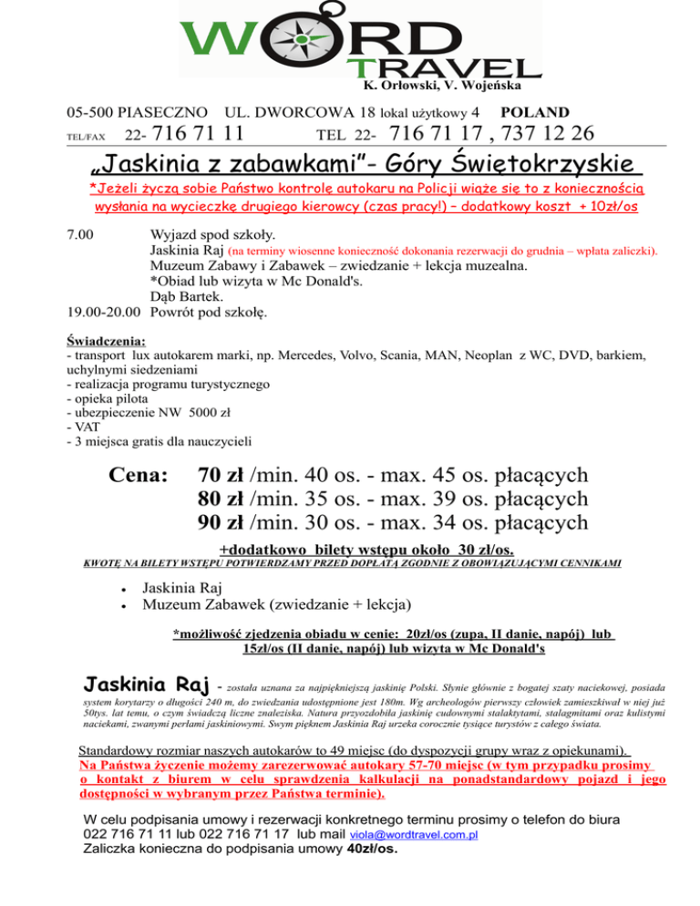 K. Orłowski, V. Wojeńska 05-500 PIASECZNO UL. DWORCOWA 18 lokal użytkowy 4 TEL/FAX 22- 716 71 11 TEL 22- 716 71 17 POLAND , 737 12 26 „Jaskinia z zabawkami”- Góry Świętokrzyskie *Jeżeli życzą sobie Państwo kontrolę autokaru na Policji wiąże się to z koniecznością wysłania na wycieczkę drugiego kierowcy (czas pracy!) – dodatkowy koszt + 10zł/os 7.00 Wyjazd spod szkoły. Jaskinia Raj (na terminy wiosenne konieczność dokonania rezerwacji do grudnia – wpłata zaliczki). Muzeum Zabawy i Zabawek – zwiedzanie + lekcja muzealna. *Obiad lub wizyta w Mc Donald's. Dąb Bartek. 19.00-20.00 Powrót pod szkołę. Świadczenia: - transport lux autokarem marki, np. Mercedes, Volvo, Scania, MAN, Neoplan z WC, DVD, barkiem, uchylnymi siedzeniami - realizacja programu turystycznego - opieka pilota - ubezpieczenie NW 5000 zł - VAT - 3 miejsca gratis dla nauczycieli Cena: 70 zł /min. 40 os. - max. 45 os. płacących 80 zł /min. 35 os. - max. 39 os. płacących 90 zł /min. 30 os. - max. 34 os. płacących +dodatkowo bilety wstępu około 30 zł/os. KWOTĘ NA BILETY WSTĘPU POTWIERDZAMY PRZED DOPŁATĄ ZGODNIE Z OBOWIĄZUJĄCYMI CENNIKAMI Jaskinia Raj Muzeum Zabawek (zwiedzanie + lekcja) *możliwość zjedzenia obiadu w cenie: 20zł/os (zupa, II danie, napój) lub 15zł/os (II danie, napój) lub wizyta w Mc Donald's Jaskinia Raj - została uznana za najpiękniejszą jaskinię Polski. Słynie głównie z bogatej szaty naciekowej, posiada system korytarzy o długości 240 m, do zwiedzania udostępnione jest 180m. Wg archeologów pierwszy człowiek zamieszkiwał w niej już 50tys. lat temu, o czym świadczą liczne znaleziska. Natura przyozdobiła jaskinię cudownymi stalaktytami, stalagmitami oraz kulistymi naciekami, zwanymi perłami jaskiniowymi. Swym pięknem Jaskinia Raj urzeka corocznie tysiące turystów z całego świata. Standardowy rozmiar naszych autokarów to 49 miejsc (do dyspozycji grupy wraz z opiekunami). Na Państwa życzenie możemy zarezerwować autokary 57-70 miejsc (w tym przypadku prosimy o kontakt z biurem w celu sprawdzenia kalkulacji na ponadstandardowy pojazd i jego dostępności w wybranym przez Państwa terminie). W celu podpisania umowy i rezerwacji konkretnego terminu prosimy o telefon do biura 022 716 71 11 lub 022 716 71 17 lub mail [email protected] Zaliczka konieczna do podpisania umowy 40zł/os. Ze względu na szczyt sezonu wycieczek szkolnych w miesiącach maj-czerwiec sugerujemy dokonanie rez. wstępnej na czas zebrania zaliczek! Wyciąg z warunków uczestnictwa imprez turystycznych organizowanych przez B.P. Word Travel (pełna wersja warunków uczestnictwa dostępna jest u nauczyciela organizującego wycieczkę) : 13. W przypadku rezygnacji lub nie uczestniczenia Uczestnika w wykupionej imprezie Organizator uprawniony jest do potrącenia RZECZYWIŚCIE PONIESIONYCH KOSZTÓW. 14. Zmiana uczestnika nie pociąga za sobą kosztów finansowych. 18. Uczestnik odpowiada za wszelkie szkody materialne wyrządzone w trakcie trwania imprezy (zniszczenia w hotelu, autokarze) 15. Jeżeli w programie jest wyjazd poza granicę Polski - uczestnik winien posiadać na miejscu zbiórki aktualnie obowiązujące dokumenty uprawniające do przekroczenia granic krajów objętych programem imprezy (wyłącznie dowód osobisty lub paszport ważny min. 6 m-cy od daty powrotu). 9 B. W przypadku chorób uznawanych za przewlekłe uczestnik winien na własny koszt wykupić dodatkowe ubezpieczenie ! ( dotyczy wycieczek zagranicznych) Klient przez dokonanie wpłaty (całkowitej lub częściowej) akceptuje program wycieczki i warunki uczestnictwa.