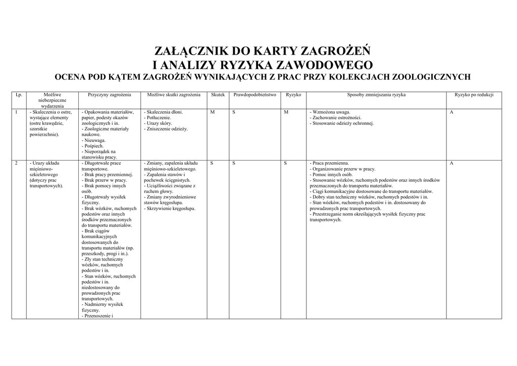 ZAŁĄCZNIK DO KARTY ZAGROŻEŃ I ANALIZY RYZYKA ZAWODOWEGO OCENA POD KĄTEM ZAGROŻEŃ WYNIKAJĄCYCH Z PRAC PRZY KOLEKCJACH ZOOLOGICZNYCH Lp. 1 2 Możliwe niebezpieczne wydarzenia - Skaleczenia o ostre, wystające elementy (ostre krawędzie, szorstkie powierzchnie). - Urazy układu mięśniowoszkieletowego (dotyczy prac transportowych). Przyczyny zagrożenia - Opakowania materiałów, papier, podesty okazów zoologicznych i in. - Zoologiczne materiały naukowe. - Nieuwaga. - Pośpiech. - Nieporządek na stanowisku pracy. - Długotrwałe prace transportowe. - Brak pracy przemiennej. - Brak przerw w pracy. - Brak pomocy innych osób. - Długotrwały wysiłek fizyczny. - Brak wózków, ruchomych podestów oraz innych środków przeznaczonych do transportu materiałów. - Brak ciągów komunikacyjnych dostosowanych do transportu materiałów (np. przeszkody, progi i in.). - Zły stan techniczny wózków, ruchomych podestów i in. - Stan wózków, ruchomych podestów i in. niedostosowany do prowadzonych prac transportowych. - Nadmierny wysiłek fizyczny. - Przenoszenie i Możliwe skutki zagrożenia Skutek Prawdopodobieństwo - Skaleczenia dłoni. - Potłuczenie. - Urazy skóry. - Zniszczenie odzieży. M S M - Wzmożona uwaga. - Zachowanie ostrożności. - Stosowanie odzieży ochronnej. A - Zmiany, zapalenia układu mięśniowo-szkieletowego. - Zapalenia stawów i pochewek ścięgnistych. - Uciążliwości związane z ruchem głowy. - Zmiany zwyrodnieniowe stawów kręgosłupa. - Skrzywienie kręgosłupa. S S S - Praca przemienna. - Organizowanie przerw w pracy. - Pomoc innych osób. - Stosowanie wózków, ruchomych podestów oraz innych środków przeznaczonych do transportu materiałów. - Ciągi komunikacyjne dostosowane do transportu materiałów. - Dobry stan techniczny wózków, ruchomych podestów i in. - Stan wózków, ruchomych podestów i in. dostosowany do prowadzonych prac transportowych. - Przestrzeganie norm określających wysiłek fizyczny prac transportowych. A Ryzyko Sposoby zmniejszania ryzyka Ryzyko po redukcji podnoszenie materiałów. 3 - Reakcje alergiczne. - Zbyt długi czas trwania nieprzerwanej pracy wykonywanej w pomieszczeniach przeznaczonych do magazynowania zoologicznych materiałów naukowych. - Pyły pochodzenia zwierzęcego. - Zapachy odczynników chemicznych stosowanych m.in. do konserwacji i preparacji zoologicznych materiałów naukowych. - Zapachy środków chemicznych stosowanych przy odkażaniu zoologicznych materiałów naukowych. - Zapachy środków chemicznych stosowanych przy pracach technicznych (np. klej, silikon). - Charakterystyczne zapachy preparatów suchych i mokrych. - Pyły pochodzące z materiałów archiwalnych. - Brak wentylacji. - Nieszczelne zamknięcia odczynników chemicznych, płynów konserwujących, mokrych preparatów zoologicznych i in. - Kontakt z zoologicznymi okazami naukowymi spreparowanymi przy użyciu arszeniku. - Kontakt z czynnikami biologicznymi (dotyczy szkodników zoologicznych kolekcji naukowych) np. Lepisma saccharina, Anobium punctatum, Hylotrupes bajulus, - Uczulenia i alergie. - Choroby skóry. - Choroby układu oddechowego. - Zaburzenia w procesie oddychania. - Kaszel. - Uczucie duszności. - Podrażnienie narządu wzroku. - Podrażnienie błon śluzowych. - Choroby układu trawiennego. - Osłabienie. - Wymioty. S S S - Profilaktyczne badania lekarskie. - Stosowanie pracy przemiennej. - Organizowanie przerw w pracy. - Stosowanie środków ochrony indywidualnej (np. rękawice, okulary, maski przemysłowe, maski neutralizujące zapachy). - Zapoznanie pracownika z kartą charakterystyki substancji niebezpiecznych. - Wentylacja. - Zabezpieczanie odczynników chemicznych, płynów konserwujących i in. A Anthrenus verbasci, Attagenus pellio, Attagenus smirnovi, Reesa vespulae, Dermestes lardarius, Tineola bisselliella. 4 - Reakcje alergiczne (dotyczy prac porządkowych). - Kurz. - Pyły pochodzące z materiałów przeznaczonych do prac porządkowych w kolekcjach. - Uciążliwe zapachy środków chemicznych (np. pasty, proszki, płyny). - Nieodpowiednia technika prac porządkowych. - Uczulenia i alergie. - Choroby skóry. - Choroby układu oddechowego. - Zaburzenia w procesie oddychania. - Kaszel. - Uczucie duszności. - Podrażnienie narządu wzroku. - Podrażnienie błon śluzowych. - Choroby układu trawiennego. - Osłabienie. - Wymioty. S D D - Właściwe zabezpieczenie środków chemicznych (np. pasty, proszki, płyny). - Wentylacja. - Ograniczenie kontaktu z detergentami. - Stosowanie środków ochrony indywidualnej (np. fartuch, rękawice, maski techniczne). - Właściwy dobór środków chemicznych. - Stosowanie środków zgodnie z ich przeznaczeniem. - Znajomość instrukcji stosowanych środków chemicznych. - Stosowanie środków ochrony indywidualnej (np. maski). - Aktualizacja informacji o stosowanych środkach chemicznych. - Technika prac porządkowych dostosowana do rodzaju sprzątanej powierzchni (użycie odkurzacza, ścieranie na mokro i in.). A 5 - Choroby układu oddechowego. - Pogłębianie wad narządu wzroku. - Osłabienie. - Ból głowy. - Zmiana temperatury ciała. - Dolegliwości związane z układem oddechowym. - Omdlenie. S S S - Stosowanie środków ochrony indywidualnej. - Stosowanie odzieży ochronnej. - Praca przemienna. - Ciepłe napoje. - Przerwy w pracy. A 6 - Urazy dłoni i twarzy. (dotyczy prac laboratoryjnych). - Wykonywanie prac w budynkach przeznaczonych do przechowywania zoologicznych zbiorów naukowych o charakterystycznych warunkach środowiska tj. możliwość wystąpienia temperatury poniżej 16ºC, brak światła dziennego i in. - Wykonywanie prac na zewnątrz (poza budynkiem) np. podczas transportu zoologicznych materiałów naukowych. - Nieuwaga. - Pośpiech. - Nieporządek na stanowisku pracy. - Skaleczenia skóry rąk i twarzy. - Zniszczenie odzieży. S S S - Zachowanie ostrożności. - Zachowanie zasad BHP. - Stosowanie odzieży ochronnej. A 7 Stres. Obciążenie psychi