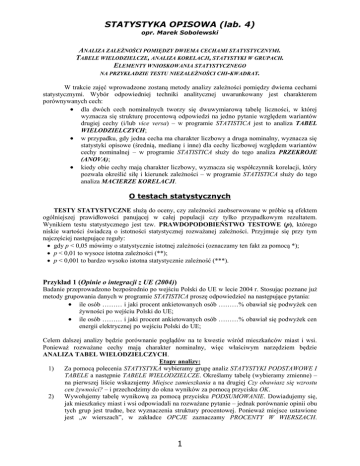 STATYSTYKA OPISOWA (lab. 4) opr. Marek Sobolewski ANALIZA ZALEŻNOŚCI POMIĘDZY DWIEMA CECHAMI STATYSTYCZNYMI. TABELE WIELODZIELCZE, ANALIZA KORELACJI, STATYSTYKI W GRUPACH. ELEMENTY WNIOSKOWANIA STATYSTYCZNEGO NA PRZYKŁADZIE TESTU NIEZALEŻNOŚCI CHI-KWADRAT. W trakcie zajęć wprowadzone zostaną metody analizy zależności pomiędzy dwiema cechami statystycznymi. Wybór odpowiedniej techniki analitycznej uwarunkowany jest charakterem porównywanych cech: dla dwóch cech nominalnych tworzy się dwuwymiarową tabelę liczności, w której wyznacza się strukturę procentową odpowiedzi na jedno pytanie względem wariantów drugiej cechy (i/lub vice versa) – w programie STATISTICA jest to analiza TABEL WIELODZIELCZYCH; w przypadku, gdy jedna cecha ma charakter liczbowy a druga nominalny, wyznacza się statystyki opisowe (średnią, medianę i inne) dla cechy liczbowej względem wariantów cechy nominalnej – w programie STATISTICA służy do tego analiza PRZEKROJE (ANOVA); kiedy obie cechy mają charakter liczbowy, wyznacza się współczynnik korelacji, który pozwala określić siłę i kierunek zależności – w programie STATISTICA służy do tego analiza MACIERZE KORELACJI. O testach statystycznych TESTY STATYSTYCZNE służą do oceny, czy zależności zaobserwowane w próbie są efektem ogólniejszej prawidłowości panującej w całej populacji czy tylko przypadkowym rezultatem. Wynikiem testu statystycznego jest tzw. PRAWDOPODOBIEŃSTWO TESTOWE (p), którego niskie wartości świadczą o istotności statystycznej rozważanej zależności. Przyjmuje się przy tym najczęściej następujące reguły: gdy p < 0,05 mówimy o statystycznie istotnej zależności (oznaczamy ten fakt za pomocą *); p < 0,01 to wysoce istotna zależności (**); p < 0,001 to bardzo wysoko istotna statystycznie zależność (***). Przykład 1 (Opinie o integracji z UE (2004)) Badanie przeprowadzono bezpośrednio po wejściu Polski do UE w lecie 2004 r. Stosując poznane już metody grupowania danych w programie STATISTICA proszę odpowiedzieć na następujące pytania: ile osób ……… i jaki procent ankietowanych osób ………% obawiał się podwyżek cen żywności po wejściu Polski do UE; ile osób ……… i jaki procent ankietowanych osób ………% obawiał się podwyżek cen energii elektrycznej po wejściu Polski do UE; Celem dalszej analizy będzie porównanie poglądów na te kwestie wśród mieszkańców miast i wsi. Ponieważ rozważane cechy mają charakter nominalny, więc właściwym narzędziem będzie ANALIZA TABEL WIELODZIELCZYCH. Etapy analizy: 1) Za pomocą polecenia STATYSTYKA wybieramy grupę analiz STATYSTYKI PODSTAWOWE I TABELE a następnie TABELE WIELODZIELCZE. Określamy tabelę (wybieramy zmienne) – na pierwszej liście wskazujemy Miejsce zamieszkania a na drugiej Czy obawiasz się wzrostu cen żywności? – i przechodzimy do okna wyników za pomocą przycisku OK. 2) Wywołujemy tabelę wynikową za pomocą przycisku PODSUMOWANIE. Dowiadujemy się, jak mieszkańcy miast i wsi odpowiadali na rozważane pytanie – jednak porównanie opinii obu tych grup jest trudne, bez wyznaczenia struktury procentowej. Ponieważ miejsce ustawione jest „w wierszach”, w zakładce OPCJE zaznaczamy PROCENTY W WIERSZACH. 1 STATYSTYKA OPISOWA (lab. 4) opr. Marek Sobolewski 3) Zaznaczamy także test CHIKWADRAT Pearsona i NW. Aby wywołać tabele wynikowe nie posługujemy się przyciskiem PODSUMOWANIE lecz w zakładce WIĘCEJ naciskamy DOKŁADNE TABELE DWUDZIELCZE. W dwóch tabelach wynikowych znajdują się liczności i procenty oraz wynik testu niezależności chikwadrat. Wyniki komponujemy w poniższej tabeli a następnie interpretujemy wartość p i opisujmy charakter zależności, jeżeli takowa występuje. Miejsce zamieszkania miasto wieś Razem Czy obawiasz się wzrostu cen żywności? (p = tak nie …… (…… %) …… (…… %) …… (…… %) …… (…… %) …… …… ) Razem …… …… …… Opis i interpretacja wartości p oraz struktury procentowej odpowiedzi ............................................................. .............................................................................................................................................................................. .............................................................................................................................................................................. .............................................................................................................................................................................. Przykład 2 (Opinie o integracji z UE (2004)) W analogiczny sposób proszę zbadać zależności pomiędzy: płcią i obawą przed wzrostem cen żywności; sytuacją finansową i sposobem głosowania w referendum europejskim. Liczności i wartości procentowe proszę umieścić w poniższych tabelach, podobnie wartości p – proszę zinterpretować uzyskane wyniki. Dla każdej tabeli należy przemyśleć sposób wyznaczania struktury procentowej – według wierszy czy według kolumn? Czy obawiasz się wzrostu cen żywności? tak nie Razem Płeć (p = mężczyzna …… (…… %) …… (…… %) …… ) kobieta …… (…… %) …… (…… %) …… Razem …… …… …… Opis i interpretacja wartości p oraz struktury procentowej odpowiedzi ............................................................. .............................................................................................................................................................................. .............................................................................................................................................................................. .........................................................................................................................................................................