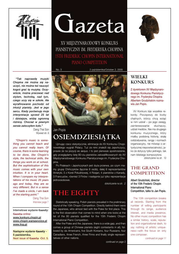 Gazeta XV MI¢DZYNARODOWY KONKURS PIANISTYCZNY IM. FRYDERYKA CHOPINA 15TH FREDERIC CHOPIN INTERNATIONAL PIANO COMPETITION No. 3 2 paêdziernika/October 2, 2005 WIELKI KONKURS “Tak naprawd´ muzyki Chopina nie mo˝na si´ nauczyç, nie mo˝na te˝ nauczyç kogoÊ graç t´ muzyk´. OczywiÊcie, mo˝na pracowaç nad stylem, technikà, nad tym, czego uczy si´ w szkole. Ale wyrafinowanie pochodzi od intuicji pianisty. Jest w jego sercu. Kiedy porównuj´ moje interpretacje sprzed 25 lat i dzisiejsze, widz´ ogromnà ró˝nic´. Chocia˝ w pewnym sensie zatoczy∏em ko∏o.” Dang Thai Son Wywiad str. 6 “Chopin’s music is something you cannot teach and you cannot really learn. Of course, there is some learning to be done, like Chopin’s style, the technical skills, the things you work on at school. But the sophistication of this music comes with your own intuition. It is in your heart. When I compare my interpretations of his music 25 years ago and today, they are so very different. But in a sense I’ve made a circle, I am back at the starting point.” Dang Thai Son Interview page 7 Internetowe wydanie Gazety: Gazeta online: www.konkurs.chopin.pl www.chopin.warsawvoice.pl www.itvp.pl Nast´pne wydanie Gazety 5 paêdziernika. Next issue of Gazeta -Oct. 5. Z dyrektorem XV Mi´dzynarodowego Konkursu Pianistycznego im. Fryderyka Chopina Albertem Grudziƒskim rozmawia Jan Popis. Jan Popis OSIEMDZIESIÑTKA Ujmujàc rzecz statystycznie, eliminacje do XV Konkursu Chopinowskiego wygrali Polacy. Tu˝ za nimi znaleêli si´ Japoƒczycy, prawie ˝e na pozycji ex aequo. I to jest pierwsze spostrze˝enie, gdy przeglàdamy list´ 80-ciu pianistów zakwalifikowanych do XV Mi´dzynarodowego Konkursu Pianistycznego im. Fryderyka Chopina. Po Polakach i Japoƒczykach jest du˝a przerwa, po czym mamy grup´ Chiƒczyków (∏àcznie 8 osób), dalej 6 reprezentantów Ameryki, 5 z Korei Po∏udniowej, 4 Rosjan, 4 pianistów z Kanady, 3 Francuzów, równie˝ 3 Finów i nast´pnie ju˝ tylko reprezentacje jednoosobowe. dokoƒczenie na str. 2 THE EIGHTY Statistically speaking, Polish pianists prevailed in the preliminary round of the 15th Chopin Competition. Directly behind them were the Japanese, who almost tied with the Poles for first place. This is the first observation that comes to mind when one looks at the list of the 80 pianists qualified for the 15th Frederic Chopin International Piano Competition. After the Poles and the Japanese, there is a wide gap, and then comes a group of Chinese pianists (eight contestants in all), followed by six Americans, five South Koreans, four Russians, four Canadians, three French, three Finns and finally single representatives of other nations. continued on page 3 XV Konkurs bije wszelkie rekordy. Poczàwszy do liczby ch´tnych, którzy chcà wziàç w nim udzia∏ – po jego zasi´g, zainteresowanie s∏uchaczy, udzia∏ mediów. Nie ma drugiego konkursu muzycznego, który mia∏by podobnà histori´, skal´ oddzia∏ywania, rang´ i rozmach organizacyjny, nie mówiàc o artystycznej niepowtarzalnoÊci, jako ˝e dotyczy tylko jednego, tak nam bliskiego kompozytora. dokoƒczenie na str. 10 THE GRAND COMPETITION Albert Grudziƒski, director of the 15th Frederic Chopin International Piano Competition, talks to Jan Popis. The 15th competition breaks all records. Starting from the number of willing participants through its range, audience interest, and media presence. No other music competition has a similar history, scale, reputation and organizational dash, to say nothing of artistic uniqueness—with the focus on only one composer. continued on page 11 Gazeta OSIEMDZIESIÑTKA dokoƒczenie ze str. 1 iezwykle interesujàcà w tym statystycznym uj´ciu wydaje si´ grupa pianistów z Finlandii, którzy w 100procentach przeszli eliminacje. To nie przypadek. Tradycje pianistyki fiƒskiej, poparte wielu znakomitymi nazwiskami, w tym pianistów m∏odej generacji, sà znane. Tym ∏atwiej to pojàç, jeÊli ktoÊ si´ zetknà∏ z systemem edukacji w Kraju Tysiàca Jezior, zw∏aszcza z dzia∏alnoÊcià Akademii im. J. Sibeliusa. Co si´ dzieje z pianistami w∏oskimi? Nikt z nich nie przeszed∏ eliminacji. Czy˝by s∏awna Accademia Pianistica “Incontri col Maestro” w Imola tym razem nie mia∏a nic do zaproponowania? Rosjanie - to d∏uga historia i stabilnoÊç szko∏y. Oni potrafià czerpaç z osiàgni´ç swych starych mistrzów. Potrafià te˝ doskonale przygotowaç si´ do konkursu. Czy jest wÊród nich ktoÊ na miar´ Aleksandra Kobrina, który szkoda, ˝e nie wykorzysta∏ 5 lat temu szansy zdobycia Grand Prix? To, ˝e móg∏ wówczas znaleêç si´ na najwy˝szym N 2 miejscu, potwierdzi∏ dopiero kilka miesi´cy temu, gdy wygra∏ Konkurs im. Van Cliburna. Idàc szko∏ami, widzimy na liÊcie trójk´ Francuzów, wÊród których jedno nazwisko jest japoƒskie. Ostatnio, w roku 1995 dobrze ich reprezentowa∏ Philippe Giusano. Francuzi, dzi´ki bezpoÊrednim uczniom Chopina jak Georges Mathias, kultywowali w Konser- Rafa∏ Blechacz Gazeta Po eliminacjach. Przewodniczàcy jury: prof. Kazimierz Gier˝od i prof. Andrzej Jasiƒski og∏aszajà list´ 80-ciu uczestników XV Konkursu. After the preliminary round. Chairmen of the jury: prof. Kazimierz Gier˝od and prof. Andrzej Jasiƒski announce the list of 80 participant of the 15th Chopin Competition watorium Paryskim te tradycje, co resztà jest aktualne i dziÊ. Czy jakiÊ tego rezonans da znaç na tegorocznym Konkursie? Zawiedli, przynajmniej w wymiarze statystycznym pianiÊci z Ukrainy. W Odessie i Kijowie ostatnio wiele si´ dzieje. Na Konkursach Pianistycznych im. Gilelsa (w Odessie) oraz im. Horowitza w Kijowie pojawiajà si´ fantastyczne talenty. Na naszej, chopinowskiej liÊcie znalaz∏o si´ tylko jedno nazwisko. I wreszcie to, co od razu uderza w zestawie tych osiemdziesi´ciu nazwisk: przewaga pianistów z Azji lub stamtàd si´ wywodzàcych (patrz grupa amerykaƒska i kanadyjska). Wi´c Chopin