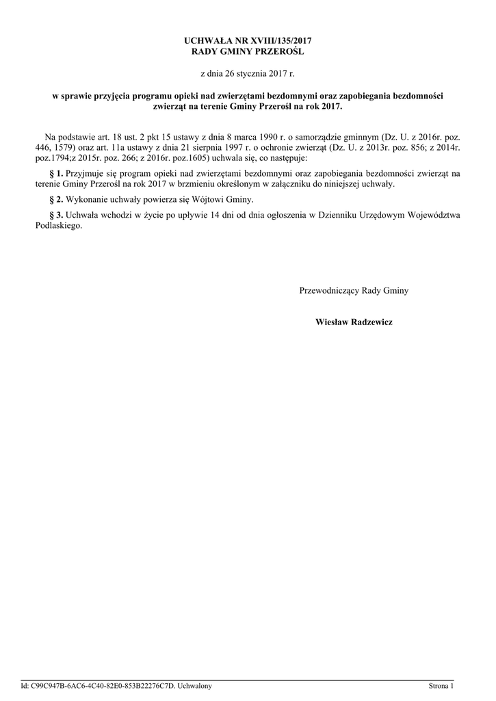 UCHWAŁA NR XVIII/135/2017 RADY GMINY PRZEROŚL z dnia 26 stycznia 2017 r. w sprawie przyjęcia programu opieki nad zwierzętami bezdomnymi oraz zapobiegania bezdomności zwierząt na terenie Gminy Przerośl na rok 2017. Na podstawie art. 18 ust. 2 pkt 15 ustawy z dnia 8 marca 1990 r. o samorządzie gminnym (Dz. U. z 2016r. poz. 446, 1579) oraz art. 11a ustawy z dnia 21 sierpnia 1997 r. o ochronie zwierząt (Dz. U. z 2013r. poz. 856; z 2014r. poz.1794;z 2015r. poz. 266; z 2016r. poz.1605) uchwala się, co następuje: § 1. Przyjmuje się program opieki nad zwierzętami bezdomnymi oraz zapobiegania bezdomności zwierząt na terenie Gminy Przerośl na rok 2017 w brzmieniu określonym w załączniku do niniejszej uchwały. § 2. Wykonanie uchwały powierza się Wójtowi Gminy. § 3. Uchwała wchodzi w życie po upływie 14 dni od dnia ogłoszenia w Dzienniku Urzędowym Województwa Podlaskiego. Przewodniczący Rady Gminy Wiesław Radzewicz Id: C99C947B-6AC6-4C40-82E0-853B22276C7D. Uchwalony Strona 1 Załącznik do uchwały Nr XVIII/135/2017 Rady Gminy Przerośl z dnia 26.01.2017r. Program opieki nad zwierzętami bezdomnymi oraz zapobiegania bezdomności zwierząt na terenie gminy Przerośl w 2017 r. Nadrzędnym celem Programu jest zapewnienie bezdomnym zwierzętom miejsca w schronisku dla zwierząt oraz zmniejszenie populacji bezdomnych zwierząt. Gmina Przerośl nie posiada własnego schroniska, ani możliwości jego budowy w najbliższym czasie. § 1. Odławianie bezdomnych zwierząt , zapewnienie bezdomnym zwierzętom miejsca w schronisku dla zwierząt 1. Na terenie gminy odławianie bezdomnych zwierząt będzie miało charakter stały w odniesieniu do pojedynczych zgłoszeń dotyczących pozostawionych bez opieki zwierząt, w szczególności chorych lub powodujących zagrożenie dla bezpieczeństwa. Zwierzęta te będą umieszczane w schronisku pn: Przedsiębiorstwo Prowadzenia Schronisk dla Bezdomnych Zwierząt Anna Maria Krajewska-Kuncewicz, Bystry 26, 11500 Giżycko, z którym podpisana jest umowa. 2. Zawarta umowa obliguje podmiot prowadzący schronisko do wyłapywania bezdomnych zwierząt, ich transportu, przyjmowania do schroniska i sprawowania opieki nad nimi. 3. Zgłoszenie o zwierzętach przebywających na terenach ogólnie dostępnych w obrębie gminy, co do których istnieje przypuszczenie, że są bezdomne, przyjmować będzie pracownik Urzędu Gminy Przerośl, który podejmie działania zmierzające do ustalenia właściciela bądź opiekuna zwierząt. 4. W przypadku nie ustalenia właściciela, bądź opiekuna zwierząt, Urząd Gminy Przerośl zawiadomi schronisko, z którym została zawarta umowa w celu odłowienia zwierzęcia i przetransportowania go oraz umieszczenia w schronisku i zapewnienia odpowiedniej opieki. 5. Wyłapywanie odbywać się będzie na podstawie zawartej umowy, w sposób nie stwarzający zagrożenia dla zdrowia i życia zwierząt oraz nie zadający im cierpienia. 6. Po odłowieniu zwierzęta będą przetransportowane środkiem transportu dopuszczonym do użytkowania, przystosowanym do transportu zwierząt, oznakowanym nazwą i adresem przedsiębiorcy, wyposażonym między innymi w: a). klatki i odpowiadające transportowanym zwierzętom, pozwalające na zachowanie naturalnej pozycji i ochronę przed uszkodzeniem ciała; b). zabezpieczenie przed niekontrolowanym wydostaniem się zwierząt; c). odpowiednią powierzchnię i kubaturę umożliwiającą swobodne ustawienie klatek oraz zabezpieczenie uniemożliwiające przesuwanie się klatek w czasie transportu; Id: C99C947B-6AC6-4C40-82E0-853B22276C7D. Uchwalony Strona 1 d). odpowiednią nawierzchnię zapewniającą przyczepność kończyn oraz umożliwiającą utrzymanie higieny; e). urządzenia zapewniające utrzymanie odpowiedniej wentylacji i temperatury, w celu zabezpieczenia zwierząt przed niekorzystnymi wpływami atmosferycznymi. 7. W czasie transportu zwierzęta winny mieć zapewnioną opiekę weterynaryjną, karmę i dostęp do wody. 8. Osoby zajmujące się wyłapywaniem, transportem i opieką nad zwierzętami muszą być odpowiednio przeszkolone. § 2. Opieka nad wolno żyjącymi kotami, w tym ich dokarmianie 1. Sprawowanie opieki nad wolno żyjącymi kotami realizowane będzie przez: a). zakup i ustawianie karmy w miejscach najczęściej, gdzie widywane będą zwierzęta; b). finansowanie leczenia zwierząt na podstawie porozumienia zawartego z gabinetem weterynarii określonym w § 7, ust.1. 2. W celu kontroli populacji kotów wolnożyjących gmina będzie finansowała zabiegi sterylizacji i kastracji zwierząt. § 3. obligatoryjną sterylizację albo kastrację zwierząt w schroniskach dla zwierząt 1. Sterylizacja lub kastracja dla zwierząt odbywa się w schronisku i jest metodą zmniejszenia populacji zgodną z ustawą o ochronie zwierząt. 2. W celu ograniczenia populacji bezdomnych zwierząt planuje się obligatoryjną sterylizację albo kastrację zwierząt odłowionych na terenie gminy i trafiających do schroniska, co powinno ograniczyć problem niekontrolowanego rozmnażania się zwierząt. § 4. usypianie ślepych miotów. 1. Gmina będzie pokrywała 100% kosztów uśpienia ślepych miotów psów lub kotów bezdomnych lub posiadających właścicieli zamieszkujących na terenie gminy. 2. Uśpieniu mogą podlegać wyłącznie zwierzęta, które jeszcze są ślepe i nie ma możliwości zapewnienia dla nich właścicieli. 3. Zabieg uśpienia przeprowadza wyłącznie lekarz weterynarii. § 5. poszukiwanie właścicieli dla bezdomnych zwierząt 1. Dla bezdomnych zwierząt umieszczonych w schronisku będą poszukiwani chętni właściciele poprzez zamieszczanie ogłoszeń o możliwości adopcji na stronie internetowej podmiotu prowadzącego schronisko. 2. W przypadku psów, których właścicieli nie zidentyfikowano, nastąpi etap poszukiwania chętnego opiekuna, jednakże gdy nie zostanie on znaleziony, pies ten zostanie przekazany do schroniska. Id: C99C947B-6AC6-4C40-82E0-853B22276C7D