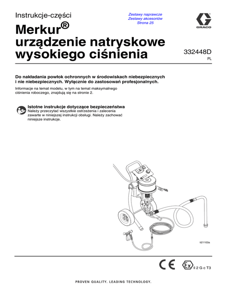Instrukcje-części ® Zestawy naprawcze Zestawy akcesoriów Strona 25 Merkur urządzenie natryskowe wysokiego ciśnienia 332448D PL Do nakładania powłok ochronnych w środowiskach niebezpiecznych i nie niebezpiecznych. Wyłącznie do zastosowań profesjonalnych. Informacje na temat modelu, w tym na temat maksymalnego ciśnienia roboczego, znajdują się na stronie 2. Istotne instrukcje dotyczące bezpieczeństwa Należy przeczytać wszystkie ostrzeżenia i zalecenia zawarte w niniejszej instrukcji obsługi. Należy zachować niniejsze instrukcje. ti21103a ll 2 G c T3 Powiązane instrukcje obsługi Spis treści Powiązane instrukcje obsługi . . . . . . . . . . . . . . . . . 2 Modele . . . . . . . . . . . . . . . . . . . . . . . . . . . . . . . . . . . . 3 Zestaw Merkur X48 . . . . . . . . . . . . . . . . . . . . . . . 3 Zestaw Merkur X72 . . . . . . . . . . . . . . . . . . . . . . . 3 Zestaw podstawowy . . . . . . . . . . . . . . . . . . . . . . 3 Ostrzeżenia . . . . . . . . . . . . . . . . . . . . . . . . . . . . . . . . 4 Montaż . . . . . . . . . . . . . . . . . . . . . . . . . . . . . . . . . . . . 6 Informacje ogólne . . . . . . . . . . . . . . . . . . . . . . . . 7 Przeszkolenie operatora . . . . . . . . . . . . . . . . . . . 7 Przygotowanie miejsca . . . . . . . . . . . . . . . . . . . . 7 Części . . . . . . . . . . . . . . . . . . . . . . . . . . . . . . . . . 7 Akcesoria przewodu powietrza . . . . . . . . . . . . . . 7 Uziemienie . . . . . . . . . . . . . . . . . . . . . . . . . . . . . . 8 Instalacja . . . . . . . . . . . . . . . . . . . . . . . . . . . . . . . 8 Eksploatacja . . . . . . . . . . . . . . . . . . . . . . . . . . . . . . . 9 Procedura usuwania nadmiaru ciśnienia . . . . . . . 9 Przepłukanie pompy przed pierwszym użyciem . 9 Blokada spustu . . . . . . . . . . . . . . . . . . . . . . . . . . 9 Naczynie „Wet Cup” . . . . . . . . . . . . . . . . . . . . . . 9 Płukanie . . . . . . . . . . . . . . . . . . . . . . . . . . . . . . . 10 Zalewanie . . . . . . . . . . . . . . . . . . . . . . . . . . . . . 11 Instalacja dyszy natryskowej . . . . . . . . . . . . . . . 12 Natryskiwanie . . . . . . . . . . . . . . . . . . . . . . . . . . 13 Wyłączenie . . . . . . . . . . . . . . . . . . . . . . . . . . . . 13 Konserwacja . . . . . . . . . . . . . . . . . . . . . . . . . . . . . . 14 Harmonogram przeglądów okresowych . . . . . . 14 Dokręcanie połączeń gwintowanych . . . . . . . . . 14 Naczynie „Wet Cup” . . . . . . . . . . . . . . . . . . . . . 14 Rozwiązywanie problemów . . . . . . . . . . . . . . . . . . 15 Naprawa . . . . . . . . . . . . . . . . . . . . . . . . . . . . . . . . . 16 Informacje ogólne . . . . . . . . . . . . . . . . . . . . . . . 16 Odłączenie pompy wyporowej . . . . . . . . . . . . . . 16 Ponowne podłączenie pompy wyporowej . . . . . 17 Odłączenie silnika powietrznego . . . . . . . . . . . . 18 Ponowne podłączenie silnika powietrznego . . . 18 Części . . . . . . . . . . . . . . . . . . . . . . . . . . . . . . . . . . . 20 Zestawy systemu . . . . . . . . . . . . . . . . . . . . . . . . 20 Części systemu pompy . . . . . . . . . . . . . . . . . . . 22 Zestaw do montażu na wózku 289694 . . . . . . . 23 Zestawy panelu sterowania wyłącznie pompy . . 24 Zestawy naprawcze . . . . . . . . . . . . . . . . . . . . . . . . 25 Akcesoria . . . . . . . . . . . . . . . . . . . . . . . . . . . . . . . . 25 2 Charakterystyka wydajności . . . . . . . . . . . . . . . . . 26 Merkur X48 proporcja 48:1, 75 cm3/cykl . . . . . . . . . . . . . 26 Merkur X72 proporcja 72:1, 50 cm3/cykl . . . . . . . . . . . . . 27 Wymiary . . . . . . . . . . . . . . . . . . . . . . . . . . . . . . . . . . 28 Dane techniczne . . . . . . . . . . . . . . . . . . . . . . . . . . . 29 Standardowa gwarancja firmy Graco . . . . . . . . . . 30 Powiązane instrukcje obsługi Instrukcja obsługi Opis 312796 Silnik pneumatyczny NXT™ 312145 Bezpowietrzny pistolet natryskowy XTR™5 i XTR™7 332246 Pompa wyporowa wysokiego ciśnienia Merkur 407055 Panel sterowania powietrzem 407053 Zestaw naprawczy uszczelnienia Merkur X48 407054 Zestaw naprawczy uszczelnienia Merkur X72 307296 Zbiorniki wyrównawcze wysokiego ciśnienia i filtry cieczy 308169 Filtry cieczy i smary 332448D Modele Modele Zestaw Merkur X48 Pistolet Część Pistolet Rozmiar końcówki 16U920 XTR504 0,019 Węże Akcesoria Wąż Wąż biczowy cieczy cieczy pistopistoletu letu ✔ ✔ Zestaw Maksymalne zaworu ciśnienie wlotowe Filtr spustocieczy wego MPa (bar, psi) 100 ✔ (1000, 14 503) Ssak ✔ Maksymalna szybMaksymalne kość ciśnienie robo- przepływu cze płynu cieczy MPa (bar, psi) gpm (lpm) 33 (330, 4800) 1,2 (4,5) Zestaw Merkur X72 Pistolet Część Pistolet Rozmiar końcówki 16U918 XTR704 0,019 Węże Akcesoria Wąż Wąż cieczy biczowy pistocieczy letu pistoletu Ssak ✔ ✔ ✔ Zestaw Maksymalne zaworu ciśnienie wloFiltr spustotowe cieczy wego MPa (bar, psi) 100 ✔ (1000, 14 503) Maksymalna szybMaksymalne kość ciśnienie robo- przepływu cze płynu cieczy MPa (bar, psi) gpm (lpm) 50 (500, 7200) 0,8 (3) Zestaw podstawowy Zestawy podstawowe nie zawierają pistoletu ani węża. Maksymalne ciśnienie robocze płynu MPa (bar, psi) Maksymalna szybkość przepływu cieczy gpm (lpm) Część Opis Maksymalne ciśnienie wlotowe MPa (bar, psi) 16V174 Merkur X72 100 (1000, 14 503) 50 (500, 7200) 0,8 (3) 16V175 Merkur X48 100 (1000, 14 503) 33 (330, 4800) 1,2 (4,5) Maksymalny zalecany rozmiar dyszy Model Rozmiar końcówki Merkur X72 0,021 Merkur X48 0,025 332448D 3 Ostrzeżenia Ostrzeżenia Poniższe ostrzeżenia dotyczą montażu, używania, ochrony przeciwporażeniowej, konserwacji i napraw tego urządzenia. Znak wykrzyknika oznacza ostrzeżenie ogólne, zaś symbol niebezpieczeństwa oznacza występowanie ryzyka specyficznego dla danej czynności. Gdy te symbole pojawiają się w treści podręcznika lub na etykietach ostrzeżenia, należy powrócić do niniejszych ostrzeżeń. W stosownych miejs