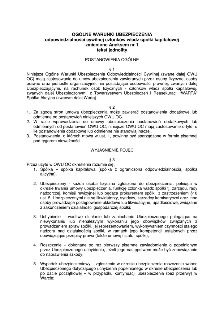 OGÓLNE WARUNKI UBEZPIECZENIA odpowiedzialności cywilnej członków władz spółki kapitałowej zmienione Aneksem nr 1 tekst jednolity POSTANOWIENIA OGÓLNE §1 Niniejsze Ogólne Warunki Ubezpieczenia Odpowiedzialności Cywilnej (zwane dalej OWU OC) mają zastosowanie do umów ubezpieczenia zawieranych przez osoby fizyczne, osoby prawne oraz jednostki organizacyjne, nie posiadające osobowości prawnej, zwanych dalej Ubezpieczającymi, na rachunek osób fizycznych - członków władz spółki kapitałowej, zwanych dalej Ubezpieczonymi, z Towarzystwem Ubezpieczeń i Reasekuracji “WARTA” Spółka Akcyjna (zwanym dalej Wartą). §2 1. Za zgodą stron umowa ubezpieczenia moŜe zawierać postanowienia dodatkowe lub odmienne od postanowień niniejszych OWU OC. 2. W razie wprowadzenia do umowy ubezpieczenia postanowień dodatkowych lub odmiennych od postanowień OWU OC, niniejsze OWU OC mają zastosowanie o tyle, o ile postanowienia dodatkowe lub odmienne nie stanowią inaczej. 3. Postanowienia, o których mowa w ust. 1, powinny być sporządzone w formie pisemnej pod rygorem niewaŜności. WYJAŚNIENIE POJĘĆ §3 Przez uŜyte w OWU OC określenia rozumie się: 1. Spółka – spółka kapitałowa (spółka z ograniczona odpowiedzialnością, spółka akcyjna). 2. Ubezpieczony - kaŜda osoba fizyczna zgłoszona do ubezpieczenia, pełniąca w okresie trwania umowy ubezpieczenia, funkcję członka władz spółki tj. zarządu, rady nadzorczej, komisji rewizyjnej lub będąca prokurentem spółki, z zastrzeŜeniem §10 ust. 5. Ubezpieczonymi nie są likwidatorzy, syndycy, zarządcy komisaryczni oraz inne osoby prowadzące postępowanie układowe lub likwidacyjne, upadłościowe, związane z zakończeniem działalności gospodarczej spółki; 3. Uchybienie – wadliwe działanie lub zaniechanie Ubezpieczonego polegające na niewykonaniu lub nienaleŜytym wykonaniu jego obowiązków związanych z prowadzeniem spraw spółki, jej reprezentowaniem, wykonywaniem czynności stałego nadzoru nad działalnością spółki, w ramach jego kompetencji ustalonych przez obowiązujące przepisy prawa (takŜe umowę i statut spółki); 4. Roszczenie – dokonane po raz pierwszy pisemne zawiadomienie o popełnionym przez Ubezpieczonego uchybieniu, jeŜeli jego następstwem moŜe być zobowiązanie do naprawienia szkody; 5. Wypadek ubezpieczeniowy – zgłoszenie w okresie ubezpieczenia roszczenia wobec Ubezpieczonego dotyczącego uchybienia popełnionego w okresie ubezpieczenia lub po dacie początkowej – w przypadku kontynuacji ubezpieczenia (bez przerwy) w Warcie; 6. Data początkowa – data początku okresu ubezpieczenia w pierwszej umowie ubezpieczenia odpowiedzialności cywilnej członków władz spółki zawartej w Warcie, przy zachowaniu kontynuacji ubezpieczenia (bez przerwy) w Warcie w kolejnych okresach ubezpieczenia; w przypadku braku kontynuacji ubezpieczenia, za datę początkową uwaŜa się datę początku okresu ubezpieczenia w pierwszej umowie ubezpieczenia zawartej w Warcie po przerwie; 7. Szkoda – wyraŜony w pieniądzu uszczerbek polegający na stracie finansowej poszkodowanego spowodowanej uchybieniem Ubezpieczonego; wszystkie skutki jednego uchybienia uwaŜa się za jedną szkodę; 8. Poszkodowany – kaŜdy, z wyłączeniem Ubezpieczonego, kto doznał szkody w wyniku uchybienia; 9. Spółka dominująca – w rozumieniu Kodeksu Spółek Handlowych; 10. Spółka zaleŜna – w rozumieniu Kodeksu Spółek Handlowych. PRZEDMIOT I ZAKRES UBEZPIECZENIA §4 1. Warta ubezpiecza odpowiedzialność cywilną Ubezpieczonego z tytułu uchybienia związanego z pełnieniem funkcji członka władz spółki, jeŜeli wypadek ubezpieczeniowy miał miejsce w okresie ubezpieczenia a Ubezpieczony jest zobowiązany do naprawienia szkody. 2. Warta jest zobowiązana do wypłaty odszkodowania w granicach sumy ubezpieczenia. 3. Warta jest zobowiązana równieŜ do: a) poniesienia niezbędnych kosztów wynagrodzenia rzeczoznawców powołanych przez Wartę lub za jej zgodą w celu ustalenia okoliczności uchybienia i rozmiarów szkody; b) zwrotu niezbędnych kosztów poniesionych przez Ubezpieczającego lub Ubezpieczonego mających na celu zapobieŜenie zwiększeniu się szkody lub zmniejszenie jej rozmiarów; c) poniesienia niezbędnych kosztów obrony sądowej przed roszczeniami poszkodowanego w sporze cywilnym lub niezbędnych kosztów postępowania pojednawczego pod warunkiem, Ŝe są one prowadzone zgodnie z zaleceniami Warty. 4. Koszty, o których mowa w ust. 3 pokrywane są w ramach sumy ubezpieczenia. 5. Ubezpieczeniem na zasadach określonych w ust. 1-4, objęte są równieŜ roszczenia skierowane przeciwko współmałŜonkowi Ubezpieczonego, z tytułu wspólności majątkowej, w związku z uchybieniem popełnionym przez Ubezpieczonego. 6. eŜeli ubezpieczenie nie jest kontynuowane w Warcie, umowa ubezpieczenia, która kończy nieprzerwany ciąg umów zawartych z Wartą, obejmuje roszczenia wobec Ubezpieczonego zgłoszone w okresie 12 kolejnych miesięcy po upływie okresu ubezpieczenia określonego w tej umowie, pod warunkiem, Ŝe roszczenia dotyczą uchybień popełnionych w okresie od daty początkowej do końca ostatniego z kolejnych okresów ubezpieczenia następujących po tej dacie. 7. Niniejsze OWU OC mają zastosowanie do roszczeń zgłoszonych na podstawie prawa polskiego i dochodzonych przed sądami polskimi. WYŁĄCZENIA ODPOWIEDZIALNOŚCI §5 1. Warta nie odpowiada za uchybienia będące następstwem umyślnego działania lub umyślnego zaniechania Ubezpieczonego lub jego pracowników, osób działających na zlecenie, w imieniu i na rzecz Ubezpieczającego w tym polegające na świadomym naruszeniu przepisów prawa, podjętych uchwał, przekroczeniu zakresu kompetencji określonych przez spółkę oraz zakresu udzielonych pełnomocnictw. 2. Warta nie odpowiada za uchybienia których następstwem są szkody: 1) wynikające z wykonywania przez Ubezpieczonego innych czynności niŜ okre