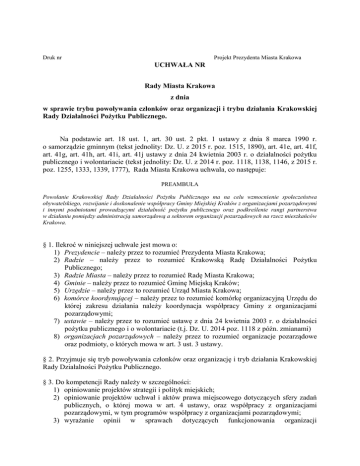 0b8003a4-f932-4f24-972c-f88cf1e8b085 Druk nr Projekt Prezydenta Miasta Krakowa UCHWAŁA NR Rady Miasta Krakowa z dnia w sprawie trybu powoływania członków oraz organizacji i trybu działania Krakowskiej Rady Działalności Pożytku Publicznego. Na podstawie art. 18 ust. 1, art. 30 ust. 2 pkt. 1 ustawy z dnia 8 marca 1990 r. o samorządzie gminnym (tekst jednolity: Dz. U. z 2015 r. poz. 1515, 1890), art. 41e, art. 41f, art. 41g, art. 41h, art. 41i, art. 41j ustawy z dnia 24 kwietnia 2003 r. o działalności pożytku publicznego i wolontariacie (tekst jednolity: Dz. U. z 2014 r. poz. 1118, 1138, 1146, z 2015 r. poz. 1255, 1333, 1339, 1777), Rada Miasta Krakowa uchwala, co następuje: PREAMBUŁA Powołanie Krakowskiej Rady Działalności Pożytku Publicznego ma na celu wzmocnienie społeczeństwa obywatelskiego, rozwijanie i doskonalenie współpracy Gminy Miejskiej Kraków z organizacjami pozarządowymi i innymi podmiotami prowadzącymi działalność pożytku publicznego oraz podkreślenie rangi partnerstwa w działaniu pomiędzy administracją samorządową a sektorem organizacji pozarządowych na rzecz mieszkańców Krakowa. § 1. Ilekroć w niniejszej uchwale jest mowa o: 1) Prezydencie – należy przez to rozumieć Prezydenta Miasta Krakowa; 2) Radzie – należy przez to rozumieć Krakowską Radę Działalności Pożytku Publicznego; 3) Radzie Miasta – należy przez to rozumieć Radę Miasta Krakowa; 4) Gminie – należy przez to rozumieć Gminę Miejską Kraków; 5) Urzędzie – należy przez to rozumieć Urząd Miasta Krakowa; 6) komórce koordynującej – należy przez to rozumieć komórkę organizacyjną Urzędu do której zakresu działania należy koordynacja współpracy Gminy z organizacjami pozarządowymi; 7) ustawie – należy przez to rozumieć ustawę z dnia 24 kwietnia 2003 r. o działalności pożytku publicznego i o wolontariacie (t.j. Dz. U. 2014 poz. 1118 z późn. zmianami) 8) organizacjach pozarządowych – należy przez to rozumieć organizacje pozarządowe oraz podmioty, o których mowa w art. 3 ust. 3 ustawy. § 2. Przyjmuje się tryb powoływania członków oraz organizację i tryb działania Krakowskiej Rady Działalności Pożytku Publicznego. § 3. Do kompetencji Rady należy w szczególności: 1) opiniowanie projektów strategii i polityk miejskich; 2) opiniowanie projektów uchwał i aktów prawa miejscowego dotyczących sfery zadań publicznych, o której mowa w art. 4 ustawy, oraz współpracy z organizacjami pozarządowymi, w tym programów współpracy z organizacjami pozarządowymi; 3) wyrażanie opinii w sprawach dotyczących funkcjonowania organizacji 0b8003a4-f932-4f24-972c-f88cf1e8b085 pozarządowych; 4) udzielanie pomocy i wyrażanie opinii w przypadku sporów między organami administracji publicznej a organizacjami pozarządowymi; 5) wyrażanie opinii w sprawach dotyczących zadań publicznych, w tym zlecania tych zadań do realizacji przez organizacje pozarządowe oraz w sprawach rekomendowanych standardów realizacji zadań publicznych; 6) promowanie dobrych praktyk współpracy Gminy z organizacjami pozarządowymi; 7) współpraca z Komisjami Dialogu Obywatelskiego; 8) współpraca z Małopolską Radą Działalności Pożytku Publicznego. § 4. 1. W skład Rady wchodzi: 1) czterech przedstawicieli Rady Miasta; 2) czterech przedstawicieli Prezydenta; 3) ośmiu przedstawicieli organizacji pozarządowych. 2. Na posiedzenia Rady mogą zostać zaproszeni niezależni eksperci, wybrani jako osoby zaufania publicznego, a także przedstawiciele Rady Miasta i Prezydenta oraz innych organizacji pozarządowych niezasiadający w Radzie. 3. Członków Rady powołuje i odwołuje Prezydent. 4. Członkowie Rady, reprezentujący organizacje pozarządowe, zostają wybrani spośród kandydatów zgłoszonych przez organizacje pozarządowe, zgodnie z zasadami określonymi w załączniku do niniejszej uchwały. 5. Członków Rady reprezentujących Radę Miasta wskazuje Przewodniczący Rady Miasta. 6. Członków Rady reprezentujących Prezydenta wskazuje Prezydent. § 5. 1. Rada wybierana jest na trzyletnią kadencję. 2. Członkiem Rady można być wybranym nieprzerwanie tylko w dwóch kadencjach. 3. Rada obraduje na posiedzeniach, zwoływanych nie rzadziej niż raz na 2 miesiące. 4. Rada działa na podstawie regulaminu pracy przyjętego na swoim pierwszym posiedzeniu. 5. Pierwsze posiedzenie Rady zwołuje Prezydent, a prowadzi je do czasu wyboru współprzewodniczących Rady wskazany przez Prezydenta członek Rady. 6. Rada na pierwszym posiedzeniu wybiera ze swojego grona dwóch współprzewodniczących oraz sekretarza. 7. Współprzewodniczący i sekretarz mogą zostać odwołani w trakcie kadencji w takim samym trybie jak zostali powołani. 8. Pracami Rady kierują rotacyjnie współprzewodniczący. 9. Posiedzenia Rady zwoływane są przez współprzewodniczącego Rady lub na wniosek co najmniej jednej trzeciej członków Rady. 10. Z każdego posiedzenia Rady sporządzany jest protokół, który podpisuje współprzewodniczący prowadzący posiedzenie lub w razie jego nieobecności sekretarz. Do każdego protokołu dołącza się listę obecności. 11. Rada może zadecydować o zorganizowaniu posiedzenia plenarnego z udziałem organizacji pozarządowych. 12. Rada może zaprosić przewodniczących komisji Rady Miasta na swoje posiedzenie. § 6. 1. Prezydent odwołuje członka Rady przed upływem kadencji: 1) na jego wniosek; 2) na wniosek Przewodniczącego Rady Miasta albo Prezydenta albo organizacji pozarządowych, jedynie w odniesieniu do członka reprezentującego odpowiednich przedstawicieli; 3) w przypadku skazania go prawomocnym wyrokiem za przestępstwo popełnione 0b8003a4-f932-4f24-972c-f88cf1e8b085 z winy umyślnej; 4) w przypadku powstania trwałej niezdolności do pełnienia obowiązków członka Rady z powodu choroby stwierdzonej orzeczeniem lekarskim; 5) w przypadku nieusprawiedliwionej nieobecności na trzech kolejnych posiedzeniach R