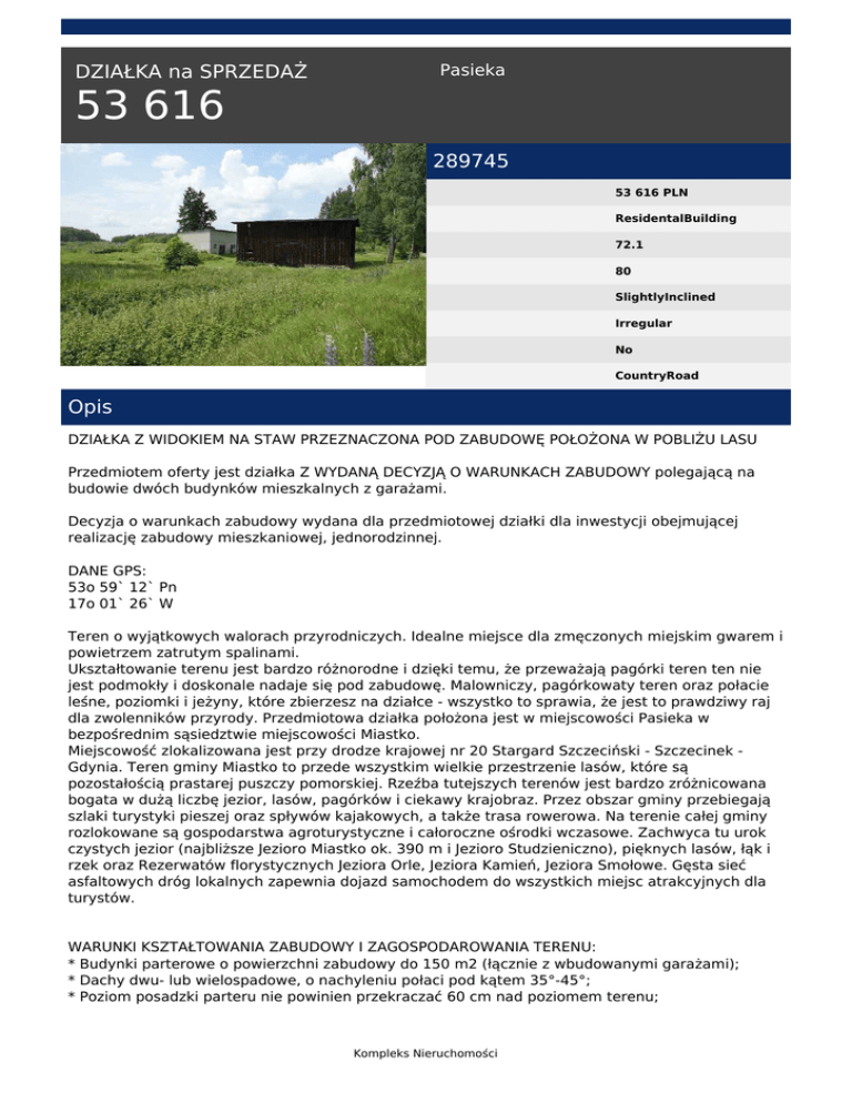 DZIAŁKA na SPRZEDAŻ Pasieka 53 616 289745 53 616 PLN ResidentalBuilding 72.1 80 SlightlyInclined Irregular No CountryRoad Opis DZIAŁKA Z WIDOKIEM NA STAW PRZEZNACZONA POD ZABUDOWĘ POŁOŻONA W POBLIŻU LASU Przedmiotem oferty jest działka Z WYDANĄ DECYZJĄ O WARUNKACH ZABUDOWY polegającą na budowie dwóch budynków mieszkalnych z garażami. Decyzja o warunkach zabudowy wydana dla przedmiotowej działki dla inwestycji obejmującej realizację zabudowy mieszkaniowej, jednorodzinnej. DANE GPS: 53o 59` 12` Pn 17o 01` 26` W Teren o wyjątkowych walorach przyrodniczych. Idealne miejsce dla zmęczonych miejskim gwarem i powietrzem zatrutym spalinami. Ukształtowanie terenu jest bardzo różnorodne i dzięki temu, że przeważają pagórki teren ten nie jest podmokły i doskonale nadaje się pod zabudowę. Malowniczy, pagórkowaty teren oraz połacie leśne, poziomki i jeżyny, które zbierzesz na działce - wszystko to sprawia, że jest to prawdziwy raj dla zwolenników przyrody. Przedmiotowa działka położona jest w miejscowości Pasieka w bezpośrednim sąsiedztwie miejscowości Miastko. Miejscowość zlokalizowana jest przy drodze krajowej nr 20 Stargard Szczeciński - Szczecinek Gdynia. Teren gminy Miastko to przede wszystkim wielkie przestrzenie lasów, które są pozostałością prastarej puszczy pomorskiej. Rzeźba tutejszych terenów jest bardzo zróżnicowana bogata w dużą liczbę jezior, lasów, pagórków i ciekawy krajobraz. Przez obszar gminy przebiegają szlaki turystyki pieszej oraz spływów kajakowych, a także trasa rowerowa. Na terenie całej gminy rozlokowane są gospodarstwa agroturystyczne i całoroczne ośrodki wczasowe. Zachwyca tu urok czystych jezior (najbliższe Jezioro Miastko ok. 390 m i Jezioro Studzieniczno), pięknych lasów, łąk i rzek oraz Rezerwatów florystycznych Jeziora Orle, Jeziora Kamień, Jeziora Smołowe. Gęsta sieć asfaltowych dróg lokalnych zapewnia dojazd samochodem do wszystkich miejsc atrakcyjnych dla turystów. WARUNKI KSZTAŁTOWANIA ZABUDOWY I ZAGOSPODAROWANIA TERENU: * Budynki parterowe o powierzchni zabudowy do 150 m2 (łącznie z wbudowanymi garażami); * Dachy dwu- lub wielospadowe, o nachyleniu połaci pod kątem 35°-45°; * Poziom posadzki parteru nie powinien przekraczać 60 cm nad poziomem terenu; Kompleks Nieruchomości * Budynki mogą być podpiwniczone i posiadać poddasza użytkowe;5 * Powierzchnie biologicznie czynne powinny stanowić co najmniej 80% powierzchni działki; MEDIA: * wodociąg i kanalizacja - w obrębie działek brak jest sieci wodociągowej i kanalizacyjnej, wobec powyższego zasilenie inwestycji w wodę następować będzie ze studni głębinowej, a odprowadzenie ścieków do zbiornika bezodpływowego lub przydomowej oczyszczalni ścieków, * energia elektryczna - przyłączenie do sieci na warunkach uzgodnionych z Energia-Opertator S.A. Działka położona jest przy prywatnej drodze wewnętrznej, dojazdowej z wjazdem od strony północno-wschodniej zaraz za małym budynkiem mieszkalnym. Dojazd do działki drogą wewnętrzną, której udział za 123 zł brutto zbywany jest wraz z działką. Południowa część działki jest położona wyżej - widokowo, z widokiem na staw na działce sąsiedniej. Teren działki został w ostatnim czasie oczyszczony z samosiewów i zarośli. Koszty pośrednictwa w całości pokrywa sprzedający NABYWAJĄCY PŁACI: PCC, taksę notarialną i opłatę sądową. Lucyna Bochner tel. 501-060-969, 515-779-784 tel. 515-779-784 email: [email protected] Kompleks Nieruchomości Powered by TCPDF (www.tcpdf.org)