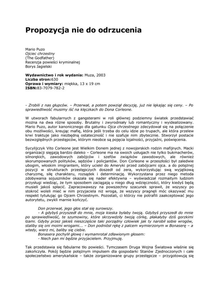 Propozycja nie do odrzucenia Mario Puzo Ojciec chrzestny (The Godfather) Recenzja powieści kryminalnej Borys Jagielski Wydawnictwo i rok wydania: Muza, 2003 Liczba stron:630 Oprawa i wymiary: miękka, 13 x 19 cm ISBN:83-7079-782-2 - Zrobili z nas głupców. – Przerwał, a potem powziął decyzję, już nie lękając się ceny. – Po sprawiedliwość musimy iść na klęczkach do Dona Corleone. W utworach fabularnych z gangsterami w roli głównej podziemny światek przedstawiać można na dwa różne sposoby. Brutalny i zwyrodniały lub romantyczny i wyidealizowany. Mario Puzo, autor kanonicznego dla gatunku Ojca chrzestnego zdecydował się na połączenie obu możliwości, kreując mafię, która jeśli trzeba do celu idzie po trupach, ale która przelew krwi traktuje jako niezbędną ostateczność i nie szafuje nim zbytecznie. Stworzył postacie bezwzględnych przestępców, którym nieobce są pojęcia lojalności, przyjaźni, poświęcenia. Sycylijczyk Vito Corleone jest Wielkim Donem jednej z nowojorskich rodzin mafijnych. Macki organizacji sięgają bardzo daleko – Corleone ma na swoich usługach nie tylko bukmacherów, silnorękich, zawodowych zabójców i szefów związków zawodowych, ale również skorumpowanych polityków, sędziów i policjantów. Don Corleone w przeszłości był zaledwie ubogim, włoskim imigrantem, który uciekł do Ameryki przed zabójcami ojca. a do potężnej pozycji w strukturach przestępczych doszedł od zera, wykorzystując swą wyjątkową charyzmę, siłę charakteru, rozsądek i determinację. Wykorzystana przez niego metoda zdobywania sojuszników okazała się nader efektywna – wyświadczał rozmaitym ludziom przysługi wiedząc, że tym sposobem zaciągają u niego dług wdzięczności, który kiedyś będą musieli jakoś spłacić. Zapracowawszy na powszechny szacunek sprawił, że wszyscy po stokroć woleli mieć w nim przyjaciela niż wroga, że wszyscy pragnęli móc okazywać mu respekt tytułując go Ojcem Chrzestnym. Pozostali, ci którzy nie potrafili zaakceptować jego autorytetu, zwykli marnie kończyć. Don przerwał, jego głos stał się surowszy. - A gdybyś przyszedł do mnie, moja kieska byłaby twoją. Gdybyś przyszedł do mnie po sprawiedliwość, te szumowiny, które skrzywdziły twoją córkę, płakałyby dziś gorzkimi łzami. Gdyby przez jakieś nieszczęście taki porządny człowiek jak ty narobił sobie wrogów, staliby się oni moimi wrogami... – Don podniósł rękę z palcem wymierzonym w Bonaserę – a wtedy, wierz mi, baliby się ciebie. Bonasera pochylił głowę i wymamrotał zdławionym głosem: - Niech pan mi będzie przyjacielem. Przyjmuję. Tak przedstawia się fabularne tło powieści. Tymczasem Druga Wojna Światowa właśnie się zakończyła. Pokój będzie potężnym impulsem dla gospodarki Stanów Zjednoczonych i całe społeczeństwo amerykańskie – także zorganizowane grupy przestępcze – przygotowują się do nadchodzących zmian. Na arenie mafijnych zainteresowań coraz większą rolę odgrywają narkotyki, lecz Don Corleone, człowiek z zasadami, nie ma zamiaru angażować się w tą gałąź czarnego biznesu. Jest mu ona nie w smak, podobnie jak prostytucja. Pragnie, by jego Rodzina czerpała profity z „czystszych” źródeł, z hazardu i ze związków zawodowych. Niestety. konserwatywna droga nieubłaganie prowadzi w stronę konfliktu z konkurencyjnymi mafiami... Ojciecchrzestny opowiada o genezie, początkach, przebiegu i zakończeniu wielkiej wojny Pięciu Rodzin Nowego Jorku z roku 1946. Główny wątek przeplatany jest epizodami, między innymi na przykładzie Johnny’ego Fontane, krewniaka Dona Corleone sami ocenić możemy, jak daleko sięgają wpływy Ojca Chrzestnego, a ze środkowej, retrospekcyjnej części powieści dowiadujemy się, jak tytułowy bohater powoli dochodził do swej potęgi. Wbrew pozorom starzejący się Vito Corleone przez większą część fabuły nie jest wcale postacią pierwszoplanową. Pokaźna część akcji rozgrywa się wokół najważniejszych popleczników Dona oraz jego synów. Jednemu z tych ludzi dane będzie przejąć imperium Corleone’ów i poprowadzić je dalej w trudnych czasach. Choć Ojciec chrzestny jest powieścią gangsterską, nie można zarzucić jej przesytu sensacyjnych motywów. Meritum nie zostało bowiem osadzone przy strzelaninach i pościgach samochodowych, lecz przy dialogach i opisach. Wątpiących mogę natychmiast zapewnić, że w książce napięcie występuje, a ponieważ odczuwamy je obserwując działalność gangu „od kuchni”, jest to nawet napięcie lepszego rodzaju. Mimo wszystko powieść ma do zaoferowania także garść sugestywnych mordów, a także – kilka scen erotycznych. (...) Z mroku za nim wystąpił jakiś mężczyzna i zarzucił mu na szyję cienki jedwabny sznur. Sznur się zacisnął dławiąc mu oddech. Twarz mu zsiniała, siła odpłynęła z ramion. (...) Trzymali go teraz za ręce z jakimś dziecinnym zaciekawieniem, podczas gdy człowiek za plecami (...) zaciskał coraz mocniej i mocniej sznur na jego szyi. Nagle podłoga stała się mokra i śliska. Zwieracz (...), nad którym już nie panował, otworzył się i odchody wypłynęły. Dzięki Mario Puzo poznajemy sposób funkcjonowania struktury mafijnej. Dowiadujemy się o rolach pełnionych przez consigliori i caporegimów. Zaznajamiamy się z dwiema nieodzownymi dla mafiosów zasadami – omertą, w myśl której wszystkie porachunki należy załatwiać we własnym gronie i vendettą, prawem zemsty, które obrazowo rzecz ujmując potrafiło doprowadzić do wzajemnego wyrzynania się całych pokoleń. Los czekający zdrajców Rodziny nie będzie chyba dla nikogo zaskoczeniem. Na popularność sztandarowego tytułu Mario Puzo bez wątpienia w znaczący sposób wpłynęła znakomita ekranizacja z Marlonem Brando, gdyż powieść sama w sobie jest tylko dobra, lecz z całą pewnością nie wybitna. Mimo oryginalnej i znakomic