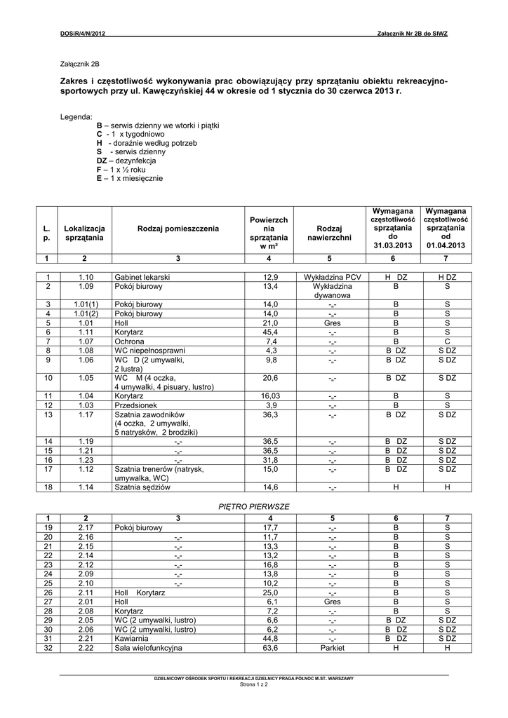 DOSiR/4/N/2012 Załącznik Nr 2B do SIWZ Załącznik 2B Zakres i częstotliwość wykonywania prac obowiązujący przy sprzątaniu obiektu rekreacyjnosportowych przy ul. Kawęczyńskiej 44 w okresie od 1 stycznia do 30 czerwca 2013 r. Legenda: B – serwis dzienny we wtorki i piątki C - 1 x tygodniowo H - doraźnie według potrzeb S - serwis dzienny DZ – dezynfekcja F – 1 x ½ roku E – 1 x miesięcznie L. p. Lokalizacja sprzątania Rodzaj pomieszczenia 1 2 3 1 2 1.10 1.09 3 4 5 6 7 8 9 1.01(1) 1.01(2) 1.01 1.11 1.07 1.08 1.06 10 1.05 11 12 13 1.04 1.03 1.17 14 15 16 17 1.19 1.21 1.23 1.12 18 1.14 1 19 20 21 22 23 24 25 26 27 28 29 30 31 32 2 2.17 2.16 2.15 2.14 2.12 2.09 2.10 2.11 2.01 2.08 2.05 2.06 2.21 2.22 Powierzch nia sprzątania w m² 4 Gabinet lekarski Pokój biurowy 12,9 13,4 Pokój biurowy Pokój biurowy Holl Korytarz Ochrona WC niepełnosprawni WC D (2 umywalki, 2 lustra) WC M (4 oczka, 4 umywalki, 4 pisuary, lustro) Korytarz Przedsionek Szatnia zawodników (4 oczka, 2 umywalki, 5 natrysków, 2 brodziki) -„-„-„Szatnia trenerów (natrysk, umywalka, WC) Szatnia sędziów Wymagana Wymagana częstotliwość częstotliwość Rodzaj nawierzchni sprzątania do 31.03.2013 sprzątania od 01.04.2013 5 6 7 H DZ B H DZ S 14,0 14,0 21,0 45,4 7,4 4,3 9,8 Wykładzina PCV Wykładzina dywanowa -„-„Gres -„-„-„-„- B B B B B B DZ B DZ S S S S C S DZ S DZ 20,6 -„- B DZ S DZ 16,03 3,9 36,3 -„-„-„- B B B DZ S S S DZ 36,5 36,5 31,8 15,0 -„-„-„-„- B B B B S DZ S DZ S DZ S DZ 14,6 -„- H H 5 -„-„-„-„-„-„-„-„Gres -„-„-„-„Parkiet 6 B B B B B B B B B B B DZ B DZ B DZ H 7 S S S S S S S S S S S DZ S DZ S DZ H DZ DZ DZ DZ PIĘTRO PIERWSZE 3 Pokój biurowy -„-„-„-„-„-„Holl Korytarz Holl Korytarz WC (2 umywalki, lustro) WC (2 umywalki, lustro) Kawiarnia Sala wielofunkcyjna 4 17,7 11,7 13,3 13,2 16,8 13,8 10,2 25,0 6,1 7,2 6,6 6,2 44,8 63,6 DZIELNICOWY OŚRODEK SPORTU I REKREACJI DZIELNICY PRAGA PÓŁNOC M.ST. WARSZAWY Strona 1 z 2 DOSiR/4/N/2012 33 34 35 36 37 38 2.20 2.18 KL 1 2.23 - Załącznik Nr 2B do SIWZ Pomieszczenie socjalne (blat, zlewy) WC (1 umywalka, lustro) Klatka schodowa Pokój biurowy Schody zewnętrzne Poręcze i balustrady/wszystkie 8,7 4,2 28,0 26,8 10,0 dł. 65 mb Wykładzina PCV Gres -„-„Stal kwasoodporna B B DZ B H B E E S S DZ CH S E E 6 H CH 7 H CH TEREN ZEWNĘTRZNY 1 39 40 41 2 -„-„-„- 3 Wejście główne (zamiatanie) Chodnik uliczny (zamiatanie) Okna 4 50 m² 720 m² 5 Kostka / gress Kostka Szkło F Uwaga: Utrzymanie porządku na chodniku wokół boiska, parkingu, wejściu głównym, chodniku ulicznym ma polegać na zamiataniu a w okresie opadów śniegu, gołoledzi na odśnieżaniu, posypywaniu piaskiem itp. Zastosowane do realizacji usługi materiały powinny być: 1) dopuszczone do obrotu handlowego i stosowania w tego typu obiektach, jak objęty niniejszym zamówieniem (posiadać atest PZH), 2) właściwe dla danego rodzaju nawierzchni, 3) dostosowane do poszczególnych funkcji obiektu (sala sportowa, sauna, szatnie itd.). Uwaga: - napełnianie dozowników powinno być regularne niedopuszczalne jest doprowadzenie do całkowitego opróżnienia dozowników, - dozowniki powinny być napełniane odpowiednimi art. czystościowymi: a) dozowniki do mydła przy umywalkach – mydło w płynie, b) dozowniki do mydła w prysznicach – żel pod prysznic, c) dozownika do ręczników – składane ręczniki papierowe, d) dozowniki do papieru toaletowego – papierem toaletowym e) wszystkie kosze na śmieci należy zabezpieczać workami o rozmiarach odpowiadającym rozmiarom koszy. Rodzaj, ilość i jakość sprzętu skierowanego do realizacji usługi powinien gwarantować prawidłową i płynną realizację zamówienia. Awarie i naprawy sprzętu nie mogą mieć wpływu na prawidłową jakość usługi. Serwis dzienny (częstotliwość oznaczona literą „S”) prowadzony w godzinach funkcjonowania obiektu obejmuje czynności w zakresie zapewniającym bieżącą obsługę obiektu i terenu zewnętrznego, w szczególności utrzymanie w odpowiedniej czystości pomieszczeń w szatni i urządzeń sanitarnych. Generalne sprzątanie obiektów (częstotliwość lit. C, E) odbywa się w zasadzie poza godzinami ich pracy w godzinach nocnych. Nie wyklucza to wykonywania w/w czynności w ciągu dnia pod warunkiem nie zakłócania w znaczący sposób funkcjonowania obiektów. DZIELNICOWY OŚRODEK SPORTU I REKREACJI DZIELNICY PRAGA PÓŁNOC M.ST. WARSZAWY Strona 2 z 2