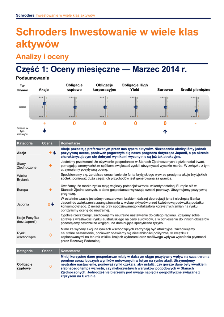 Schroders Inwestowanie w wiele klas aktywów Schroders Inwestowanie w wiele klas aktywów Analizy i oceny Część 1: Oceny miesięczne — Marzec 2014 r. Podsumowanie Akcje Obligacje rządowe Obligacje korporacyjne Obligacje High Yield Surowce Środki pieniężne + 0 0 0 0 - Typ aktywów Ocena Zmiana w tym miesiącu Kategoria Ocena Akcje + Stany Zjednoczone + Wielka Brytania - Europa + Japonia 0 Kraje Pacyfiku (bez Japonii) Rynki wschodzące Kategoria Obligacje rządowe 0 0 Ocena 0 Komentarze Akcje pozostają preferowanym przez nas typem aktywów. Nieznacznie obniżyliśmy jednak pozytywną ocenę, ponieważ pogorszyła się nasza prognoza dotycząca Japonii, a po okresie charakteryzującym się dobrymi wynikami wyceny nie są już tak atrakcyjne. Jesteśmy przekonani, że ożywienie gospodarcze w Stanach Zjednoczonych będzie nadal trwać, pomagając amerykańskim spółkom zwiększać zyski i utrzymywać wysokie marże. W związku z tym utrzymujemy pozytywną ocenę. Spodziewamy się, że dalsze umacnianie się funta brytyjskiego wywrze presję na akcje brytyjskich spółek, ponieważ duża część ich przychodów jest generowana za granicą. Uważamy, że marże zysku mają większy potencjał wzrostu w kontynentalnej Europie niż w Stanach Zjednoczonych, a dane gospodarcze wykazują oznaki poprawy. Utrzymujemy pozytywną prognozę. W ostatnim czasie jesteśmy rozczarowani brakiem dalszej deprecjacji jena i niechęcią Banku Japonii do zwiększenia zaangażowania w wykup aktywów przed kwietniową podwyżką podatku konsumpcyjnego. Z uwagi na brak spodziewanego katalizatora korzystnych zmian na rynku obniżyliśmy ocenę do neutralnej. Ogólnie rzecz biorąc, zachowujemy neutralne nastawienie do całego regionu. Zdajemy sobie sprawę z wrażliwości rynku australijskiego na ceny surowców, a w odniesieniu do innych obszarów pozostajemy ostrożni ze względu na dominujące specyficzne ryzyko. Mimo że wyceny akcji na rynkach wschodzących zaczynają być atrakcyjne, zachowujemy neutralne nastawienie, ponieważ obawiamy się niestabilności politycznej w związku z zaplanowanymi na ten rok w kilku krajach wyborami oraz możliwego wpływu wycofania płynności przez Rezerwę Federalną. Komentarze Mniej korzystne dane gospodarcze miały w dalszym ciągu pozytywny wpływ na czas trwania pomimo coraz lepszych wyników notowanych w lutym na rynku akcji. Utrzymujemy neutralne nastawienie, ponieważ rynki czekają, aby ustalić, czy gorsze dane były wynikiem słabnącego tempa wzrostu, czy niekorzystnych warunków pogodowych w Stanach Zjednoczonych. Jednocześnie bierzemy pod uwagę napięcia geopolityczne związane z kryzysem na Ukrainie. Stany Zjednoczone 0 Wielka Brytania 0 Europa 0 Japonia 0 Powiązane z inflacją w Stanach 0 Rynki wschodzące Kategoria Ocena Spodziewamy się, że Rezerwa Federalna będzie działać zgodnie z oczekiwaniami rynku i będzie w tym miesiącu kontynuować ograniczanie łagodzenia ilościowego. Jednakże zważywszy, że ograniczanie łagodzenia ilościowego zostało już uwzględnione w wycenach, pogorszenie się danych gospodarczych lub opóźnienie ograniczania prawdopodobnie będzie skutkowało wzrostami. Utrzymujemy pozytywną ocenę gospodarki Stanów Zjednoczonych w dłuższym horyzoncie czasowym i spodziewamy się zajęcia na pewnym etapie pozycji o ujemnym czasie trwania. Po okresie pozytywnego wzrostu, ostatnie mniej korzystne dane oraz spadek inflacji ograniczyły nadzieje na to, że Bank Anglii podejmie bardziej agresywne kroki i podniesie stopy procentowe przed połową 2015 roku. Spodziewamy się, że gospodarka Wielkiej Brytanii będzie w dłuższej perspektywie notować dobre wyniki, ale obecnie zachowujemy neutralne nastawienie do czasu trwania. W szczególności niemieckie obligacje skarbowe skorzystały na obserwowanej w ostatnim czasie tendencji poszukiwania jakości, ponieważ nastąpiła eskalacja kryzysu na Ukrainie. Podchodzimy ostrożnie do tej premii politycznej, ponieważ stabilizacja sytuacji może spowodować odwrócenie się trendu. Ponadto głównym źródłem niepokoju pozostaje deflacja, chociaż Mario Draghi zawiódł tych, którzy mieli nadzieję na łagodniejsze stanowisko EBC w jego niedawnym oświadczeniu. Mimo negatywnej oceny japońskich obligacji skarbowych i słabego wzrostu PKB w czwartym kwartale zachowujemy neutralne nastawienie do duration japońskich obligacji, biorąc pod uwagę ciągłe wsparcie Banku Japonii, który pozostaje głównym posiadaczem japońskich obligacji skarbowych. Presja inflacyjna w Stanach Zjednoczonych pozostaje stłumiona. Spodziewamy się, że słaby wzrost na rynkach wschodzących będzie w dalszym ciągu wywierać presję na spadek inflacji pomimo wzrostu cen w niektórych sektorach rolnictwa spowodowanego zeszłoroczną suszą. Połączenie rosnących napięć geopolitycznych, zaplanowanych w kilku krajach wyborów oraz spowolnienia w Chinach nie wpływa korzystnie na sytuację na rynkach wschodzących. Przyjęcie przez wiele banków centralnych defensywnej polityki pieniężnej spowodowało problemy z popytem krajowym. Komentarze Instrumenty kredytowe na poziomie inwestycyjnym Stany Zjednoczone - Europa + Kategoria Ocena Utrzymujemy negatywną ocenę amerykańskich obligacje korporacyjnych na poziomie inwestycyjnym. Stany Zjednoczone wyprzedzają Europę pod względem tempa ożywienia gospodarczego i w związku z tym są bliższe znormalizowania swojej polityki pieniężnej. Dane bilansowe zaczęły się pogarszać, a rosnąca aktywność w zakresie fuzji i przejęć może mieć niekorzystny wpływ, ponieważ spółki na poziomie inwestycyjnym są zwykle nabywcami. Negatywna ocena powinna być rozpatrywana względem europejskich obligacji korporacyjnych na poziomie inwestycyjnym. . Wiele europejskich spółek w dalszym ciągu na pierwszym miejscu stawia bezpieczeństwo i dlatego uważamy, że istnieje tu większy potencjał wzrostu niż w przypadku Stanów Zjednoczonych, gdzie rynek 