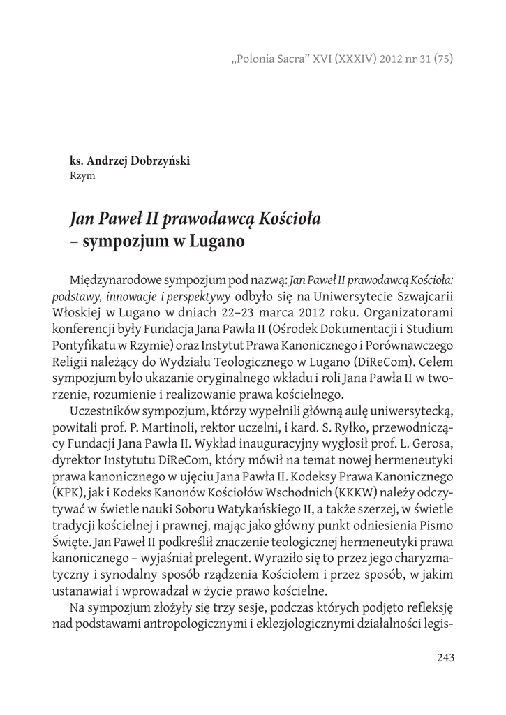 „Polonia Sacra” XVI (XXXIV) 2012 nr 31 (75) ks. Andrzej Dobrzyński Rzym Jan Paweł II prawodawcą Kościoła – sympozjum w Lugano Międzynarodowe sympozjum pod nazwą: Jan Paweł II prawodawcą Kościoła: podstawy, innowacje i perspektywy odbyło się na Uniwersytecie Szwajcarii Włoskiej w Lugano w dniach 22–23 marca 2012 roku. Organizatorami konferencji były Fundacja Jana Pawła II (Ośrodek Dokumentacji i Studium Pontyfikatu w Rzymie) oraz Instytut Prawa Kanonicznego i Porównawczego Religii należący do Wydziału Teologicznego w Lugano (DiReCom). Celem sympozjum było ukazanie oryginalnego wkładu i roli Jana Pawła II w tworzenie, rozumienie i realizowanie prawa kościelnego. Uczestników sympozjum, którzy wypełnili główną aulę uniwersytecką, powitali prof. P. Martinoli, rektor uczelni, i kard. S. Ryłko, przewodniczący Fundacji Jana Pawła II. Wykład inauguracyjny wygłosił prof. L. Gerosa, dyrektor Instytutu DiReCom, który mówił na temat nowej hermeneutyki prawa kanonicznego w ujęciu Jana Pawła II. Kodeksy Prawa Kanonicznego (KPK), jak i Kodeks Kanonów Kościołów Wschodnich (KKKW) należy odczytywać w świetle nauki Soboru Watykańskiego II, a także szerzej, w świetle tradycji kościelnej i prawnej, mając jako główny punkt odniesienia Pismo Święte. Jan Paweł II podkreślił znaczenie teologicznej hermeneutyki prawa kanonicznego – wyjaśniał prelegent. Wyraziło się to przez jego charyzmatyczny i synodalny sposób rządzenia Kościołem i przez sposób, w jakim ustanawiał i wprowadzał w życie prawo kościelne. Na sympozjum złożyły się trzy sesje, podczas których podjęto refleksję nad podstawami antropologicznymi i eklezjologicznymi działalności legis243 lacyjnej Jana Pawła II, ukazano, na czym polegała nowość w działalności konkordatowej podczas jego pontyfikatu, a także wskazano na wpływ promulgowanych kodeksów prawa kanonicznego na zbliżenie ekumeniczne chrześcijan. Moderatorami sesji byli kolejno ks. prof. B. Ferme (Wenecja), prof. P. Valdrini (Rzym), prof. L. Bombin (Rzym) i prof. P. de Mortanges (Fryburg). Pierwszą sesję otworzył wykład prof. F. D’Agostino z Uniwersytetu Tor Vergata zatytułowany Człowiek w centrum praw ustanowionych przez Jana Pawła II. Zasadzie hominum causa jus constitutum est papież nadał ewangeliczne znaczenie, to znaczy wskazał, że sprawiedliwość nie jest zakorzeniona w równowadze społecznej, politycznej lub ekonomicznej, lecz we właściwym pojęciu człowieka. Dlatego tak ważne było dla niego właściwe ujęcie prawa naturalnego, by uniknąć zarówno niebezpieczeństwa naturalizmu prawnego, jak i pozytywizmu. Prawo naturalne winno się wyrażać w szczegółowych normach prawa stanowionego. Bp J. I. Arieta, sekretarz Papieskiej Rady ds. Interpretacji Prawa, w swoim referacie przedstawił problematykę „eklezjologii komunii w prawodawstwie kanonicznym Jana Pawła II”. Zwrócił uwagę na podstawowe znaczenie teologii Ludu Bożego i kolegialności w doktrynie Vaticanum II w myśli Jana Pawła II. Jako jeden z ojców soborowych abp K. Wojtyła brał czynny udział w jej tworzeniu, a w okresie po Soborze uczestniczył w synodach. Doświadczenie to miało wpływ na sposób sprawowania prymatu Piotrowego przez Jana Pawła II. Podkreślał rolę kolegium biskupów i znaczenie Kościołów partykularnych. Wyraziło się to m.in. w końcowym etapie przygotowania KPK, na którym Jan Paweł II powołał dwie grupy ekspertów: jedną złożoną z prawników i drugą z duszpasterzy. W konstytucji Pastor Bonus, w której papież dokończył przeprowadzanie reformy Kurii Rzymskiej, wskazał na zasadę kolegialności i pomocniczości oraz zasady pastoralne, którymi winna kierować się ta istotna instytucja wspomagającą następcę św. Piotra w wypełnianiu jego misji. Sprecyzowaniu doktryny komunii w prawodawstwie kościelnym służyły także dokumenty takie, jak: list apostolski motu proprio Apostolos suos Jana Pawła II (o naturze teologicznej i prawnej konferencji episkopatów) czy też nota Communionis notio Kongregacji Nauki Wiary (o relacji między Kościołem powszechnym i Kościołami partykularnymi). Druga sesja zaczęła się od wykładu prof. G. Dalla Torre, rektora Uniwersytetu LUMSA w Rzymie i przewodniczącego Trybunału Stanu w Watykanie, który ukazał ogólny obraz działalności konkordatowej Jana Pawła II. Referent 244 podkreślił problematykę praw człowieka, która znalazła poczesne miejsce w układach ze Stolicą Apostolską, zabezpieczając formalnie m.in. nie tylko prawo do działalności Kościoła, lecz także prawo ludzi do sprzeciwu sumienia. Konkordaty nie były „koncesją” na działalność Kościoła, lecz stanowiły ustalenie warunków życia Kościoła w społeczności, złożonej, w większej lub mniejszej mierze, z Ludu Bożego, ludzi wierzących będących obywatelami konkretnego państwa. Układy konkordatowe były także otwarciem drogi do ustaleń legislacyjnych dla innych grup wyznaniowych, co poszerzało spectrum wolności religijnej i demokracji. Zawarte konkordaty służyły również legitymizacji nowo powstałych państw na arenie międzynarodowej. Referat Konkordat z Polską według zamysłu Jana Pawła II wygłosił bp T. Pieronek z Krakowa. Genezą konkordatu były rozmowy prowadzone przez wysłanników Watykanu (arcybiskupi A. Casaroli, L. Poggi, F. Colasuonno) z władzami komunistycznymi. Wraz z przemianami politycznymi po 4 czerwca 1989 roku wznowiono oficjalne relacje między Stolicą Apostolską i Polską oraz rozpoczęto przygotowania konkordatu, który podpisano w lipcu 1993 roku. Prelegent wyjaśnił problemy z ratyfikacją i podkreślił, że Jan Paweł II śledził losy konkordatu, lecz nie ingerował w proces wprowadzenia go w życie. Watykan nie godził się na propozycje jego modyfikacji, gdyż racje po temu miały charakter głównie polityczny. Został on w końcu ratyfikowany 23 lutego 1998 roku. W kolejn