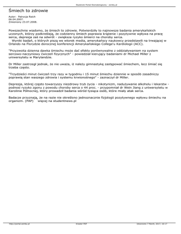 Studencki Portal Stomatologiczny - zemby.pl Śmiech to zdrowie Autor: Patrycja Raich 06.04.2007. Zmieniony 23.07.2008. Powszechnie wiadomo, że śmiech to zdrowie. Potwierdziły to najnowsze badania amerykańskich uczonych, którzy podkreślają, że codzienny śmiech poprawia krążenie i pozytywnie wpływa na pracę serca, depresja zaś na odwrót - zwiększa ryzyko śmierci na choroby serca. Wyniki badań, o których piszą we wtorek media, amerykańscy naukowcy przedstawili na trwającej w Orlando na Florydzie dorocznej konferencji Amerykańskiego College'u Kardiologii (ACC). "Przyzwoita dzienna dawka śmiechu może dać efekty porównywalne z oddziaływaniem na system sercowo-naczyniowy ćwiczeń fizycznych" - powiedział kierujący badaniami dr Michael Miller z uniwersytetu w Marylandzie. Dr Miller zastrzegł jednak, że nie uważa, iż należy gimnastykę zastępować śmiechem, lecz śmiać się trzeba często. "Trzydzieści minut ćwiczeń trzy razy w tygodniu i 15 minut śmiechu dziennie w sposób zasadniczy poprawią stan waszego zdrowia i systemu krwionośnego" - zaznaczył dr Miller. Depresja, której często towarzyszy niezdrowy tryb życia - nikotynizm, nadużywanie alkoholu i lekarstw podnosi ryzyko zgonu z powodu choroby serca o 44 proc. - przypomniał dr Wein Jiang z uniwersytetu w Karolinie Północnej, który prowadził badania wśród tysiąca osób, które miały atak serca. Badacze przyznają, że na razie nie określono jednoznacznie fizjologii pozytywnego wpływu śmiechu na organizm. (PAP) więcej na studentnews.pl http://portal.zemby.pl Kreator PDF Utworzono 7 March, 2017, 16:17