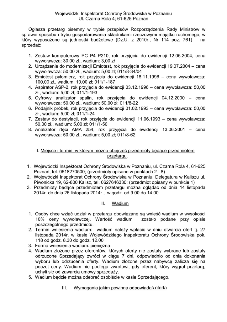 Wojewódzki Inspektorat Ochrony Środowiska w Poznaniu Ul. Czarna Rola 4; 61-625 Poznań Ogłasza przetarg pisemny w trybie przepisów Rozporządzenia Rady Ministrów w sprawie sposobu i trybu gospodarowania składnikami rzeczowymi majątku ruchomego, w który wyposażone są jednostki budżetowe (Dz.U. z 2010r., Nr 114 poz. 761) na sprzedaż: 1. Zestaw komputerowy PC P4 P210, rok przyjęcia do ewidencji 12.05.2004, cena wywoławcza: 30,00 zł., wadium: 3,00 zł 2. Urządzenie do modernizacji Emiotest, rok przyjęcia do ewidencji 19.07.2004 – cena wywoławcza: 50,00 zł., wadium: 5,00 zł; 011/8-34/04 3. Emiotest pyłomierz, rok przyjęcia do ewidencji 18.11.1996 – cena wywoławcza: 100,00 zł., wadium: 10,00 zł; 011/1-187 4. Aspirator ASP-2, rok przyjęcia do ewidencji 03.12.1996 – cena wywoławcza: 50,00 zł., wadium: 5,00 zł; 011/1-193 5. Cyfrowy analizator spalin, rok przyjęcia do ewidencji 04.12.2000 – cena wywoławcza: 50,00 zł., wadium: 50,00 zł; 011/8-22 6. Podajnik próbek, rok przyjęcia do ewidencji 01.02.1993 – cena wywoławcza: 50,00 zł., wadium: 5,00 zł; 011/1-24 7. Zestaw do destylacji, rok przyjęcia do ewidencji 11.06.1993 – cena wywoławcza: 50,00 zł., wadium: 5,00 zł; 011/1-50 8. Analizator rtęci AMA 254, rok przyjęcia do ewidencji 13.06.2001 – cena wywoławcza: 50,00 zł., wadium: 5,00 zł; 011/8-62 I. Miejsce i termin, w którym można obejrzeć przedmioty będące przedmiotem przetargu. 1. Wojewódzki Inspektorat Ochrony Środowiska w Poznaniu, ul. Czarna Rola 4, 61-625 Poznań, tel. 0618270500; (przedmioty opisane w punktach 2 - 8) 2. Wojewódzki Inspektorat Ochrony Środowiska w Poznaniu, Delegatura w Kaliszu ul. Piwonicka 19, 62-800 Kalisz, tel. 0627646330; (przedmiot opisany w punkcie 1) 3. Przedmioty będące przedmiotem przetargu można oglądać od dnia 14 listopada 2014r. do dnia 26 listopada 2014r., w godz. od 9.00 do 14.00 II. Wadium 1. Osoby chce wziąć udział w przetargu obowiązane są wnieść wadium w wysokości 10% ceny wywoławczej. Wartość wadium zostało podane przy opisie poszczególnego przedmiotu. 2. Termin wniesienia wadium: wadium należy wpłacić w dniu otwarcia ofert tj. 27 listopada 2014r. w kasie Wojewódzkiego Inspektoratu Ochrony Środowiska pok. 118 od godz. 8.30 do godz. 12.00 3. Forma wniesienia wadium: pieniężna 4. Wadium złożone przez oferentów, których oferty nie zostały wybrane lub zostały odrzucone Sprzedający zwróci w ciągu 7 dni, odpowiednio od dnia dokonania wyboru lub odrzucenia oferty. Wadium złożone przez nabywcę zalicza się na poczet ceny. Wadium nie podlega zwrotowi, gdy oferent, który wygrał przetarg, uchyli się od zawarcia umowy sprzedaży. 5. Wadium będzie można odebrać osobiście w kasie Sprzedającego. III. Wymagania jakim powinna odpowiadać oferta Wymagania jakim powinna odpowiadać oferta określa Formularz ofertowy. IV. Miejsce i termin złożenia ofert. Pisemną ofertę należy złożyć w budynku Wojewódzkiego Inspektoratu Ochrony Środowiska w Poznaniu, Ul. Czarna Rola 4; 61-625 Poznań, pok. 7a do dnia 27 listopada 2014r., godz. 12.30. V. Miejsce i termin otwarcia ofert Wojewódzki Inspektorat Ochrony Środowiska w Poznaniu, ul. Czarna Rola 4, 61625 Poznań, pok. 13., dnia 27 listopada 2014r. , o godz. 12:45 Termin związania ofertą. VI. 30 dni VII. Odrzucenie oferty Komisja przetargowa odrzuci ofertę jeżeli: 1. Została złożona po wyznaczonym terminie, w niewłaściwym miejscu lub przez oferenta, który nie wniósł wadium 2. Nie zawiera danych i dokumentów, których wymaga Sprzedający, lub są one niekompletne, nieczytelne lub budzą inną wątpliwość, zaś złożenie wyjaśnień mogłoby prowadzić do uznania jej za nową ofertę. 3. O odrzuceniu oferty komisja przetargowa niezwłocznie zawiadomi oferenta. VIII. Termin zawarcia umowy Umowa sprzedaży zostanie zawarta w w terminie nie dłuższym niż 10 dni od wyboru oferty. IX. Zamknięcie przetargu Zamawiającemu przysługuje prawo zamknięcia przetargu bez wybrania którejkolwiek ofert, bez podania przyczyn. X. Strona internetowa Szczegółowe informacje na temat przetargu znajdują się na stronie internetowej: http: www.bip.poznan.wios.gov.pl\majątek\majątekzbędny