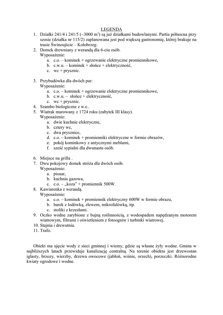 LEGENDA 1. Działki 241/4 i 241/5 (~3000 m2) są już działkami budowlanymi. Partia północna przy szosie (działka nr 115/2) zaplanowana jest pod większą gastronomię, której brakuje na trasie Świnoujście – Kołobrzeg. 2. Domek drewniany z werandą dla 6-ciu osób. Wyposażenie: a. c.o. – kominek + ogrzewanie elektryczne promiennikowe, b. c.w.u. – kominek + słońce + elektryczność, c. wc + prysznic. 3. Przybudówka dla dwóch par: Wyposażenie: a. c.o. – kominek + ogrzewanie elektryczne promiennikowe, b. c.w.u. – słońce + elektryczność, c. wc + prysznic. 4. Szambo biologiczne z w.c.. 5. Wiatrak murowany z 1724 roku (zabytek III klasy). Wyposażenie: a. dwie kuchnie elektryczne, b. cztery wc, c. dwa prysznice, d. c.o. – kominek + promienniki elektryczne w formie obrazów, e. pokój kominkowy z antycznymi meblami, f. sześć sypialni dla dwunastu osób. 6. Miejsce na grilla . 7. Dwu pokojowy domek stróża dla dwóch osób. Wyposażenie: a. pisuar, b. kuchnia gazowa, c. c.o. – „koza” + promiennik 500W. 8. Kawiarenka z werandą. Wyposażenie: a. c.o. – kominek + promiennik elektryczny 600W w formie obrazu, b. barek z lodówką, zlewem, mikrofalówką, itp. c. stoliki z krzesłami. 9. Oczko wodne zarybione z bujną roślinnością, z wodospadem napędzanym motorem wiatrowym, filtrami i oświetleniem z fotoogniw i turbinki wiatrowej. 10. Stajnia i drewutnia. 11. Trafo. Obiekt ma ujęcie wody z sieci gminnej i wiemy, gdzie są własne żyły wodne. Gmina w najbliższych latach przewiduje kanalizację centralną. Na terenie obiektu jest drzewostan iglasty, brzozy, wierzby, drzewa owocowe (jabłoń, wiśnie, orzech), porzeczki. Różnorodne kwiaty ogrodowe i wodne. - dwie działki – 3,6 ara i ~11 arów powinny zostać dokupione w celu wyrównania granic. To zakup minimum. Natomiast działka 113, o pow. ~2ha jest też jeszcze do kupienia i wtedy byłby to kompleks wczasowy ze stawem, kortem tenisowym, wybiegiem dla koni, itp. Cały obiekt od 2001r. jest w dyspozycji biura podróży Wolters Raisen w Bremie i TUI. Przez cały rok te biura przysyłają nam grupy osób i bez względu na ilość tych osób (od jednej pary do max 11-14) koszt pobytu to 550-850 EU za tydzień plus dodatkowo ze elektryczność, wodę, drewno kominkowe i parę innych drobiazgów. Zawsze mamy rezerwację z ich strony. Z poważaniem Józef Jaszczerski