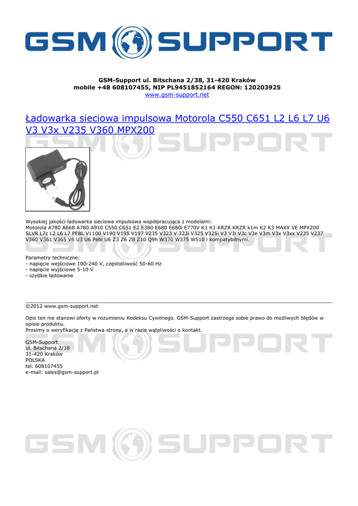 GSM-Support ul. Bitschana 2/38, 31-420 Kraków mobile +48 608107455, NIP PL9451852164 REGON: 120203925 www.gsm-support.net Ładowarka sieciowa impulsowa Motorola C550 C651 L2 L6 L7 U6 V3 V3x V235 V360 MPX200 Wysokiej jakości ładowarka sieciowa impulsowa współpracująca z modelami: Motorola A780 A668 A780 A910 C550 C651 E2 E380 E680 E680i E770V K1 K1 KRZR KRZR k1m K2 K3 MAXX VE MPX200 SLVR L7c L2 L6 L7 PEBL V1100 V190 V195 V197 V235 V323 V 323i V325 V325i V3 V3i V3c V3e V3m V3x V3xx V235 V237 V360 V361 V365 V6 U3 U6 Pebl U6 Z3 Z6 Z8 Z10 Q9h W370 W375 W510 i kompatybilnymi. Parametry techniczne: - napięcie wejściowe 100-240 V, częstotliwość 50-60 Hz - napięcie wyjściowe 5-10 V - szybkie ładowanie ©2012 www.gsm-support.net Opis ten nie stanowi oferty w rozumieniu Kodeksu Cywilnego. GSM-Support zastrzega sobie prawo do możliwych błędów w opisie produktu. Prosimy o weryfikację z Państwa strony, a w razie wątpliwości o kontakt. GSM-Support ul. Bitschana 2/38 31-420 Kraków POLSKA tel. 608107455 e-mail: [email protected] Powered by TCPDF (www.tcpdf.org)