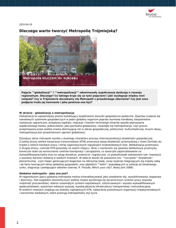 2010-04-19 Dlaczego warto tworzyć Metropolię Trójmiejską? Pojęcia ""globalizacji"" i ""metropolizacji"" zdominowały współczesną dyskusję o rozwoju regionalnym. Dlaczego? Co takiego kryje się za tymi pojęciami i jaki występuje między nimi związek? Czy w Trójmieście doczekamy się Metropolii z prawdziwego zdarzenia? Czy jest sens podjęcia trudu jej tworzenia i jaka powinna ona być? W skrócie - globalizacja a metropolizacja Globalizacja to najważniejszy proces kształtujący współczesne stosunki gospodarczo-społeczne. Zjawisko scalania się narodowych systemów gospodarczych w jeden globalny organizm poprzez wymianę handlową, bezpośrednie inwestycje zagraniczne, przepływy kapitału, migracje i transfer technologii zmieniło sposób pojmowania współczesnego świata. Jednocześnie, jako pochodna globalizacji, rozwinęła się metropolizacja, czyli proces przejmowania przez wielkie miasta dominującej roli w sferze gospodarczej, politycznej i kulturotwórczej. Innymi słowy, metropolizacja jest przestrzennym ujęciem globalizacji. Dzisiejszy obraz metropolii wynika z dualnego charakteru procesu internacjonalizacji działalności gospodarczej. Z jednej strony wielkie korporacje transnarodowe (KTN) przenoszą swoją działalność przemysłową z miast Zachodu do krajów o niskich kosztach pracy i mniej rygorystycznych regulacjach środowiskowych (tzw. delokalizacja przemysłu). Z drugiej strony, centrale KTN pozostały na swoim miejscu. Wraz z nasileniem się zjawiska delokalizacji przemysłu, konieczne stało się wzmocnienie centrów koordynacji i zarządzania, co stworzyło zapotrzebowanie na wykwalifikowaną kadrę oraz na usługi doradcze, prawnicze i logistyczne, co poskutkowało wdrożeniem tzw. inwestycji o wysokiej wartości dodanej w wielkich miastach. W efekcie doszło do powstania tzw. ""szczytów"" działalności ekonomicznej - czyli miejsc generujących bogactwo na olbrzymią skalę, coraz szybciej integrujących się między sobą i de facto tworzących obraz globalnej gospodarki, oraz głębokich ""dolin"" popadających w izolację od światowego rynku, stagnację i postępujące ubóstwo (szerzej: R. Floryda, Who's your city?, Nowy Jork 2008). Globalna metropolia - jaka ona jest? W najprostszym ujęciu globalną metropolię można scharakteryzować jako uosobienie siły, wysublimowania, bogactwa i dominacji. Pod względem ekonomicznym wielkie miasta wyróżniają się dynamicznym rynkiem pracy (wysoka mobilność pracowników), dobrze rozwiniętym rynkiem kapitałowym, zróżnicowanym i wysoko wykwalifikowanym społeczeństwem, poziomem edukacji wyższej, wysoką jakością infrastruktury transportowej i komunikacyjnej. W wielkich miastach znajdują się siedziby największych KTN, najbardziej prestiżowych organizacji międzynarodowych i koncernów medialnych, które promują metropolitalny styl życia. 1 Dwumiesięcznik Foreign Policy, w przygotowanym przez siebie rankingu Globalnych Miast (Global Cities Index 2008, Foreign Policy, październik 2008), wprost stwierdził, że ""historia globalizacji to historia urbanizacji"". Globalne miasta z pierwszych miejsc rankingowych, m.in. Nowy Jork, Londyn, Paryż i Tokio, to najbardziej zintegrowane z gospodarką światową i najbardziej otwarte na kontakty zagraniczne miejsca, a zarazem najbogatsze miasta świata. Plasują się również w czołówce pod względem ilości tworzonych innowacji i rejestrowanych patentów, głównie dzięki temu, że są najczęściej wybieranym miejscem do życia i pracy przez najlepszych światowych naukowców. In statu nascendi ""In statu nascendi"" znaczy ""tworzący się"" - takim mianem ś.p. prof. Jerzy Kołodziejski określił Metropolię Trójmiejską. W tych słowach została zawarta diagnoza stanu ówczesnego rozwoju Trójmiasta (który niestety nie zmienił się diametralnie, mimo że od śmierci p. prof. minęło niemal 10 lat) i jednocześnie kierunek w jakim władze lokalne powinny zmierzać. Obecnie Trójmiasto przypomina raczej zlepek autonomicznych, niekiedy skłóconych, podmiotów. Poza okazjonalnymi wspólnymi akcjami promocyjnymi, powołaną Radą Metropolitalną i biletem metropolitalnym, niewiele świadczy o woli władz lokalnych, aby współtworzyć spójną, dynamiczną i silną metropolię. Z pewnością brak ustawy metropolitalnej, którą szumnie zapowiadano jeszcze na początku 2008 roku jako jeden z priorytetów rządu Platformy i PSL, hamuje proces integracji. Właśnie dla takich regionów jak Trójmiasto czy konurbacja śląska ta ustawa jest niezbędna - bez jasnych ram prawnych znacznie trudniej o tworzenie obszarów metropolitalnych z prawdziwego zdarzenia. Wobec braku politycznej woli uchwalenia ustawy, samorządy muszą we własnym zakresie starać się budować metropolię. Do głównych wyzwań leżących przed Trójmiastem należy w pierwszej kolejności zapewnienie spójności komunikacyjnej w obrębie obszaru aglomeracji. Aktualnie sprawa wspólnego biletu, który wydatnie przyczyniłby się do poprawy funkcjonowania transportu publicznego, utknęła w martwym punkcie. Do jego wprowadzenia konieczna jest komunalizacja SKM-ki, na którą samorządów Gdańska, Sopotu i Gdyni w czasach kryzysu i niższych wpływów budżetowych nie stać. Dobrym projektem w tym zakresie jest Pomorska Kolej Metropolitalna, która w przyszłości połączy Gdańsk z Gdynią via Rębiechowo. Obecnie cały czas tworzone jest studium wykonalności, a pierwsze prace na linii Wrzeszcz-Rębiechowo mają zacząć się w przyszłym roku i zakończyć się w 2014 lub 2015 roku. Innym przykładowym wyzwaniem jest stworzenie spójnej marki Trójmiasta i planu jej promocji. Obejmuje to zarówno wybranie nazwy dla metropolii (nazwą Metropolia Trójmiejska posługuję się roboczo - przyp. autora), odpowiedniego logotypu i strategii komunikacji marketingowej, podkreślającej konkretne atuty całej metropolii (położenie nad morzem, wysoka jakość życia w Sopo