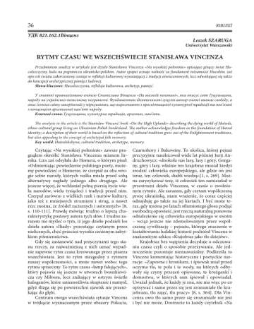 36 ЮВІЛЕЇ УДК 821.162.1Вінценз Leszek SZARUGA Uniwersytet Warszawski RYTMY CZASU WE WSZECHŚWIECIE STANISŁAWA VINCENZA Przedmiotem analizy w artykule jest dzieło Stanisława Vincenza «Na wysokiej połoninie» opisujące ginący świat Huculszczyzny, ludu na pograniczu ukraińsko-polskim. Autor epopei uznaje wolność za fundament tożsamości Hucułów, zaś opis ich świata zakorzeniony zostaje w refleksji kulturowej wyrastającej z tradycji oświeceniowych, lecz odwołującej się także do koncepcji archetypicznej pamięci ludowej. Słowa kluczowe: Huculszczyzna, refleksjа kulturowа, archetyp, pamięć. У статті проаналізовано епопею Станіслава Вінценза «На високій полонині», яка описує світ Гуцульщини, народу на українсько-польському пограниччі. Фундаментом ідентичності гуцулів автор епопеї вважає свободу, а опис їхнього світу закорінений у міркуваннях, що виростають з просвітницької культурної традиції та пов’язані з концепцією архетипної пам’яті народу. Ключові слова: Гуцульщина, культурна традиція, архетип, пам’ять. The analysis in the article is the Stanislaw Vincenz’ book «On the High Uplands» describing the dying world of Hutsuls, ethno-cultural group living on Ukrainian-Polish borderland. The author acknowledges freedom as the foundation of Hutsul identity; a description of their world is based on the reflection of cultural tradition grew out of the Enlightenment traditions, but also appealing to the concept of archetypal folk memory. Key world: Hutsulshchyna, cultural tradition, archetype, memory. Czytając «Na wysokiej połoninie» zawsze pragnąłem określić Stanisława Vincenza mianem lirnika. Lira zaś odsyłała do Homera, o którym pisał: «Odmieniając powiedzenie polskiego poety, możemy powiedzieć o Homerze, że cierpiał za oba wrogie sobie narody, których walka miała przed sobą alternatywę zagłady jednego albo drugiego. Ale jeszcze więcej, że wchłaniał pełną piersią życie wielu narodów, wielu tysiącleci i tradycji przed nim. Czerpał zarówno z wielkich rzek i nurtów kultury, jako też z mniejszych strumieni i strug, a nawet rzec można, ze źródeł zacisznych i ustronnych» [8, s. 110-111]. Prawdę mówiąc trudno o lepszą charakterystykę postawy autora tych słów. I trudno zarazem nie myśleć o tym, iż jego dzieło podzieli los dzieła autora «Iliady» pozostając czytanym przez nielicznych, choć przecież wysoko cenionym zabytkiem piśmiennictwa. Gdy się zastanowić nad przyczynami tego stanu rzeczy, za najważniejszą z nich uznać wypadnie zapewne rytm czasu kreowanego przez pisarza wszechświata. Jest to rytm niezgodny z rytmem naszej współczesności, a może nawet wobec tego rytmu sprzeczny. To rytm czasu «lamp falujących», który pojawia się jeszcze w utworach Iwaszkiewicza czy Miłosza, lecz znikający w ostrym świetle halogenów, które uniemożliwia skupienie i namysł, gdyż ślizga się po powierzchni zjawisk nie przenikając do głębi. Centrum owego wszechświata sytuuje Vincenz w trójkącie wyznaczanym przez obszary Pokucia, Czarnohory i Bukowiny. To okolica, której pejzaż precyzyjnie naszkicował wiele lat później Jurij Andruchowycz: «dookoła nas lasy, lasy i góry, Gorgany, góry i lasy, właśnie ten krajobraz musiał kiedyś zrodzić człowieka europejskiego, ale gdzie on jest teraz, ten człowiek, diabli wiedzą»[1, s. 269]. Można zaryzykować tezę, iż człowiek ten zamieszkał w przestrzeni dzieła Vincenza, w czasie o zwolnionym rytmie. Ale zarazem, gdy czytam współczesną prozę ukraińską, mam wrażenie, że coraz częściej odnajduję go także na jej kartach. I być może teraz, gdy można po latach stłumionego głosu podjąć swobodną opowieść, jest rzeczą naturalną ponowne odnalezienie się człowieka europejskiego w swoim – wciąż jeszcze nie zdemolowanym przez współczesną cywilizację – pejzażu, którego znaczenie w kształtowaniu ludzkiej historii podniósł Vincenz w znakomitym szkicu «Krajobraz jako tło dziejów». Krajobraz bez wątpienia decyduje o odczuwaniu czasu czyli o sposobie przeżywania. Ale jednocześnie pozostaje niezauważalny. Podkreśla to Vincenz komentując historyczne i poetyckie narracje: «Zapewne i kronikarz, i śpiewak miał przed oczyma tło, te pola i te wody, na których odbywały się czyny przezeń opiewane, te krużganki i domostwa, w których sam śpiewał i opowiadał. Uważał jednak, że każdy je zna, nie ma więc po co opisywać i samo przez się jest zrozumiałe tło krajobrazu, tło zajęć, tło pracy» [8, s. 364]. Dla Vincenza owo tło samo przez się zrozumiałe nie jest i być nie może. Dostrzeże to każdy czytelnik «Na Leszek SZARUGA RYTMY CZASU WE WSZECHŚWIECIE STANISŁAWA VINCENZA wysokiej połoninie» – zgromadzone tu opowieści są doskonale osadzone w pejzażu, który jest dlań przede wszystkim skarbnicą dziejów, które się w nim rozgrywały i są w nim, jak palimpsest, zapisane kolejnymi warstwami. Ale oczywiście nie tylko o krajobraz tu chodzi, także o lud – w tym wypadku o Hucułów – przez ten pejzaż ukształtowany i który, by posłużyć się słowami Zbigniewa Herberta «będzie niósł Miasto w sobie po drogach wygnania» [3, s. 372]. Owo symboliczne Miasto to miejsce wyróżnione, centrum świata, które odnaleźć można choćby w Pensylwanii. Jak pisze bowiem Andruchowycz: «Tam jest nawet takie rusko-karpackie miasteczko – Centralia», stanowiące dlań centrum Europy. Dlaczego? «Dlatego – czytamy – że tam mieszkają Łemkowie. Przynieśli swoje centrum ze sobą – tak jak swoją drewniana cerkiew. 