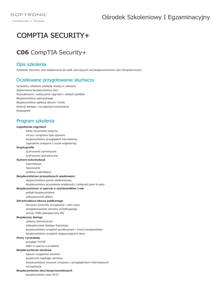 Ośrodek Szkoleniowy I Egzaminacyjny COMPTIA SECURITY+ C06 CompTIA Security+ Opis szkolenia Szkolenie Security+ jest dedykowane do osób zajmujących się bezpieczeństwem sieci komputerowych. Oczekiwane przygotowanie słuchaczy Uczestnicy szkolenia zdobędą wiedzę w zakresie: Zapewniania bezpieczeństwa sieci Wyszukiwania i wykluczania zagrożeń i słabych punktów Bezpieczeństwa operacyjnego Bezpieczeństwa aplikacji danych i hosta Kontroli dostępu i zarządzania tożsamością Kryptografii Program szkolenia Łagodzenie zagrożeń istota utrzymania systemu wirusy i programy typu spyware bezpieczeństwo przeglądarki internetowej zagrożenia związane z social engineering Kryptografia szyfrowanie symetryczne szyfrowanie asymetryczne System autentykacji autentykacja haszowanie systemy autentykacji Bezpieczeństwo przesyłanych wiadomości bezpieczeństwo poczty elektronicznej bezpieczeństwo przesyłania wiadomości i połączeń peer-to-peer Bezpieczeństwo w oparciu o użytkowników i role polityki bezpieczeństwa zabezpieczanie plików Infrastruktura klucza publicznego kluczowe elementy zarządzania i cyklu życia przygotowywanie serwera certyfikującego serwer WEB zabezpieczony PKI Bezpieczny dostęp systemy biometryczne zabezpieczanie dostępu fizycznego bezpieczeństwo urządzeń peryferyjnych i innych komponentów bezpieczeństwo urządzeń magazynujących dane Porty i protokoły przegląd TCP/IP ataki w oparciu o protokoły Bezpieczeństwo sieciowe typowe urządzenia sieciowe bezpieczne topologie sieciowe bezpieczeństwo sieciowe związane z przeglądarkami internetowymi wirtualizacja Bezpieczeństwo sieci bezprzewodowych bezpieczeństwo sieci Wi-Fi bezpieczeństwo sieci Wi-Fi urządzenia sieci bezprzewodowych Bezpieczny zdalny dostęp zdalny dostęp VPN Audytowanie, logowanie i monitorowanie logowanie systemowe monitorowanie serwerów Testowanie podatności ryzyko i ocena podatności systemy IDS i IPS zbieranie dowodów Organizacja bezpieczeństwa polityki szkolenia utylizacja Ciągłość biznesowa planowanie nadmiarowości archiwizacja badanie środowisk Czas trwania 5 dni Cena netto + VAT 3200zł (+VAT wg obowiązującej stawki) Autoryzowane przez Przygotowuje do egzaminu CopTIA Security+ SY0-401
