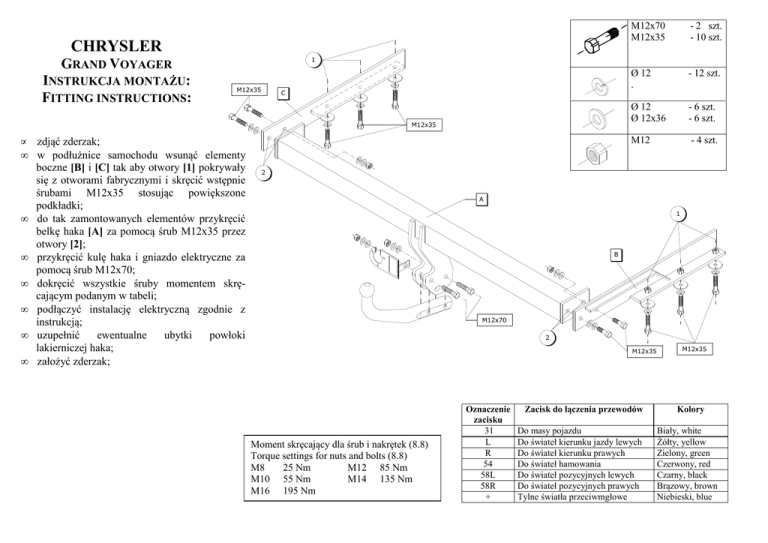 CHRYSLER M12x35 • • • • • • Ø 12 . - 12 szt. Ø 12 Ø 12x36 - 6 szt. - 6 szt. M12 - 4 szt. C M12x35 • • - 2 szt. - 10 szt. 1 GRAND VOYAGER INSTRUKCJA MONTAŻU: FITTING INSTRUCTIONS: M12x70 M12x35 zdjąć zderzak; w podłużnice samochodu wsunąć elementy boczne [B] i [C] tak aby otwory [1] pokrywały się z otworami fabrycznymi i skręcić wstępnie śrubami M12x35 stosując powiększone podkładki; do tak zamontowanych elementów przykręcić belkę haka [A] za pomocą śrub M12x35 przez otwory [2]; przykręcić kulę haka i gniazdo elektryczne za pomocą śrub M12x70; dokręcić wszystkie śruby momentem skręcającym podanym w tabeli; podłączyć instalację elektryczną zgodnie z instrukcją; uzupełnić ewentualne ubytki powłoki lakierniczej haka; założyć zderzak; 2 A 1 B M12x70 2 M12x35 Moment skręcający dla śrub i nakrętek (8.8) Torque settings for nuts and bolts (8.8) M8 25 Nm M12 85 Nm M10 55 Nm M14 135 Nm M16 195 Nm Oznaczenie zacisku 31 L R 54 58L 58R + Zacisk do łączenia przewodów Do masy pojazdu Do świateł kierunku jazdy lewych Do świateł kierunku prawych Do świateł hamowania Do świateł pozycyjnych lewych Do świateł pozycyjnych prawych Tylne światła przeciwmgłowe M12x35 Kolory Biały, white Żółty, yellow Zielony, green Czerwony, red Czarny, black Brązowy, brown Niebieski, blue