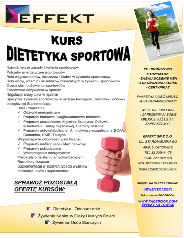 Najwa niejsze zasady ywienia sportowców Potrzeby energetyczne sportowców Rola w glowodanów, tłuszczów i białek w ywieniu sportowców Rola wody, witamin i składników mineralnych w ywieniu sportowców Ocena stan od ywienia sportowców Zaburzenia od ywiania w sporcie Regulacja masy ciała w sporcie Specyfika ywienia sportowców w okresie treningów, zawodów i odnowy biologicznej Suplementacja Rola i znaczenie Od ywki energetyczne Preparaty białkowe i w glowodanowo-białkowe Preparaty anaboliczne: Arginina, Kreatyna, Od ywki w budowaniu masy mi niowej, Steroidy ro linne Preparaty antykataboliczne: Aminokwasy rozgał zione BCAA, Glutamina, HMB, Tauryna Wspomaganie odporno ci psychicznej Preparaty nadzoruj ce układ nerwowy Preparaty pobudzaj ce Wspomaganie energetyczne Preparaty o działaniu antyoksydacyjnym Reduktory tłuszczu Suplementacja w ró nych typach wysiłków Interakcje leków i suplementów SPRAWD POZOSTAŁ OFERT KURSÓW: PO UKO CZENIU OTRZYMASZ: - ZA WIADCZENIE MEN O UKO CZENIU KURSU - CERTYFIKAT PAMI TAJ ILO Ć MIEJSC JEST OGRANICZONA!!! WI C NIE ZWLEKAJ I ZAREZERWUJ SOBIE MIEJSCE JU DZIS!!! ZAPRASZAMY!! EFFEKT SP.Z O.O. UL. STAROMIEJSKA 6/2 40-013 KATOWICE TEL 32 203-41-75 KOM. 720-820-804 MAIL: [email protected] [email protected] WI CEJ NA NASZEJ STRONIE WWW.EFFEKT.BIZ.PL Polub nas na FACEBOOK: WWW.FACEBOOK.COM/ EFFEKT.KATOWICE Dietetyka i Odchudzanie ywienie Kobiet w Ci y i Małych Dzieci ywienie Osób Starszych