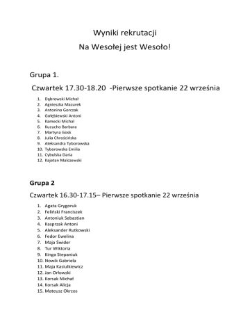 Wyniki rekrutacji Na Wesołej jest Wesoło! Grupa 1. Czwartek 17.30-18.20 -Pierwsze spotkanie 22 września 1. 2. 3. 4. 5. 6. 7. 8. 9. 10. 11. 12. Dąbrowski Michał Agnieszka Mazurek Antonina Gorczak Gołębiewski Antoni Kamecki Michal Kucucho Barbara Martyna Gosk Julia Chrościńska Aleksandra Tyborowska Tyborowska Emilia Cybulska Daria Kajetan Malczewski Grupa 2 Czwartek 16.30-17.15– Pierwsze spotkanie 22 września 1. Agata Grygoruk 2. Feliński Franciszek 3. Antoniuk Sebastian 4. Kasprzak Antoni 5. Aleksander Rutkowski 6. Fedor Ewelina 7. Maja Świder 8. Tur Wiktoria 9. Kinga Stepaniuk 10. Nowik Gabriela 11. Maja Kasiulkiewicz 12. Jan Orłowski 13. Korsak Michał 14. Korsak Alicja 15. Mateusz Okrzos 16. Olwia Sochoń Grupa 3 WTOREK 16.30-17.30 Pierwsze spotkanie 20 WRZEŚNIA 1. Natalia Słomianko 2. Grabowski Krzysztof 3. Kierkowski Gabriel 4. Filip Szewczuk 5. Igor Niczyporowicz 6. Gabriela Zagórska 7. Hanna Garkowska 8. Perkowski Tadeusz 9. Antonii Pieśluk 10. Milena Rokosz 11. Grabowski Maciej 12. Piotrowska Gabriela 13. Barbara Kiniorska 14. Zofia Makowska 15. Kacper Barszczewski 16. Weronika Szymanowska 17. Julia Wojtulewicz Grupa 4 WTOREK 17.45-18.45 Pierwsze spotkanie 20 WRZEŚNIA 1. Wiktoria Oniszczuk 2. Daniel Szewczuk 3. Aleksandra Dubrowska 4. Zofia Szatrawska 5. Jurkowska Wiktoria 6. Oliwa Buturla 7. Weronika Dąbrowska 8. Aleksander Chomaniuk 9. Kierkowski Tymoteusz 10. Iga Łukaszewicz 11. Aleksandra Dąbrowska 12. Felińska Wiktoria 13. Anna Zadykowicz 14. Dominika Dojlido 15. Karolina Maszkowska 16. Kuptel Bartłomiej 17. Michał Drągowski 18. Ola Siemieniuk 19. Szymon Siemieniuk DOROŚLI środa 17.30-18.30 I grupa pierwsze spotkanie 21 września 1. Elena Lourovska 2.Marta Chomaniuk 3.Magdalena Kasiukiewicz 4.Barbara Olejniczak 5.Agnieszka Szymanowska 6. Iwona Oniszczuk-Ambrożko 7. Anna Rutkowska 8. Kornelia Kuptel Środa 18.20-19.20 II GRUPA PIERWSZE SPOTKANIE 21 września 1. 2. 3. 4. 5. 6. 7. Iwona Szekalska P.Pieśluk ( mama Antoniego) Karolina Gosk Katarzyna Orłowska Dąbrowska Agnieszka Chrościńska Joanna Małgorzata Szymborewicz