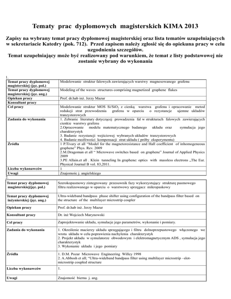 Tematy prac dyplomowych magisterskich KIMA 2013 Zapisy na wybrany temat pracy dyplomowej magisterskiej oraz lista tematów uzupełniających w sekretariacie Katedry (pok. 712). Przed zapisem należy zgłosić się do opiekuna pracy w celu uzgodnienia szczegółów. Temat uzupełniający może być realizowany pod warunkiem, że temat z listy podstawowej nie zostanie wybrany do wykonania 1. Temat pracy dyplomowej magisterskiej (jęz. pol.) Temat pracy dyplomowej magisterskiej (jęz. ang.) Opiekun pracy Konsultant pracy Cel pracy Zadania do wykonania Źródła Liczba wykonawców Uwagi 2. Modelowanie struktur falowych zawierających warstwy magnesowanego grafenu Modeling of the waves structures comprising magnetized graphene flakes Prof. dr.hab inż. Jerzy Mazur Modelowanie struktur MOS Si/SiO2 z cienką warstwa grafenu i opracowanie metod redukcji strat przewodzenia grafenu w oparciu o rezystancje ujemne układów tranzystorowych 1. Zebranie literatury dotyczącej prowadzenia fal w strukturach falowych zawierających cienkie warstwy grafenu 2.Opracowanie modelu matematycznego badanego układu oraz symulacja jego charakterystyk 3. Badanie rezystancji wejściowej wybranych układów tranzystorowych 4. Badanie możliwości kompensacji strat układu ( próby eksperymentu) 1 P.Tivary et all “Model for the magnetoresistance and Hall coefficient of inhomogeneous graphene” Phys. Rev. 2009 2.M.Dragoman et all “ Microwave switches based on graphene” Journal of Applied Physics 2009 3.PE Allain.et all . Klein tunneling In graphene: optics with massless electrons „The Eur. Physical Journal B vol. 83,2011. 1 Znajomośc j. angielskiego Temat pracy dyplomowej magisterskiej(jęz. pol.) Szerokopasmowy zintegrowany przesuwnik fazy wykorzystujący strukturę pasmowego filtru realizowanego w oparciu o warstwowy sprzęgacz mikropaskowy Temat pracy dyplomowej inżynierskiej (jęz. ang.) Ultra-wideband bandpass phase shifter using configuration of the bandpass filter based on the structure of the multilayer microstrip coupler Opiekun pracy Prof. dr.hab inż. Jerzy Mazur Konsultant pracy Dr. inż Wojciech Marynowski Cel pracy Zaprojektowanie układu, symulacje jego parametrów, wykonanie i pomiary. Zadania do wykonania 1. Określenie macierzy układu sprzęgającego i filtru dolnoprzepustowego włączonego we wrota układu w celu poprawienia nachylenia charakterystyk 2. Projekt układu w symulatorze obwodowym i elektromagnetycznym ADS , symulacja jego charakterystyk 3. Wykonanie układu i jego pomiary Źródła 1. D.M. Pozar Microwave Engineering Willey 1998 2. A.Abbosh et all; “Ultra-wideband bandpass filter using multilayer microstrip –slotmicrostrip coupled structure Liczba wykonawców 1. Uwagi Znajomość bierna j. ang. 3. Temat pracy dyplomowej magisterskiej (jęz. pol.) Temat pracy dyplomowej magisterskiej (jęz. ang.) Opiekun pracy Konsultant pracy Cel pracy Zadania do wykonania Źródła Liczba wykonawców Uwagi 4. Oprogramowanie stanowiska do pomiaru parametrów anten mikrofalowych w strefie dalekiej Software for microwave antenna parametrs measurement in far-field range Dr hab. inż. Włodzimierz Zieniutycz Mgr inż. Łukasz Sorokosz Opracowanie programu sterującego pomiarem charakterystyki promieniowania, zysku energetycznego oraz stanu polaryzacji na stanowisku pomiarowym laboratorium antenowego Wydziału ETI 1. Przegląd literaturowy w zakresie pomiarów parametrów anten 2. Napisanie programu sterującego stanowiskiem pomiarowym (częścią mechaniczną oraz elektryczną) 3. Opracowanie interfejsu graficznego 4. Weryfikacja poprawności programu poprzez pomiary wybranych anten referencyjnych 1. G. E. Evans: Antenna measurement techniques, Artech House, 1990, 2. W. L. Stutzman: Polarization in Electromagnetic Systems, Artech House, 1993. 1 Oprogramowanie prawdopodobnie w środowisku LabView Temat pracy dyplomowej magisterskiej (jęz. pol.) Ekstrakcja parametrów symetryzatora UWB na podstawie pomiarów konfiguracji przeciwsobnej Temat pracy dyplomowej magisterskiej (jęz. ang.) Single balun parameters extraction based on back-to-back measurement Opiekun pracy Konsultant pracy Cel pracy Zadania do wykonania Źródła Liczba wykonawców Uwagi 5. Temat pracy dyplomowej magisterskiej (jęz. pol.) Temat pracy dyplomowej magisterskiej (jęz. ang.) Opiekun pracy Konsultant pracy Cel pracy Zadania do wykonania Źródła Liczba wykonawców Uwagi dr hab. inż. Włodzimierz Zieniutycz mgr inż. Łukasz Sorokosz Celem pracy jest przeprowadzenie pełnej esktrakcji parametrów ultra szerokopasmowego symetryzatora z wykorzystaniem dostępnego skryptu środowiska Matlab. 1. Projekt układu planarnego symetryzatora UWB 2. Realizacja symetryzatora w konfiguracji przeciwsobnej 3. Ekstrakcja parametrów pojedynczego symetryzatora 4. Badania numeryczne wpływu parametrów ekstracji na jej wynik 5. Przeprowadzenie pełnej ekstrakcji z uwzględnieniem efektu sprzężenia w układzie przeciwsobnym oraz wpływu złącz współosiowych 1. Sorokosz Ł., Zieniutycz W., Szerokopasmowe symetryzatory realizowane w technice planarnej, Elektronika - Konstrukcje, Technologie, Zastosowania, 04/2011 2. Sorokosz Ł. Zieniutycz W., On the extraction of the single UWB planar balun parameters from back-to-back measurements, IEEE Trans. Microwave Theory and Tech. (w recenzji) 1 Analiza filtrów falowodowych zrealizowanych w oparciu o prostokątne wnęki rezonansowe przy użyciu metody dopasowania rodzajów Analysis of waveguide filters composed of rectangular resonators coupled by rectangular irises using mode-matching technique dr inż. Rafał Lech ---------Projekt i badania filtrów falowodowych zrealizowanych w oparciu o prostokątne wnęki rezonansowe. Opracowanie oprogramowania komputerowego z graficznym interfejsem użytkownika do analizy filtrów. 1. Przegląd literatury przedmiotu 2. Opracowanie oprogramowania do obliczania macierzy admitancyjnych prostokątnych wnęk rezonansowych zasilanych z falowodów prostokątnyc