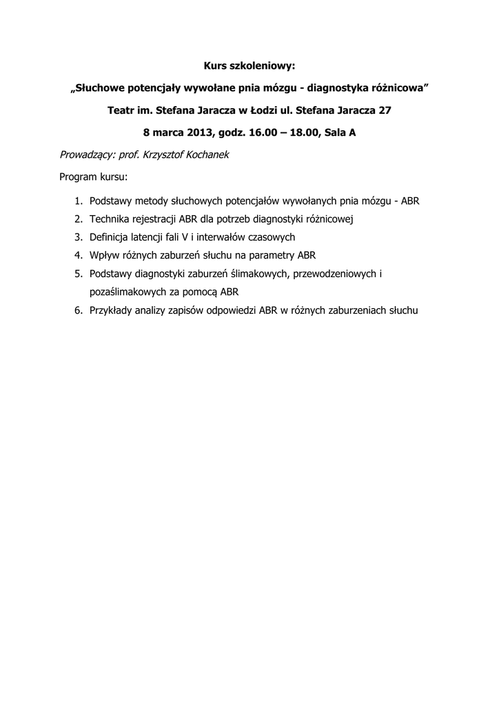 Kurs szkoleniowy: „Słuchowe potencjały wywołane pnia mózgu - diagnostyka różnicowa” Teatr im. Stefana Jaracza w Łodzi ul. Stefana Jaracza 27 8 marca 2013, godz. 16.00 – 18.00, Sala A Prowadzący: prof. Krzysztof Kochanek Program kursu: 1. Podstawy metody słuchowych potencjałów wywołanych pnia mózgu - ABR 2. Technika rejestracji ABR dla potrzeb diagnostyki różnicowej 3. Definicja latencji fali V i interwałów czasowych 4. Wpływ różnych zaburzeń słuchu na parametry ABR 5. Podstawy diagnostyki zaburzeń ślimakowych, przewodzeniowych i pozaślimakowych za pomocą ABR 6. Przykłady analizy zapisów odpowiedzi ABR w różnych zaburzeniach słuchu