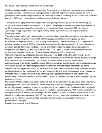 PO SESJI - Było dobrze, a skończyło się jak zawsze Środowa sesja dawała bykom duże nadzieje. Po wtorkowym wyjątkowo negatywnym wyróżnieniu naszego parkietu i umiarkowanie spokojnej sesji w Stanach popyt miał otwartą drogę do walki o pozytywne zamknięcie całego miesiąca. W pierwszych taktach udało się WIG20 skutecznie odbić od poziomu 2200 pkt. i rynek w parę chwil wyszedł na 1,5 proc. wzrosty. Teoretycznie ten optymizm można było tłumaczyć pozytywną reakcją rynków na informację, że stopa bezrobocia w Niemczech spadła do 8,2 proc., ale praktycznie takie dane nie mają wpływu na rynki, a zbieżność publikacji i wzrostów była przypadkowa. Przy poziomie 2230 pkt. gracze ograniczyli swoją aktywność i na kolejne zmiany trzeba było czekać aż do popołudniowych informacji z USA. Tamtejsze dane makro były najważniejszym punktem dnia i wpłynęły na ostateczny rezultat sesji. Pierwszy raport, którym był komunikat ADP opisujący amerykański rynek pracy był słaby. Przewiduje on większy ubytek aż 254 tysięcy miejsc pracy, a nie oczekiwanych 200. Jego odczyt osłabiał ostateczny wynik PKB w USA w drugim kwartale, bo nie zapowiedź -1,2 proc. okazała się znacznie poniżej faktycznej wartości. Trzecie przybliżenie rozwoju gospodarczego nadal jest negatywne, ale wynosi już „zaledwie” 0,7 proc. Z dużym prawdopodobieństwem można więc zakładać, ze dane o PKB za III kwartał będą w końcu pozytywne. Obie informacje miały znaczenie drugorzędne, wiec rynki dość swobodnie utrzymywały się na plusach. Końcówka odmieniła jednak całkowicie obraz dnia, a wszystko za sprawą indeksu Chicago PMI. Jego wartość spadła do 46,1 pkt., a więc po pierwsze jest znacznie mniejsza niż prognozowano, a po drugie wartość poniżej 50 pkt. sygnalizuje kurczenie się rejonu gospodarczego w okręgu Chicago. To natomiast jest już zła wiadomość, chociaż trzeba podkreślić, że sama wielkość nie jest wyjątkowo niska, bo jeszcze w lipcu wskaźnik był znacznie niżej, ale najwidoczniej rynki przestraszyły się możliwości, że po serii lepszych danych teraz zaskoczenia będą negatywne. Ponadto indeks Chicago PMI ma dużą korelację z analogicznym indeksem opisującym całą gospodarkę USA (publikowany w poniedziałek) i jeżeli on również zanotuje spadek to ciężko będzie uniknąć przeceny. Po danych WIG20 wręcz runął tracąc ponad 30 pkt. Ze zwyżki zrobiły się spadki, a brak utrzymania powyżej poziomu 2235 pkt. oznacza, że nie udało się zakończyć kolejnego z rzędu miesiąca na plusie. Tym razem mogliśmy zobaczyć jak silne mogą być zawiedzone oczekiwania. Dziś wyraźnie widać je w statystyce: aż 224 spółek traciło na wartości, a zyskiwały tylko 102. Ciekawe rozróżnienie nastąpiło również w sektorze surowcowym. KGHM zyskał 1,6 proc., a ORLEN stracił ponad 4 proc. Gwiazdą dnia był bez wątpienia PKO BP, ale nawet tak duży bank nie zdołał uratować rynku przed przeceną. Po kolejnej nieudanej akcji wzrostowej teraz podaż może przejść do działania i przetestować 2160 pkt. Paweł Cymcyk Analityk A-Z Finanse