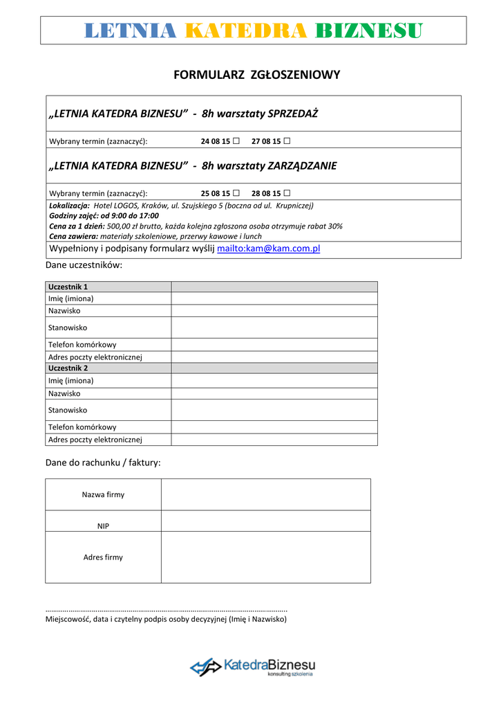 LETNIA KATEDRA BIZNESU FORMULARZ ZGŁOSZENIOWY „LETNIA KATEDRA BIZNESU” - 8h warsztaty SPRZEDAŻ Wybrany termin (zaznaczyć): 24 08 15 □ 27 08 15 □ „LETNIA KATEDRA BIZNESU” - 8h warsztaty ZARZĄDZANIE □ □ Wybrany termin (zaznaczyć): 25 08 15 28 08 15 Lokalizacja: Hotel LOGOS, Kraków, ul. Szujskiego 5 (boczna od ul. Krupniczej) Godziny zajęć: od 9:00 do 17:00 Cena za 1 dzień: 500,00 zł brutto, każda kolejna zgłoszona osoba otrzymuje rabat 30% Cena zawiera: materiały szkoleniowe, przerwy kawowe i lunch Wypełniony i podpisany formularz wyślij mailto:[email protected] Dane uczestników: Uczestnik 1 Imię (imiona) Nazwisko Stanowisko Telefon komórkowy Adres poczty elektronicznej Uczestnik 2 Imię (imiona) Nazwisko Stanowisko Telefon komórkowy Adres poczty elektronicznej Dane do rachunku / faktury: Nazwa firmy NIP Adres firmy …………………………………………………………………………………………………………….. Miejscowość, data i czytelny podpis osoby decyzyjnej (Imię i Nazwisko)