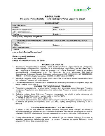 REGULAMIN Programu Piękne kształty – seria 6 zabiegów Venus Legacy na brzuch DANE NABYWCY Imię i Nazwisko: ... ... PESEL: ... Dokument tożsamości: ... Adres zamieszkania: ... Telefon: ... Data ur.: ... Seria i numer: ... ... E-mail: ... zwany dalej „Nabywcą Programu” DANE OSOBY UPRAWNIONEJ DO KORZYSTANIA ZE ŚWIADCZEŃ ZDROWOTNYCH Imię i Nazwisko: : ... ... PESEL: ... Data ur.: ... Adres zamieszkania: ... Telefon: ... zwany dalej „Osobą Uprawnioną” Data aktywacji zestawu: ... Cena zestawu: ... Okres ważności zestawu do dnia: ... INFORMACJE OGÓLNE 1. Sprzedawcą Programu Piękne kształty – seria 6 zabiegów Venus Legacy na brzuch („Program”), (określonego szczegółowo w Załączniku nr 1 do niniejszego Regulaminu) jest LUX MED Sp. z o.o. z siedzibą w Warszawie, adres: ul. Postępu 21C, 02-676 Warszawa, wpisany do rejestru przedsiębiorców prowadzonego przez Sąd Rejonowy dla m.st. Warszawy, XIII Wydział Gospodarczy Krajowego Rejestru Sądowego pod numerem KRS 0000265353, NIP 5272523080, REGON 140723603, kapitał zakładowy 528.578.500,00 PLN („LUX MED”). 2. Nabywcą Programu może zostać osoba, która ukończyła 18 rok życia. Osobą Uprawnioną może być Nabywca Programu lub osoba trzecia. 3. Osobami Uprawnionymi do korzystania ze świadczeń zdrowotnych w ramach Programu mogą być osoby powyżej 18 roku życia. WARUNKI PRZYSTĄPIENIA DO PROGRAMU 4. Warunkiem przystąpienia i uruchomienia Programu jest akceptacja przez Nabywcę Programu niniejszego Regulaminu oraz dokonanie pełnej płatności za Program w kwocie określonej w ust. 5 poniżej. 5. Całkowita opłata, którą Nabywca Programu zobowiązuje się uiścić w celu zgłoszenia do Programu Osoby Uprawnionej , wynosi brutto (w tym VAT 23%) : 1 500,00 zł (słownie jeden tysiąc pięćset zł). 6. Uprawnienia do korzystania ze świadczeń zdrowotnych w ramach Programu zostaną aktywowane w terminie 24 godzin po otrzymaniu przez LUX MED wpłaty pełnej kwoty określonej w ust. 5 powyżej. ODSTĄPIENIE I REZYGNACJA Z PROGRAMU 7. W ciągu 14 dni od dnia zawarcia Umowy Nabywca Programu może odstąpić od Umowy o udzielanie świadczeń zdrowotnych na podstawie niniejszego Regulaminu bez podania przyczyny, składając LUX MED oświadczenie poprzez przesyłanie go na adres: [email protected]. 8. Prawo odstąpienia od Umowy zawartej na odległość nie przysługuje Nabywcy Programu w wypadku rozpoczęcia świadczenia usług w ramach Programu, za zgodą Nabywcy, przed upływem 14 dni od dnia zawarcia Umowy. WARUNKI REALIZACJI PROGRAMU 9. Udzielanie świadczeń zdrowotnych w ramach Programu odbywa się w dedykowanej do Programu placówce PROFEMED w Warszawie przy ul. Al. Jerozolimskie 65/79 (budynek Hotelu Marriott , VI piętro) 10. Warunkiem udzielenia świadczenia zdrowotnego w ramach Programu Piękne kształty – seria 6 zabiegów Venus Legacy na brzuch jest uprzednie uzgodnienie terminu jego wykonania poprzez skontaktowanie się z Call Center pod numerem 885 670 140 11. Świadczenia zdrowotne w ramach Programu należy zrealizować nie później niż w ciągu 3 miesięcy od dnia aktywowania uprawnień Osoby Uprawnionej do Programu. OŚWIADCZENIE NABYWCY 12. Nabywca (w rozumieniu Regulaminu Programu Piękne kształty – seria 6 zabiegów Venus Legacy na brzuch poinformował Osobę Uprawnioną (w rozumieniu ww regulaminu) do korzystania z usług w ramach Programu (w rozumieniu ww regulaminu) o: 1. adresie siedziby i pełnej nazwie LUX MED Sp. z o.o. jako administratora danych tej Osoby przekazanych przez Nabywcę; 2. celu i zakresie zbierania przez LUX MED Sp. z o.o. danych, o których mowa w pkt 1) powyżej; 3. źródle danych, o których mowa w pkt 1 powyżej; 4. prawie dostępu Osoby Uprawnionej do treści swoich danych przetwarzanych przez LUX MED Sp. z o.o. jako administratora danych oraz prawie do ich poprawiania; 5. uprawnieniach wynikających z art. 32 ust. 1 pkt 7 i 8 Ustawy z dnia 2 sierpnia 1997 r. o ochronie danych osobowych („Ustawa”) tj. a) wniesienia, w przypadkach wymienionych w art. 23 ust. 1 pkt 4 i 5 Ustawy, pisemnego, umotywowanego żądania zaprzestania przetwarzania jej danych ze względu na jej szczególną sytuację, b) wniesienia sprzeciwu wobec przetwarzania jej danych w przypadkach, wymienionych w art. 23 ust. 1 pkt 4 i 5 Ustawy, gdy administrator danych zamierza je przetwarzać w celach marketingowych lub wobec przekazywania jej danych osobowych innemu administratorowi danych. 13. Nabywca oświadcza, iż posiada zgodę osoby wskazanej w Regulaminie Programu Piękne kształty – seria 6 zabiegów Venus Legacy na brzuch jako Osoba Uprawniona do korzystania z usług w ramach Programu, na przekazanie następujących danych osobowych tej osoby: imienia i nazwiska, daty urodzenia, numeru PESEL, numeru telefonu, adres e-mail, adres zamieszkania. KONTAKT I REKLAMACJE 14. Reklamacje przyjmowane są wyłącznie w formie pisemnej. 15. Reklamacje dotyczące obsługi rozpatrywane są w ciągu 5 dni roboczych, reklamacje dotyczące kwestii medycznych rozpatrywane są w ciągu 14 dni roboczych od daty wpływu reklamacji na adres: LUX MED Sp. z o.o. Departament Obsługi Klienta Dział Zarządzania Reklamacjami ul. Postępu 21C 02-676 Warszawa lub na adres poczty elektronicznej: [email protected] POSTANOWIENIA KOŃCOWE 16. Nie ma możliwości dokonania cesji praw do Programu na inną osobę. 17. Zakup Programu oraz korzystanie ze świadczeń zdrowotnych w ramach Programu nie łączy się z żadnymi innymi promocjami ani rabatami udzielanymi przez LUX MED na jakiekolwiek usługi . 18. W przypadkach rozbieżności pomiędzy postanowieniami niniejszego regulaminu a Regulaminem Sklepu dostępnego pod adresem www.luxmed.pl, zastosowanie znajdą postanowienia niniejszego regulaminu. 19. Integralną część Regulaminu stanowi załącznik nr 1. Załącznik nr 1 Wykaz usług wchodzących w skład Programu Piękne kształty – seria 6 zabiegów Venus Legacy na brzuch Usługa kosmetyczna 