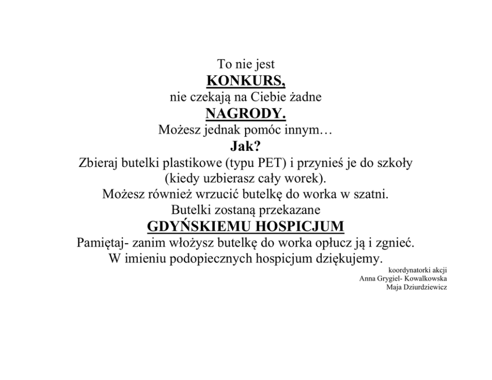 To nie jest KONKURS, nie czekają na Ciebie żadne NAGRODY. Możesz jednak pomóc innym… Jak? Zbieraj butelki plastikowe (typu PET) i przynieś je do szkoły (kiedy uzbierasz cały worek). Możesz również wrzucić butelkę do worka w szatni. Butelki zostaną przekazane GDYŃSKIEMU HOSPICJUM Pamiętaj- zanim włożysz butelkę do worka opłucz ją i zgnieć. W imieniu podopiecznych hospicjum dziękujemy. koordynatorki akcji Anna Grygiel- Kowalkowska Maja Dziurdziewicz