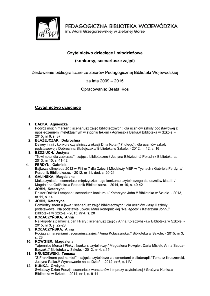 Czytelnictwo dziecięce i młodzieżowe (konkursy, scenariusze zajęć) Zestawienie bibliograficzne ze zbiorów Pedagogicznej Biblioteki Wojewódzkiej za lata 2009 – 2015 Opracowanie: Beata Kłos Czytelnictwo dziecięce 1. 2. 3. 4. 5. 6. 7. 8. 9. 10. 11. 12. BAŁKA, Agnieszka Podróż moich marzeń : scenariusz zajęć bibliotecznych : dla uczniów szkoły podstawowej z upośledzeniem intelektualnym w stopniu lekkim / Agnieszka Bałka.// Biblioteka w Szkole. 2015, nr 6, s. 37 BŁAŻEJCZAK, Dobrochna Dewey i inni : konkurs czytelniczy z okazji Dnia Kota (17 lutego) : dla uczniów szkoły podstawowej / Dobrochna Błażejczak.// Biblioteka w Szkole. - 2012, nr 12, s. 16 BŹDZIUCH, Justyna "Tuwimolandia zaprasza" : zajęcia biblioteczne / Justyna Bździuch.// Poradnik Bibliotekarza. 2013, nr 10, s. 41-42 FERDYN, Gabriela Bajkowa olimpiada 2012 w Filii nr 7 dla Dzieci i Młodzieży MBP w Tychach / Gabriela Ferdyn.// Poradnik Bibliotekarza. - 2012, nr 11, dod. s. 20-21 GALIŃSKA, Magdalena Makuszyniada : scenariusz międzyszkolnego konkursu czytelniczego dla uczniów klas III / Magdalena Galińska.// Poradnik Bibliotekarza. - 2014, nr 10, s. 40-42 JOHN, Katarzyna Doktor Dolittle i empatia : scenariusz konkursu / Katarzyna John.// Biblioteka w Szkole. - 2013, nr 11, s. 14 JOHN, Katarzyna Pomiędzy snem a jawą : scenariusz zajęć bibliotecznych : dla uczniów klasy II szkoły podstawowej. Na podstawie utworu Marii Konopnickiej "Na jagody" / Katarzyna John.// Biblioteka w Szkole. - 2015, nr 4, s. 28 KOŁACZYŃSKA, Anna Na kłopoty z pamięcią pan Hilary : scenariusz zajęć / Anna Kołaczyńska.// Biblioteka w Szkole. 2015, nr 3, s. 22-23 KOŁACZYŃSKA, Anna Pociąg z marzeniami : scenariusz zajęć / Anna Kołaczyńska.// Biblioteka w Szkole. - 2015, nr 3, s. 23 KOWGIER, Magdalena Tajemnice Morsa i Pinky : konkurs czytelniczy / Magdalena Kowgier, Daria Misiek, Anna SzudaBączek.// Biblioteka w Szkole. - 2012, nr 4, s.15 KRUSZEWSKI, Tomasz "Z Franklinem pod namiot" - zajęcia czytelnicze z elementami biblioterapii / Tomasz Kruszewski, Justyna Pałka.// Wychowanie na co Dzień. - 2012, nr 6, s. I-IV KUNKA, Grażyna Światowy Dzień Poezji : scenariusz warsztatów i imprezy czytelniczej / Grażyna Kunka.// Biblioteka w Szkole. - 2014, nr 1, s. 9-11 13. 14. 15. 16. 17. 18. 19. 20. 21. 22. 23. 24. 25. 26. 27. 28. 29. 30. 31. 32. LENDZION, Ewa Piraci na Książkolandii : scenariusz pasowania na czytelnika / Ewa Lendzion.// Biblioteka w Szkole. - 2013, nr 10, s. 26-27 LUDWINIAK, Wioletta Afryka Kazika : międzyszkolny konkurs czytelniczy : sprawdzający znajomość książki Łukasza Wierzbickiego / Wioletta Ludwiniak.// Biblioteka w Szkole. - 2013, nr 12, s. 14-15 LUDWINIAK, Wioletta Przygody Lusi : międzyszkolny konkurs czytelniczy : dla uczniów szkół podstawowych. Ze znajomości książki Mariusza Niemyckiego "Wymiar Pe czyli świat według Lusi" / Wioletta Ludwiniak.// Biblioteka w Szkole. - 2015, nr 5, s. 17-18 MACIEJEWSKA, Alicja Noc z Indianami czyli czytanie w szkole wieczorowa porą : pomysł imprezy czytelniczej dla uczniów klas III szkoły podstawowej / Alicja Maciejewska.// Biblioteka w Szkole. - 2013, nr 4, s. 10-12 MACIEJEWSKA, Alicja Noc z piratami : impreza czytelnicza / Alicja Maciejewska.// Biblioteka w Szkole. - 2014, nr 4, s. 13-15 MAMEŁA, Maria Moim idolem jest Nemeczek : propozycja konkursu / Maria Mameła.// Biblioteka w Szkole. 2014, nr 12, s. 26-27 NADOLSKA, Joanna Cała Polska czyta dzieciom : scenariusz zajęć / Joanna Nadolska.// Biblioteka w Szkole. - 2010, nr 9, s. 20-21 NIEDŹWIECKA, Renata Czytanie, moja pasja : scenariusz zajęć bibliotecznych : zajęcia o promowaniu czytelnictwa, przeznaczone dla uczniów klas I-III szkoły podstawowej / Renata Niedźwiecka, Agnieszka Wiśniowska.// Biblioteka w Szkole. - 2015, nr 1, s. 29 NIEDŹWIECKA, Renata Matematyka nie jest nudna : scenariusz zajęć czytelniczych : dla uczniów klas I-III szkoły podstawowej. Na podstawie książki "Do trzech odlicz" Grzegorza Kasdepke / Renata Niedźwiecka.// Biblioteka w Szkole. - 2015, nr 1, s. 27 NIEDŹWIECKA, Renata Na rowerze przez świat : scenariusz zajęć czytelniczych : dla uczniów klas I-III szkoły podstawowej. Na podstawie książki "Afryka Kazika" Łukasza Wierzbickiego / Renata Niedźwiecka, Agnieszka Wiśniowska.// Biblioteka w Szkole. - 2015, nr 4, s. 31 PACYNA-DAWID, Paulina Licealiści czytają przedszkolakom : przedstawiamy scenariusz spotkania licealistów z przedszkolakami oraz konspekt lekcji, którą młodzież odbyła przed tym spotkaniem / Paulina Pacyna-Dawid.// Biblioteka w Szkole. - 2015, nr 3, s. 18-20 PACZKOWSKA, Magdalena Kto to, co to? : konkurs ze znajomości wierszy Jana Brzechwy / Magdalena Paczkowska.// Biblioteka w Szkole. - 2015, nr 2, s. 23 PEJKOWSKA, Agnieszka W Kubusiowie-Puchatkowie : scenariusz zajęć przedszkolnych / Agnieszka Pejkowska.// Poradnik Bibliotekarza. - 2014, nr 7/8, s. 59-63 PIETRYKA, Maria Słupski Konkurs Literacki w Ameryce : twórczość dziecięca za Wielką Wodą / Maria Pietryka.// Biblioteka w Szkole. - 2010, nr 3, s.26-27 PIKUL, Marzena Miziołek - to ja! : konkurs czytelniczy / Marzanna Pikul.// Biblioteka w Szkole. - 2014, nr 10, s. 20-21 SMUTKIEWICZ, Krystyna Maria Konopnicka : jak się bawić tekstami pisarki : pomysł międzyszkolnej imprezy zorganizowanej we współpracy ze świetlicą / Krystyna Smutkiewicz.// Biblioteka w Szkole. 2015, nr 6, s. 27 STEFANÓW, Irena "W dolinie Muminków" : zajęcia z cyklu "Nasi bajkowi przyjaciele" / Irena Stefanów, Jolanta Tokarek.// Poradnik Bibliotekarza. - 2010, nr 3, s.38-39 STEFANÓW, Irena Klub przyjaciół żółwika Franklina : program zajęć dla uczniów klas I-III szkoły podstawowej / Irena Stefanów, Jolanta Tokarek.// Biblioteka w Szkole. - 2010, nr 2, s. 18-19 Wielka Liga Czytelników : konkurs.// Biblioteka w Szkole. - 2014, nr 12, s. 30 WITEK, Janina Akademia pana Kleksa : konkurs / Janina Witek.// Biblioteka w Szkole. - 2014, nr 1, s. 17-18 33. 34. 35. W