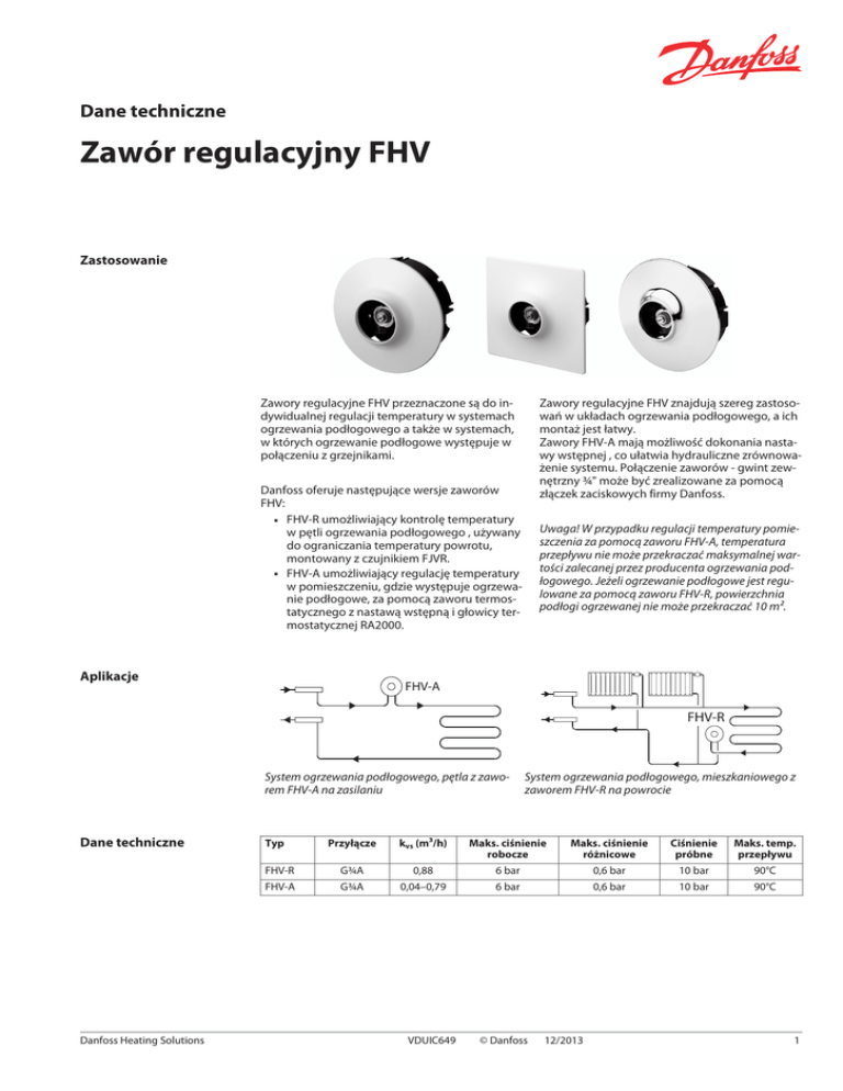 Dane techniczne Zawór regulacyjny FHV Zastosowanie Zawory regulacyjne FHV znajdują szereg zastosowań w układach ogrzewania podłogowego, a ich montaż jest łatwy. Zawory FHV-A mają możliwość dokonania nastawy wstępnej , co ułatwia hydrauliczne zrównoważenie systemu. Połączenie zaworów - gwint zewnętrzny ¾" może być zrealizowane za pomocą złączek zaciskowych firmy Danfoss. Zawory regulacyjne FHV przeznaczone są do indywidualnej regulacji temperatury w systemach ogrzewania podłogowego a także w systemach, w których ogrzewanie podłogowe występuje w połączeniu z grzejnikami. Danfoss oferuje następujące wersje zaworów FHV: ▪ FHV-R umożliwiający kontrolę temperatury w pętli ogrzewania podłogowego , używany do ograniczania temperatury powrotu, montowany z czujnikiem FJVR. ▪ FHV-A umożliwiający regulację temperatury w pomieszczeniu, gdzie występuje ogrzewanie podłogowe, za pomocą zaworu termostatycznego z nastawą wstępną i głowicy termostatycznej RA2000. Aplikacje Uwaga! W przypadku regulacji temperatury pomieszczenia za pomocą zaworu FHV-A, temperatura przepływu nie może przekraczać maksymalnej wartości zalecanej przez producenta ogrzewania podłogowego. Jeżeli ogrzewanie podłogowe jest regulowane za pomocą zaworu FHV-R, powierzchnia podłogi ogrzewanej nie może przekraczać 10 m². FHV-A FHV-R System ogrzewania podłogowego, pętla z zaworem FHV-A na zasilaniu Dane techniczne Danfoss Heating Solutions Typ Przyłącze System ogrzewania podłogowego, mieszkaniowego z zaworem FHV-R na powrocie kvs (m³/h) Maks. ciśnienie robocze Maks. ciśnienie różnicowe Ciśnienie próbne Maks. temp. przepływu FHV-R G¾A 0,88 6 bar 0,6 bar 10 bar 90°C FHV-A G¾A 0,04–0,79 6 bar 0,6 bar 10 bar 90°C VDUIC649 © Danfoss 12/2013 1 Dane techniczne Zamawianie Zawór regulacyjny FHV Zestawy FHV (z obudową i pokrywą przednią) Zestaw FHV-R: zawór ograniczający temperaturę powrotu z odpowietrznikiem i kluczem spustowym Zestaw FHV-R: zawór ograniczający temperaturę powrotu z odpowietrznikiem, kluczem spustowym i końcówką spustową Zestaw FHV-A: zawór z funkcją nastawy wstępnej, odpowietrznikiem i kluczem spustowym Głowice Ogranicznik temperatury powrotu FJVR Ogranicznik temperatury powrotu FJVR Głowica termostatyczna RA 2000 z ochroną przeciwzamrożeniową oraz funkcją ograniczania i blokowania nastawy temperatury Głowica termostatyczna RA 2000 z ochroną przeciwzamrożeniową oraz funkcją ograniczania i blokowania nastawy temperatury; złącze z pierścieniem zaciskowym i śrubą imbusową Głowica termostatyczna RA 2000 z ochroną przeciwzamrożeniową oraz funkcją ograniczania i blokowania temperatury Akcesoria i złączki zaciskowe 2 Dla głowicy Kolor Nr katalogowy FJVR biały 003L1000 FJVR biały 003L1015 RA2000 biały 003L1001 Zakres temp. 10–50°C 10–50°C biały chrom Nr katalogowy 003L1040 003L1072 5–26°C biały 013G2990 5–26°C biały 013G2910 5–26°C biały 013G2994 Kolor Akcesoria Kątownik montażowy z poziomowskazem Klucz spustowy Pokrywka przednia okrągła dla FHV-R / -A Pokrywka przednia kwadratowa dla FHV-R / -A Element przedłużający do głowic RA, 17,9 mm Element przedłużający do ograniczników FJVR, 17,9 mm Zabezpieczenie antykradzieżowe do głowic RA 2000 (op. 50 szt.) Klucz imbusowy do głowic RA 2000 Ograniczniki temp. gwintowane do głowic RA 2000 (30 szt.) Dławik do zaworów FHV-R / -A Nr katalogowy 003L1338 003L1340 003L1050 003L1052 003L1035 003L1036 013G1232 013G1236 013G1237 013G0290 Złączki zaciskowe Złączki zaciskowe do rur PEX, 15 mm x 2,5 mm Złączki zaciskowe do rur PEX, 16 mm x 2,2 mm Złączki zaciskowe do rur PEX, 18 mm x 2,5 mm Złączki zaciskowe do rur PEX, 20 mm x 2,5 mm Złączki zaciskowe do rur ALUPEX, 14 mm x 2 mm Złączki zaciskowe do rur ALUPEX, 16 mm x 2 mm Złączki zaciskowe do rur ALUPEX, 18 mm x 2 mm Złączki zaciskowe do rur ALUPEX, 20 mm x 2 mm Nr katalogowy 013G4147 013G4163 013G4159 013G4161 013G4184 013G4186 013G4188 013G4190 VDUIC649 © Danfoss 12/2013 Danfoss Heating Solutions Dane techniczne Zawór regulacyjny FHV Nastawa wstępna W zaworach firmy Danfoss nastawa wstępna realizowana jest przez zmianę ustawienia specjalnego pierścienia z wyraźnie oznaczoną skalą od 1 do 7 i N. Nastawę wstępną można realizować od 1 do 7 w odstępach co 0.5 (patrz wykresy wydajności ). Nastawa N oznacza zawór całkowicie otwarty (funkcja płukania). Nastawę wstępną można szybko i precyzyjnie zmienić, bez użycia specjalistycznych narzędzi: 1. Zdjąć kapturek ochronny lub głowicę. 2. Unieść pierścień nastawy. 3. Obrócić pierścień w kierunku przeciwnym do ruchu wskazówek zegara, aż do osiągnięcia wymaganej pozycji. 4. Opuścić pierścień do pozycji wyjściowej. Wykresy wydajności, FHVA i FHV-W 30 dB(A) 25 dB(A) Zawór FHV-A z głowicą termostatyczną RA 2000 (Xp = 0,5 - 2 K). Danfoss Heating Solutions VDUIC649 © Danfoss 12/2013 3 Dane techniczne Zawór regulacyjny FHV Wykresy wydajności, FHVR 30 dB(A) 25 dB(A) Zawór FHV-R z ogranicznikiem temperatury powrotu FJVR . Budowa FHV-A FHV-R Trzpień Dławik Pierścień uszczelniający Sprężyna powrotna Grzybek zaworu Korpus zaworu Połączenie G¾A Odpowietrznik Materiały w styczności z wodą Przesłona ustawienia wstępnego Trzpień O-ring Grzybek zaworu Trzpień, sprężyna zaworu Pozostałe części metalowe 4 VDUIC649 © Danfoss PPS Ms, odporny na korozję EPDM NBR Stal chromowa Ms 58 12/2013 Danfoss Heating Solutions Zawór regulacyjny FHV 31 50 58 50 Wymiary Ø142 Ø178 Dane techniczne Montaż Danfoss Heating Solutions Zawory FHV nadają się do montażu w ścianach nośnych jak i działowych. Zawór w zestawie z puszką ścienną, pozwala na trwałe zamocowanie zaworu w ścianie każdego typu. Głowice i pokrywkę przednią montuje się na wcisk. Opcjonalny kątownik montażowy, ułatwia proces obsadzenia i otynkowania puszki w ścianie. (nr kat. 003L1338). VDUIC649 © Dan