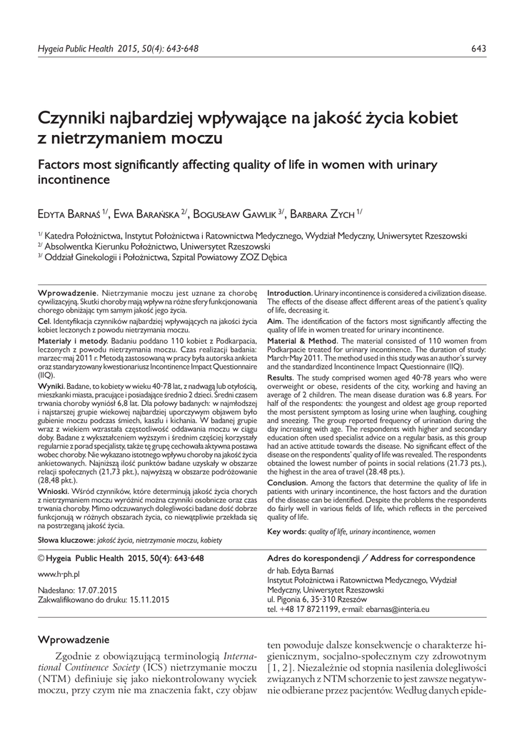Barnaś EPublic Hygeia i wsp.Health Czynniki 2015, najbardziej 50(4): 643-648 wpływające na jakość życia kobiet z nietrzymaniem moczu 643 Czynniki najbardziej wpływające na jakość życia kobiet z nietrzymaniem moczu Factors most significantly affecting quality of life in women with urinary incontinence Edyta Barnaś 1/, Ewa Barańska 2/, Bogusław Gawlik 3/, Barbara Zych 1/ Katedra Położnictwa, Instytut Położnictwa i Ratownictwa Medycznego, Wydział Medyczny, Uniwersytet Rzeszowski Absolwentka Kierunku Położnictwo, Uniwersytet Rzeszowski 3/ Oddział Ginekologii i Położnictwa, Szpital Powiatowy ZOZ Dębica 1/ 2/ Wprowadzenie. Nietrzymanie moczu jest uznane za chorobę cywilizacyjną. Skutki choroby mają wpływ na różne sfery funkcjonowania chorego obniżając tym samym jakość jego życia. Cel. Identyfikacja czynników najbardziej wpływających na jakości życia kobiet leczonych z powodu nietrzymania moczu. Materiały i metody. Badaniu poddano 110 kobiet z Podkarpacia, leczonych z powodu nietrzymania moczu. Czas realizacji badania: marzec-maj 2011 r. Metodą zastosowaną w pracy była autorska ankieta oraz standaryzowany kwestionariusz Incontinence Impact Questionnaire (IIQ). Wyniki. Badane, to kobiety w wieku 40-78 lat, z nadwagą lub otyłością, mieszkanki miasta, pracujące i posiadające średnio 2 dzieci. Średni czasem trwania choroby wyniósł 6,8 lat. Dla połowy badanych: w najmłodszej i najstarszej grupie wiekowej najbardziej uporczywym objawem było gubienie moczu podczas śmiech, kaszlu i kichania. W badanej grupie wraz z wiekiem wzrastała częstotliwość oddawania moczu w ciągu doby. Badane z wykształceniem wyższym i średnim częściej korzystały regularnie z porad specjalisty, także tę grupę cechowała aktywna postawa wobec choroby. Nie wykazano istotnego wpływu choroby na jakość życia ankietowanych. Najniższą ilość punktów badane uzyskały w obszarze relacji społecznych (21,73 pkt.), najwyższą w obszarze podróżowanie (28,48 pkt.). Wnioski. Wśród czynników, które determinują jakość życia chorych z nietrzymaniem moczu wyróżnić można czynniki osobnicze oraz czas trwania choroby. Mimo odczuwanych dolegliwości badane dość dobrze funkcjonują w różnych obszarach życia, co niewątpliwie przekłada się na postrzeganą jakość życia. Słowa kluczowe: jakość życia, nietrzymanie moczu, kobiety Introduction. Urinary incontinence is considered a civilization disease. The effects of the disease affect different areas of the patient’s quality of life, decreasing it. Aim. The identification of the factors most significantly affecting the quality of life in women treated for urinary incontinence. Material & Method. The material consisted of 110 women from Podkarpacie treated for urinary incontinence. The duration of study: March-May 2011. The method used in this study was an author’s survey and the standardized Incontinence Impact Questionnaire (IIQ). Results. The study comprised women aged 40-78 years who were overweight or obese, residents of the city, working and having an average of 2 children. The mean disease duration was 6.8 years. For half of the respondents: the youngest and oldest age group reported the most persistent symptom as losing urine when laughing, coughing and sneezing. The group reported frequency of urination during the day increasing with age. The respondents with higher and secondary education often used specialist advice on a regular basis, as this group had an active attitude towards the disease. No significant effect of the disease on the respondents’ quality of life was revealed. The respondents obtained the lowest number of points in social relations (21.73 pts.), the highest in the area of travel (28.48 pts.). Conclusion. Among the factors that determine the quality of life in patients with urinary incontinence, the host factors and the duration of the disease can be identified. Despite the problems the respondents do fairly well in various fields of life, which reflects in the perceived quality of life. Key words: quality of life, urinary incontinence, women © Hygeia Public Health 2015, 50(4): 643-648 Adres do korespondencji / Address for correspondence www.h-ph.pl dr hab. Edyta Barnaś Instytut Położnictwa i Ratownictwa Medycznego, Wydział Medyczny, Uniwersytet Rzeszowski ul. Pigonia 6, 35-310 Rzeszów tel. +48 17 8721199, e-mail: [email protected] Nadesłano: 17.07.2015 Zakwalifikowano do druku: 15.11.2015 Wprowadzenie Zgodnie z obowiązującą terminologią International Continence Society (ICS) nietrzymanie moczu (NTM) definiuje się jako niekontrolowany wyciek moczu, przy czym nie ma znaczenia fakt, czy objaw ten powoduje dalsze konsekwencje o charakterze higienicznym, socjalno-społecznym czy zdrowotnym [1, 2]. Niezależnie od stopnia nasilenia dolegliwości związanych z NTM schorzenie to jest zawsze negatywnie odbierane przez pacjentów. Według danych epide- Hygeia Public Health 2015, 50(4): 643-648 644 miologicznych schorzenie to dotyczy 10% populacji, 2-krotnie częściej występuje u kobiet niż u mężczyzn. Szacuje się, że 20% kobiet na świecie po 40. r.ż. jest dotkniętych tym schorzeniem [3]. Polskie dane mówią o populacji od 30 do 60% w średnim i starszym wieku [4-6]. Ze względu na powszechność występowania w społeczeństwie (>5%), uważane jest za chorobę społeczną i stawiane jest obok takich schorzeń, jak choroby układu sercowo-naczyniowego, nowotwory, alkoholizm, otyłość czy POCHP [7]. Nietrzymanie moczu jest jednym z najczęstszych schorzeń u kobiet w Polsce – dotyczy 4-6 mln kobiet, z czego ok. 63% ma rozpoznaną postać wysiłkowego NTM, 19-25% naglącego NTM, a 12-19% chorych postać mieszaną NTM [8]. Ze względu na duże rozpowszechnienie i rożnego rodzaju objawy NTM jest klasyfikowane jako schorzenie mające bardzo negatywny wpływ na kondycję psychofizyczną kobiet. Cel Identyfikacja czynników najbardziej wpływających na j