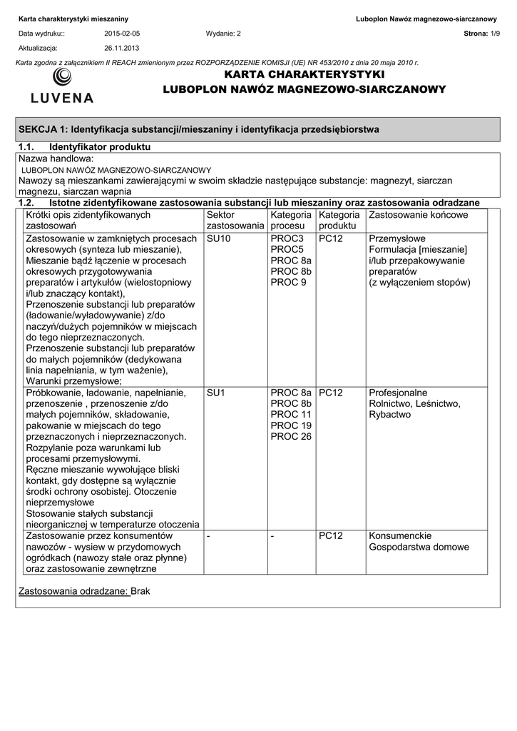 Luboplon Nawóz magnezowo-siarczanowy Karta charakterystyki mieszaniny Data wydruku:: 2015-02-05 Aktualizacja: 26.11.2013 Wydanie: 2 Strona: 1/9 Karta zgodna z załącznikiem II REACH zmienionym przez ROZPORZĄDZENIE KOMISJI (UE) NR 453/2010 z dnia 20 maja 2010 r. KARTA CHARAKTERYSTYKI LUBOPLON NAWÓZ MAGNEZOWO-SIARCZANOWY SEKCJA 1: Identyfikacja substancji/mieszaniny i identyfikacja przedsiębiorstwa 1.1. Identyfikator produktu Nazwa handlowa: LUBOPLON NAWÓZ MAGNEZOWO-SIARCZANOWY Nawozy są mieszankami zawierającymi w swoim składzie następujące substancje: magnezyt, siarczan magnezu, siarczan wapnia 1.2. Istotne zidentyfikowane zastosowania substancji lub mieszaniny oraz zastosowania odradzane Krótki opis zidentyfikowanych Sektor Kategoria Kategoria Zastosowanie końcowe zastosowań zastosowania procesu produktu Zastosowanie w zamkniętych procesach SU10 PROC3 PC12 Przemysłowe okresowych (synteza lub mieszanie), PROC5 Formulacja [mieszanie] Mieszanie bądź łączenie w procesach PROC 8a i/lub przepakowywanie okresowych przygotowywania PROC 8b preparatów preparatów i artykułów (wielostopniowy PROC 9 (z wyłączeniem stopów) i/lub znaczący kontakt), Przenoszenie substancji lub preparatów (ładowanie/wyładowywanie) z/do naczyń/dużych pojemników w miejscach do tego nieprzeznaczonych. Przenoszenie substancji lub preparatów do małych pojemników (dedykowana linia napełniania, w tym ważenie), Warunki przemysłowe; Próbkowanie, ładowanie, napełnianie, SU1 PROC 8a PC12 Profesjonalne przenoszenie , przenoszenie z/do PROC 8b Rolnictwo, Leśnictwo, małych pojemników, składowanie, PROC 11 Rybactwo pakowanie w miejscach do tego PROC 19 przeznaczonych i nieprzeznaczonych. PROC 26 Rozpylanie poza warunkami lub procesami przemysłowymi. Ręczne mieszanie wywołujące bliski kontakt, gdy dostępne są wyłącznie środki ochrony osobistej. Otoczenie nieprzemysłowe Stosowanie stałych substancji nieorganicznej w temperaturze otoczenia Zastosowanie przez konsumentów PC12 Konsumenckie nawozów - wysiew w przydomowych Gospodarstwa domowe ogródkach (nawozy stałe oraz płynne) oraz zastosowanie zewnętrzne Zastosowania odradzane: Brak Luboplon Nawóz magnezowo-siarczanowy Karta charakterystyki mieszaniny Data wydruku:: 2015-02-05 Aktualizacja: 26.11.2013 Strona: 2/9 Wydanie: 2 Karta zgodna z załącznikiem II REACH zmienionym przez ROZPORZĄDZENIE KOMISJI (UE) NR 453/2010 z dnia 20 maja 2010 r. 1.3. Dane dotyczące dostawcy karty charakterystyki LUVENA S.A ul. Romana Maya 1 62-030 Luboń tel. (061) 8900100 fax.(061) 8900400 e-mail osoby odpowiedzialnej za sporządzenie niniejszej karty: [email protected] 1.4. Numer telefonu alarmowego Ośrodki toksykologiczne Gdańsk 058 3492831 Kraków 012 6471105;012 6831134;012 6831300 Lublin 081 7408983 Poznań 061 8476946 0618481011 w.265 Rzeszów 017 866 4406 Sosnowiec 032 2661145;032 2660885 w.130 Tarnów 014 6299588 Warszawa 022 6190897;022 6196654 Wrocław 071 3433008; 071 3427021;071 7890214 SEKCJA 2: Identyfikacja zagrożeń 2.1. Klasyfikacja substancji lub mieszaniny wg Dyrektywy 67/548/EWG wg Rozporządzenia WE nr 1272/2008 (CLP) Mieszanina/preparat nie jest klasyfikowany jako stwarzająca zagrożenie/ niebezpieczny 2.2. Elementy oznakowania Piktogram: Brak Hasło ostrzegawcze: Brak Identyfikator: Brak Zwroty określające rodzaj zagrożenia: Brak Zwroty wskazujące środki ostrożności: P102 Chronić przed dziećmi P 260 Nie wdychać pyłu P280 Stosować rękawice ochronne/odzież ochronną/ochronę oczu P305+P351+P338 W PRZYPADKU DOSTANIA SIĘ DO OCZU: Ostrożnie płukać wodą przez kilka minut. Wyjąć soczewki kontaktowe, jeżeli są i można je łatwo usunąć. 2.3. Inne zagrożenia Mieszanina związków nieorganicznych w związku z tym nie oceniana jako PBT i vPvB. SEKCJA 3: Skład/informacje o składnikach 3.1. Substancje Nie dotyczy-karta charakterystyki mieszaniny 3.2. Mieszaniny Mieszanina zawiera w swoim składzie substancje nie stwarzające zagrożenia dla zdrowia środowiska:, siarczan magnezu, siarczan wapnia i magnezyt. Mieszanina zawiera następujące składniki mogące tworzyć pyły: Siarczan magnezu Stężenie: 32-37% Numery identyfikacyjne: Nr CAS Nr WE Nr indeksowy 7487-88-9 231-298-2 Nazwa IUPAC : siarczan magnezu - Luboplon Nawóz magnezowo-siarczanowy Karta charakterystyki mieszaniny Data wydruku:: 2015-02-05 Aktualizacja: 26.11.2013 Strona: 3/9 Wydanie: 2 Karta zgodna z załącznikiem II REACH zmienionym przez ROZPORZĄDZENIE KOMISJI (UE) NR 453/2010 z dnia 20 maja 2010 r. Wzór chemiczny: MgSO4 Nr rejestracji : 01-2119486789-11-xxxx Klasyfikacja: wg Dyrektywy 67/548/EWG wg Rozporządzenia WE nr 1272/2008 (CLP) odnosi się do 100% substancji odnosi się do 100% substancji Nie jest klasyfikowana jako niebezpieczna/stwarzająca zagrożenie substancja Siarczan wapnia Stężenie: ok. 4,5 % Numery identyfikacyjne: Nr CAS 7778-18-9 Nr WE 231-900-3 Nr indeksowy - Nazwa IUPAC : siarczan wapnia Wzór chemiczny: CaSO4 Nr rejestracji : 01-2119444918-26-xxxx Klasyfikacja: wg Dyrektywy 67/548/EWG wg Rozporządzenia WE nr 1272/2008 (CLP) odnosi się do 100% substancji odnosi się do 100% substancji Nie jest klasyfikowana jako niebezpieczna/stwarzająca zagrożenie substancja Magnezyt (węglan magnezu) Typ substancji: kopalina Stężenie: ok. 50-53% Numery identyfikacyjne: Nr CAS Nr WE 235-192-7 12125-28-9 Nr indeksowy - Nazwa chemiczna: węglan wapniowo-magnezowy Nr rejestracji: nie dotyczy -kopalina Klasyfikacja: wg Dyrektywy 67/548/EWG odnosi się do 100% substancji wg Rozporządzenia WE nr 1272/2008 (CLP) odnosi się do 100% substancji Nie jest klasyfikowana jako niebezpieczna/stwarzająca zagrożenie substancja SEKCJA 4: Środki pierwszej pomocy 4.1. Opis środków pierwszej pomocy 4.1.1. Wdychanie. Jeżeli wystąpią niepożądane objawy (np. zawroty głowy, senność oraz podrażnienie układu oddechowego) wynieść poszkodowanego ze skażonego środowiska na świeże powietrze, Jeżeli osoba nie oddycha, zastoso