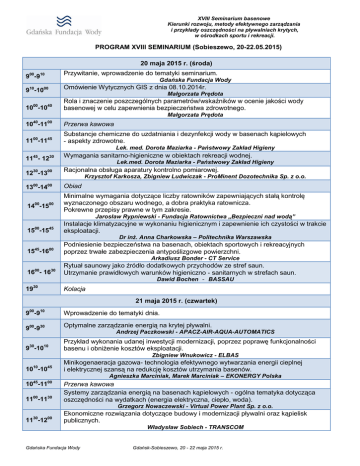 XVIII Seminarium basenowe Kierunki rozwoju, metody efektywnego zarządzania i przykłady oszczędności na pływalniach krytych, w ośrodkach sportu i rekreacji. PROGRAM XVIII SEMINARIUM (Sobieszewo, 20-22.05.2015) 20 maja 2015 r. (środa) Przywitanie, wprowadzenie do tematyki seminarium. 900-910 Gdańska Fundacja Wody Omówienie Wytycznych GIS z dnia 08.10.2014r. 910-1000 Małgorzata Prędota 1000-1040 Rola i znaczenie poszczególnych parametrów/wskaźników w ocenie jakości wody basenowej w celu zapewnienia bezpieczeństwa zdrowotnego. Małgorzata Prędota 40 00 10 -11 Przerwa kawowa 1100-1145 Substancje chemiczne do uzdatniania i dezynfekcji wody w basenach kąpielowych - aspekty zdrowotne. Lek. med. Dorota Maziarka - Państwowy Zakład Higieny 1145- 1230 30 12 -13 00 Wymagania sanitarno-higieniczne w obiektach rekreacji wodnej. Lek.med. Dorota Maziarka - Państwowy Zakład Higieny Racjonalna obsługa aparatury kontrolno pomiarowej. Krzysztof Karkosza, Zbigniew Ludwiczak - ProMinent Dozotechnika Sp. z o.o. 1300-1400 00 00 14 -15 Obiad Minimalne wymagania dotyczące liczby ratowników zapewniających stałą kontrolę wyznaczonego obszaru wodnego, a dobra praktyka ratownicza. Pokrewne przepisy prawne w tym zakresie. Jarosław Rypniewski - Fundacja Ratownictwa „Bezpieczni nad wodą” 1500-1545 Instalacje klimatyzacyjne w wykonaniu higienicznym i zapewnienie ich czystości w trakcie eksploatacji. 1545-1600 Podniesienie bezpieczeństwa na basenach, obiektach sportowych i rekreacyjnych poprzez trwałe zabezpieczenia antypoślizgowe powierzchni. 1600- 1630 Rytuał saunowy jako źródło dodatkowych przychodów ze stref saun. Utrzymanie prawidłowych warunków higieniczno - sanitarnych w strefach saun. Dr inż. Anna Charkowska – Politechnika Warszawska Arkadiusz Bonder - CT Service Dawid Bochen - BASSAU 30 19 Kolacja 21 maja 2015 r. (czwartek) 900-910 Wprowadzenie do tematyki dnia. Optymalne zarządzanie energią na krytej pływalni. 900-930 Andrzej Paczkowski - APACZ-AIR-AQUA-AUTOMATICS 930-1010 Przykład wykonania udanej inwestycji modernizacji, poprzez poprawę funkcjonalności basenu i obniżenie kosztów eksploatacji. 1010-1045 Minikogenaeracja gazowa- technologia efektywnego wytwarzania energii cieplnej i elektrycznej szansą na redukcję kosztów utrzymania basenów. Zbigniew Wnukowicz - ELBAS Agnieszka Marciniak, Marek Marciniak – EKONERGY Polska 45 10 -11 00 1100-1130 Przerwa kawowa Systemy zarządzania energią na basenach kąpielowych - ogólna tematyka dotycząca oszczędności na wydatkach (energia elektryczna, ciepło, woda). 1130-1200 Ekonomiczne rozwiązania dotyczące budowy i modernizacji pływalni oraz kąpielisk publicznych. Grzegorz Nowaczewski - Virtual Power Plant Sp. z o.o. Władysław Sobiech - TRANSCOM Gdańska Fundacja Wody Gdańsk-Sobieszewo, 20 - 22 maja 2015 r. XVIII Seminarium basenowe Kierunki rozwoju, metody efektywnego zarządzania i przykłady oszczędności na pływalniach krytych, w ośrodkach sportu i rekreacji. 1200-1300 00 00 13 -14 1400-1430 30 Przykłady korzystnego zarządzania obiektami sportu i rekreacji. Bożena Matusiak - OSIR Wołomin Obiad Zastosowanie destryfikatorów powietrza w aquaparku – przykład udanej modernizacji. Mateusz Bartczak – Asfi-Arius 15 Paweł Ślęzak - MOSIR Kutno 14 -15 1530 Wyjazd do Centrum Solidarności w Gdańsku. 1900 Powrót do hotelu Orle 22 maja 2015 r. (piątek) 900-910 Wprowadzenie do tematyki dnia 910-1000 Fakty i mity ustawy prawo zamówień publicznych w praktyce budowy i remontów pływalni. Anita Stellmaszyk - Tarnowskie Termy Sp. z o.o. 00 10 -11 Kierunki rozwoju systemów ESOK: karty lojalnościowe, rezerwacja internetowa, digital signage, automatyzacja procesów, biometria. Możliwości i koszty przejścia na nowoczesny ESOK. . 00 Andrzej Dąbrowski, Maciej Bąk – TT Soft Sp. z o.o. 1100- 1115 Przerwa kawowa 1115-1230 Konflikty prawne na tle korzystania z pływalni krytych: obowiązek pieczy nad mieniem użytkownika pływalni. zarzut dyskryminacji użytkowników pływalni niedopuszczonych do korzystania z usług. zarzut obrazy moralności publicznej. uszczerbek na zdrowiu użytkownika pływalni wywołany nienależytą jakością usług lub stanem pływalni. uszczerbek na zdrowiu użytkownika pływalni wywołany zachowaniami innych użytkowników. Michał Behnke - Kancelaria Radców Prawnych CiC 30 45 12 - 12 Dyskusja podsumowanie seminarium. 1300 Obiad Gdańska Fundacja Wody zastrzega możliwość niewielkich zmian programu seminarium. Gdańska Fundacja Wody Gdańsk-Sobieszewo, 20 - 22 maja 2015 r.