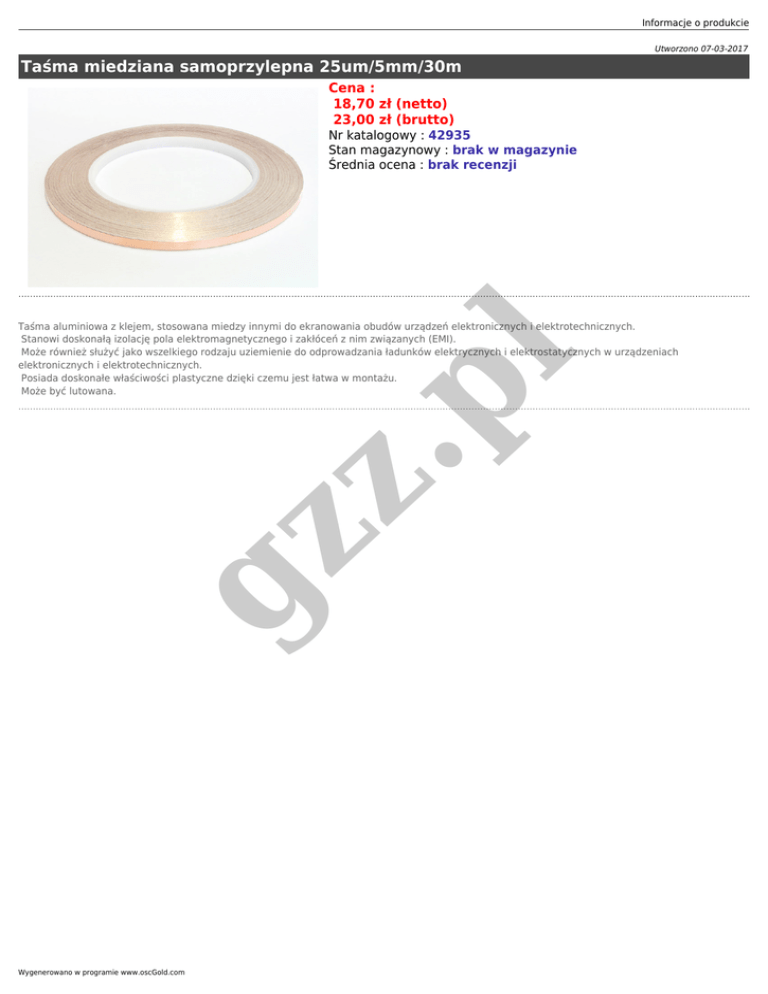 Informacje o produkcie Utworzono 07-03-2017 Taśma miedziana samoprzylepna 25um/5mm/30m Cena : 18,70 zł (netto) 23,00 zł (brutto) Nr katalogowy : 42935 Stan magazynowy : brak w magazynie Średnia ocena : brak recenzji gz z .p l Taśma aluminiowa z klejem, stosowana miedzy innymi do ekranowania obudów urządzeń elektronicznych i elektrotechnicznych. Stanowi doskonałą izolację pola elektromagnetycznego i zakłóceń z nim związanych (EMI). Może również służyć jako wszelkiego rodzaju uziemienie do odprowadzania ładunków elektrycznych i elektrostatycznych w urządzeniach elektronicznych i elektrotechnicznych. Posiada doskonałe właściwości plastyczne dzięki czemu jest łatwa w montażu. Może być lutowana. Wygenerowano w programie www.oscGold.com