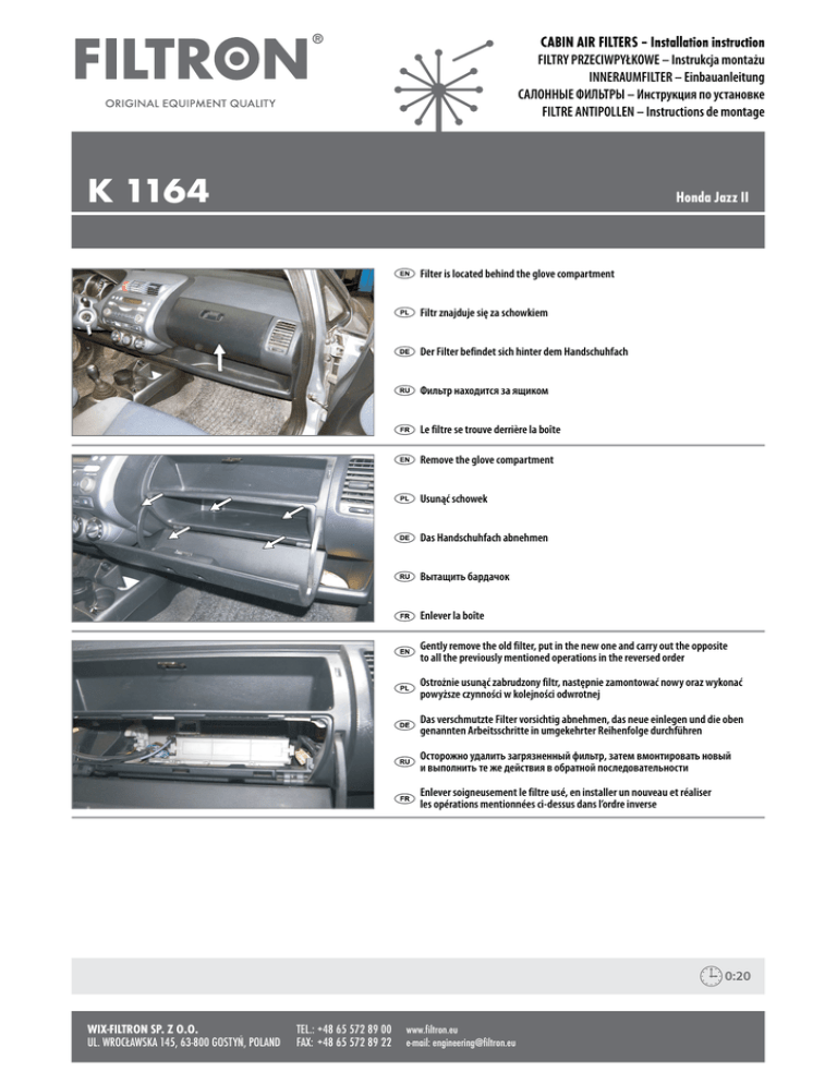 CABIN AIR FILTERS – Installation instruction FILTRY PRZECIWPYŁKOWE – Instrukcja montażu INNERAUMFILTER – Einbauanleitung САЛОННЫЕ ФИЛЬТРЫ – Инструкция по установке FILTRE ANTIPOLLEN – Instructions de montage K 1164 Honda Jazz II Filter is located behind the glove compartment Filtr znajduje się za schowkiem Der Filter befindet sich hinter dem Handschuhfach Фильтр находится за ящиком Le filtre se trouve derrière la boîte Remove the glove compartment Usunąć schowek Das Handschuhfach abnehmen Вытащить бардачок Enlever la boîte Gently remove the old filter, put in the new one and carry out the opposite to all the previously mentioned operations in the reversed order Ostrożnie usunąć zabrudzony filtr, następnie zamontować nowy oraz wykonać powyższe czynności w kolejności odwrotnej Das verschmutzte Filter vorsichtig abnehmen, das neue einlegen und die oben genannten Arbeitsschritte in umgekehrter Reihenfolge durchführen Осторожно удалить загрязненный фильтр, затем вмонтировать новый и выполнить те же действия в обратной последовательности Enlever soigneusement le filtre usé, en installer un nouveau et réaliser les opérations mentionnées ci-dessus dans l’ordre inverse 0:20 WIX-FILTRON SP. Z O.O. TEL.:+48 65 572 89 00 www.filtron.eu UL. WROCŁAWSKA 145, 63-800 GOSTYŃ, POLAND FAX: +48 65 572 89 22 e-mail: [email protected]