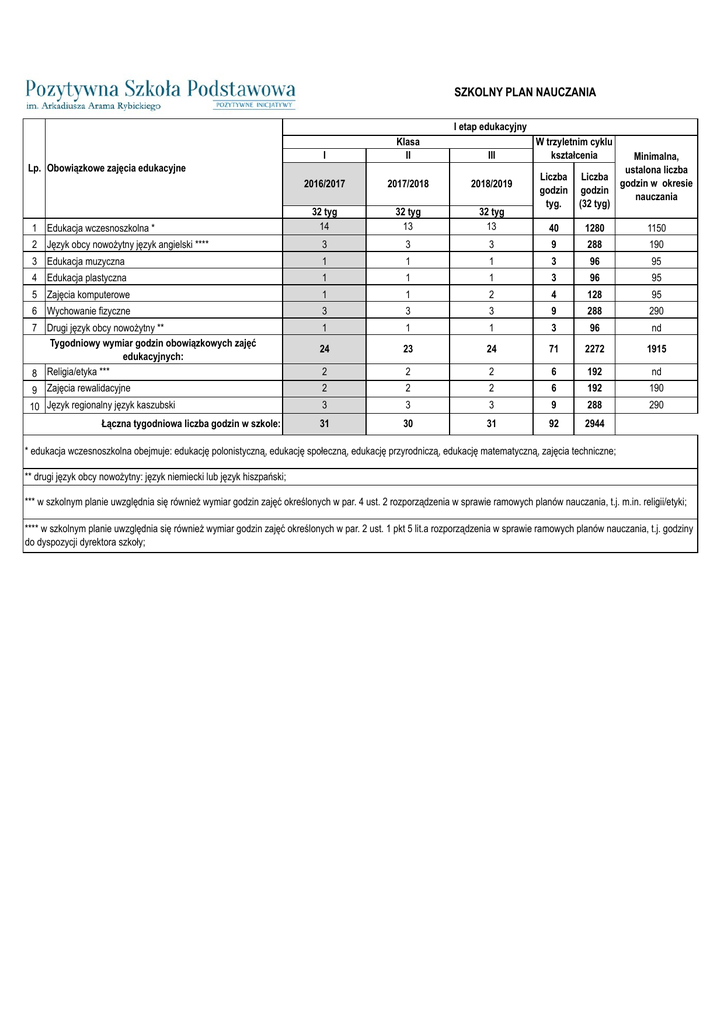 SZKOLNY PLAN NAUCZANIA I etap edukacyjny I Klasa II III 2016/2017 2017/2018 2018/2019 32 tyg 14 32 tyg 13 32 tyg 13 2 Język obcy nowożytny język angielski **** 3 3 3 Edukacja muzyczna 1 1 4 Edukacja plastyczna 1 5 Zajęcia komputerowe 6 Wychowanie fizyczne 7 Drugi język obcy nowożytny ** Tygodniowy wymiar godzin obowiązkowych zajęć edukacyjnych: 8 Religia/etyka *** Lp. Obowiązkowe zajęcia edukacyjne 1 Edukacja wczesnoszkolna * 9 Zajęcia rewalidacyjne 10 Język regionalny język kaszubski Łączna tygodniowa liczba godzin w szkole: W trzyletnim cyklu kształcenia Minimalna, ustalona liczba godzin w okresie nauczania Liczba godzin tyg. Liczba godzin (32 tyg) 40 1280 1150 3 9 288 190 1 3 96 95 1 1 3 96 95 1 1 2 4 128 95 3 3 3 9 288 290 1 1 1 3 96 nd 24 23 24 71 2272 1915 2 2 2 6 192 nd 2 2 2 6 192 190 290 3 3 3 9 288 31 30 31 92 2944 * edukacja wczesnoszkolna obejmuje: edukację polonistyczną, edukację społeczną, edukację przyrodniczą, edukację matematyczną, zajęcia techniczne; ** drugi język obcy nowożytny: język niemiecki lub język hiszpański; *** w szkolnym planie uwzględnia się również wymiar godzin zajęć określonych w par. 4 ust. 2 rozporządzenia w sprawie ramowych planów nauczania, t.j. m.in. religii/etyki; **** w szkolnym planie uwzględnia się również wymiar godzin zajęć określonych w par. 2 ust. 1 pkt 5 lit.a rozporządzenia w sprawie ramowych planów nauczania, t.j. godziny do dyspozycji dyrektora szkoły;