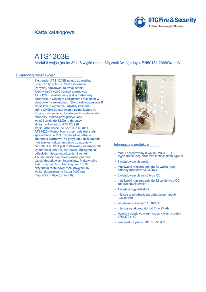 Karta katalogowa ATS1203E Moduł 8 wejść (maks.32) i 8 wyjść (maks.32),zasil.3A,zgodny z EN50131:2009Grade3 Ekspandery wejść i wyjść Ekspander ATS 1203E należy do rodziny urządzeń typu MZD (Moduł Zbierania Danych), służących do zwiększania ilości wejść i wyjść centrali alarmowej. ATS 1203E dostarczany jest w metalowej obudowie, z własnym zasilaczem i miejscem w obudowie na akumulator. Standardowo posiada 8 wejść linii, 8 wyjść typu otwarty kolektor i jedno wyjście do sterowania sygnalizatorem. Poprzez wstawianie dodatkowych modułów do obudowy, można powiększyć ilość wejść i wyjść do 32.Do rozbudowy służą moduły wejść ATS1202 (8 wejść) oraz wyjść (ATS1810, ATS1811, ATS1820). Komunikacja z centralą jest stale sprawdzana, a MZD zapamiętuje ostanie zdarzenie alarmowe. W przypadku uszkodzenia możliwe jest odczytanie tego zdarzenia w centrali. ATS1201 jest instalowany na magistrali systemowej centrali alarmowej. Maksymalna odległość między urządzeniami wynosi 1,5 km i może być powiększona poprzez użycie dodatkowych interfejsów. Maksymalna ilość urządzeń typu MZD wynosi 15. W przypadku rozbudowy MZD powyżej 16 wejść, dopuszczalna liczba MZD ma magistrali maleje (do min.8). Informacja o produkcie E moduł adresowalny 8 wejść (maks.32) i 8 wyjść (maks.32), obudowa z zasilaczem typu M E 8 wbudowanych wejść E możliwość rozszerzenia do 32 wejść (przy pomocy modułów ATS1202) E 8 wbudowanych wyjść typu OC E możliwość rozszerzenia do 32 wyjść typu OC lub przekaźnikowych E 1 wyjście sygnalizatora E miejsce w obudowie na dodatkowe moduły rozszerzeń E wbudowany zasilacz 13.8V/3A E miejsce na akumulator od 7 do 27 Ah E wymiary obudowy w mm (szer. x wys. x głęb.): 475x370x160 E temperatura pracy: -10 do +55st.C ATS1203E Moduł 8 wejść (maks.32) i 8 wyjść (maks.32),zasil.3A,zgodny z EN50131:2009Grade3 Specyfikacja 13.8 VDC / 3 A (dostepne 2.9A) 75mA 8 - 32 230VAC, 50 Hz, 56 VA 8 32 tak 1.5 km 95% (bez kond.) 30 475x370x160 mm -10° do +55°C Napięcie zasilania Pobór prądu przez PCB Wejścia Zasilanie sieciowe Wyjścia typu OC Maksymalna liczba wyjść Dynamiczny test akumulatora Maksymalna odległość od centrali Wilgotność robocza IP Wymiary Temperatura pracy Jak zamawiać Kod produktu Opis ATS1203E Moduł 8 wejść (maks.32) i 8 wyjść (maks.32),w obudowie metalowej 475x370x160 mm, z zasilaczem 3A,zgodny z EN50131:2009Grade3 UTC Fire & Security zastrzega sobie prawo do zmian specyfikacji produktu bez uprzedzenia. Aktualne specyfikacje produktów można znaleźć na stronie www.gesecurity.pl lub kontaktując się z regionalnym przedstawicielem handlowym. IPS-PL-ATS1203E-2011-12-12 06:40:43 Released : 12-DEC-11